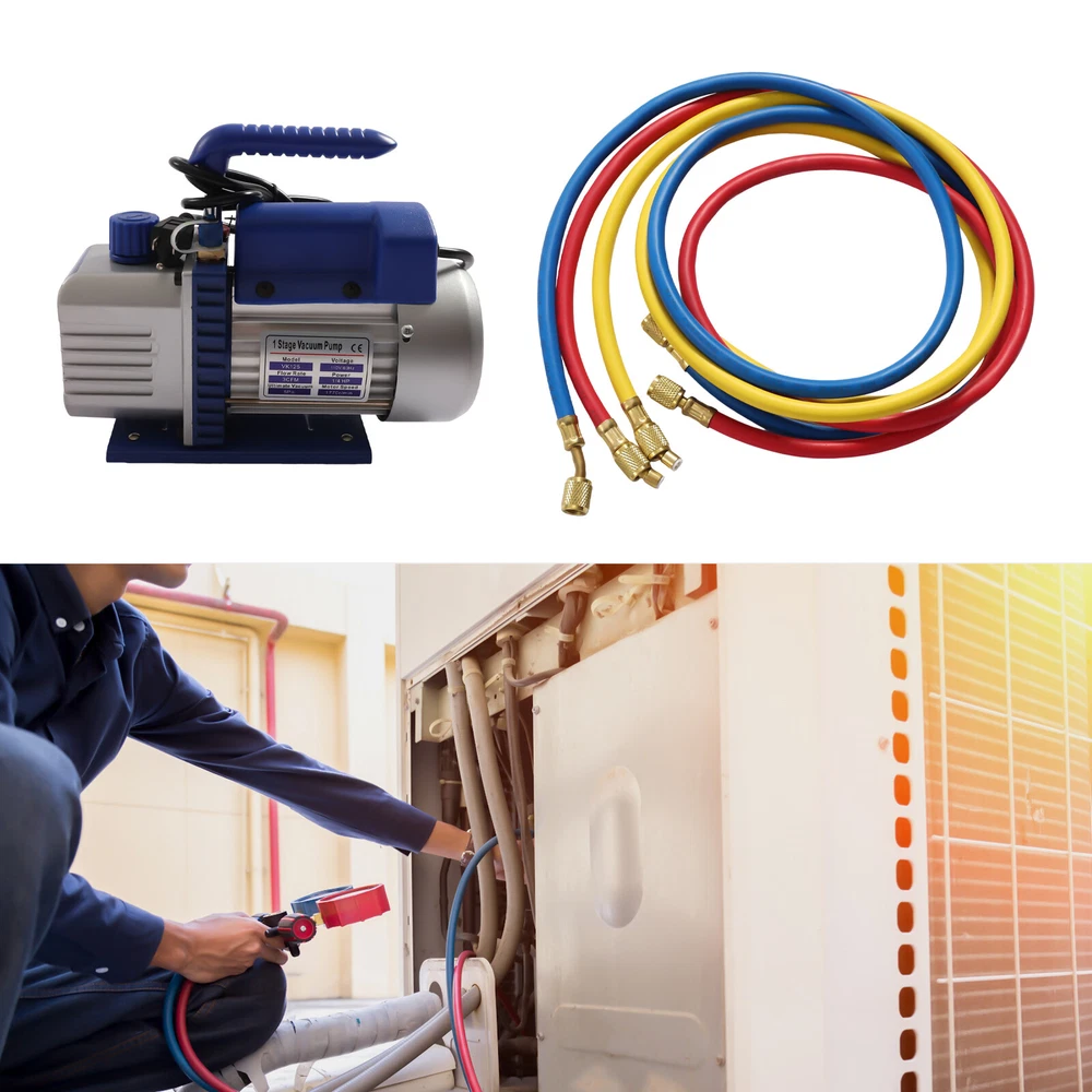 Package Included 1x Vacuum Pump 1x Manifold for Auto AC 3x 4ft Three Colors Hoses 1x Low-Pressure Quick Coupler 1x High-Pressure Quick Coupler 1xManifold Gauge 1xDrip Bottle 1x English Vacuum Pump Manual 1x English Manifold Manual Application It is suitable for the repair of automobile air conditioners, home air conditioners, split type air conditioners, etc. that fit R134a R410a and fit for 1/4" hose. Specification Vacuum Pump: Model: VK125 Material: Cast Iron Color: Blue Free Air Displacement(FAD): 1L/S(3cfm) Power: 1/4 HP Stage: 1 Plug Type: US Voltage/Frequency: 110V/60HZ Motor Power:180w Ultimate Vacuum: 150 microns/29.91Hg Noise: <65db Vacuum: 5kpa Flare Male: 1/4'' Acme Male: 1/2'' Oil Reservoir Capacity: 200ml/7.04oz Vacuum Pump Size: 26*11*24cm Description When your car air conditioner is not working anymore and you keep looking around for the right tool/equipment to repair it. Then you need this auto AC repair complete tool kit. It is designed for repairing your auto air conditioner and includes all the necessary tools to complete your project. With it, your AC repair job will not be tough and costly anymore, so it will be a shopping trip of a lifetime! Key Features Powerful Pumping Power : With a power of 180 watts and a pumping rate of 1L/S (3cfm), this vacuum pump has superb pumping power so that the vacuum level can reach 5kpa. Rejection of Impurities : The machine is equipped with an air filter to ensure the purity of air. Therefore, the extracted air is healthy and pollution-free . Selected Material : High-quality cast iron and classic bearings are used for smooth operation, durability and corrosion resistance , which makes it last longer. Easy to Use/Maintain : This vacuum pump is plug-and-play and comes with detailed instructions, saving you the trouble of drilling alone. It uses a one-piece pump body, which provides a higher vacuum level than traditional split pumps and is easier to maintain. Safe and Reliable : Our dedicated motor is CE certified and has a built-in overheating self-recovery fuse for thermal protection. When the temperature of the pump body is too high, it will automatically cut off the power. Pure Copper Motor : Adopting a high-quality copper wire motor, with low power, low-temperature rise and high energy efficiency ratio, it can provide long-term, stable and efficient operation of the vacuum pump. Low Noise : The pure copper motor and the equipped silencer make its operation noise less than 65 decibels, providing you with a quiet working environment. Compact Structure : The size of this vacuum pump is 10.24*4.33*9.45inch, which is compact and will not take up too much space and is easy to store when not in use. Strong Heat Dissipation : The machine has a built-in high-capacity cooling fan, which can dissipate the heat generated when the motor is running in time and further maintain the stable performance of the machine. Complete Kit : We have made a package according to your usage requirements. The package contains 10 complete accessories such as a vacuum pump, manifold, manifold measuring instrument, etc. Therefore, you can use it quickly. Details Oil Observation Window : The oil observation window allows you to monitor the amount and the quality of oil to prevent oil shortage. Oil Discharge Valve : Located at the bottom of the oil reservoir, it is angled for faster and more complete discharge. Oil Filling Port : It makes adding oil easy because the oil filling port can be accessed from the front or any side. Portable Carrying Handle : The vacuum pump comes with a portable carrying handle, which is convenient for you to use and carry. Application It is suitable for the repair of automobile air conditioners, home air conditioners, split type air conditioners, etc. that fit R134a R410a and fit for 1/4" hose. Specification Vacuum Pump : Model: VK125 Material: Cast Iron Color: Blue Free Air Displacement(FAD): 1L/S(3cfm) Power: 1/4 HP Stage: 1 Plug Type: US Voltage/Frequency: 110V/60HZ Motor Power:180w Ultimate Vacuum: 150 microns/29.91Hg Noise: <65db Vacuum: 5kpa Flare Male: 1/4'' Acme Male: 1/2'' Oil Reservoir Capacity: 200ml/7.04oz Vacuum Pump Size: 26*11*24cm/10.24*4.33*9.45inch Manifold : Gauge Diameter: 7cm/2.75" Gauge Class: 1.6 Pressure: 800-4000psi (800 Operating Pressure, 4000 Burst Pressure) Manifold Fitting and Hoses: 0.64cm/1/4" Hose: Red, Yellow, and Blue 0.64cm/1/4" 1.2m/4ft Length Each Package Size: 34*33*20cm/13.39*12.99*7.87in Gross Weight: 8kg/17.78lbs Package Included 1x Vacuum Pump 1x Manifold for Auto AC 3x 4ft Three Colors Hoses 1x Low-Pressure Quick Coupler 1x High-Pressure Quick Coupler 1x Manifold Gauge 1x Drip Bottle 1x English Vacuum Pump Manual 1x English Manifold Manual Notes 1. Please read the user manual carefully before use and pay special attention to the safety precautions included. 2. Please allow the slight color difference caused by the shooting light and 1-3cm error due to manual measurement, and make sure you do not mind before you place the order. On Mar 2, 2025 at 22:00:32 PST, seller added the following information: