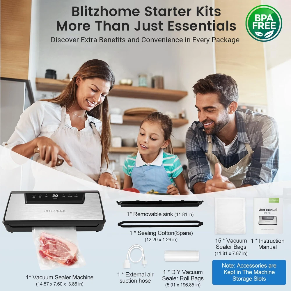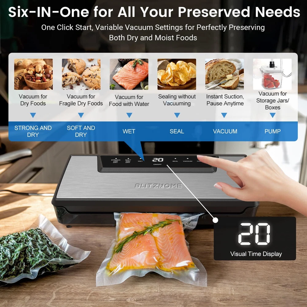 【Preserve Freshness 8x Longer】With a robust 85kPa suction, it seals tightly. The 3mm sealing width provides wider, more secure seals, eliminating the risk of air leakage. Enhanced by a sponge sealing gasket and heating wire, it ensures superior sealing performance, extending food freshness 8X longer than conventional storage. Your food will still taste fresh, flavorful, and remain freezer-burn free 【Versatile 6-in-1 Automatic Functions】Fully one-click automated with 6 functions of our Vacuum Sealer, catering to diverse food storage needs. Choose between "Dry&Wet" and "Strong&Soft" modes based on food types. Exclusive "SEAL" for vacuum-free sealing. Manually control the vacuum pressure with "VACUUM." Utilize the included vacuum tube for efficient suction of canisters, jars, or wine bottles with “PUMP" 【Efficient vacuum sealing】features a 130W Dual-Pump motor for quick, powerful sealing, supporting 70 consecutive seals. It only takes 20-30S to complete the food vacuum sealing process, the built-in screen displays time providing a clear and intuitive indication of the process duration.The 11.81in sealing bar is compatible with most bags, enabling simultaneous sealing of multiple bags 【Convenient Built-in Cutter and Automatic Magnetic Lid】The built-in cutter of our Vacuum Sealer facilitates the effortless customization of bag sizes to accommodate anything you wish to seal.With an automatic magnetic lid, a simple one-handed press securely locks, ensuring a tight and consistent seal without the need for two-handed operation. All functions can be effortlessly operated with just one hand 【Easy to Store and Clean】Vacuum Sealer includes built-in storage for rolls and bags, providing convenient storage. The 11.8-inch width offers ample space for external tubes, power cords, and vacuum bags. With a detachable drip tray that is dishwasher-friendly, cleaning is a breeze. The machine's smooth surface allows for easy wiping, ensuring instant cleanliness 【Fully Starter Kits】1* External air suction hose, 15 * Vacuum Sealer Bags, 1*DIY Vacuum Sealer Roll Bags, 1*Removable sink, 1*Vacuum Sealer Machine, 1*Sealing Cotton(spare), 1* User Manual, Contains anti-heat adhesive, safe to prevent scalding, lifelong customer service. Choose for a worry-free experience backed by our commitment to your satisfaction