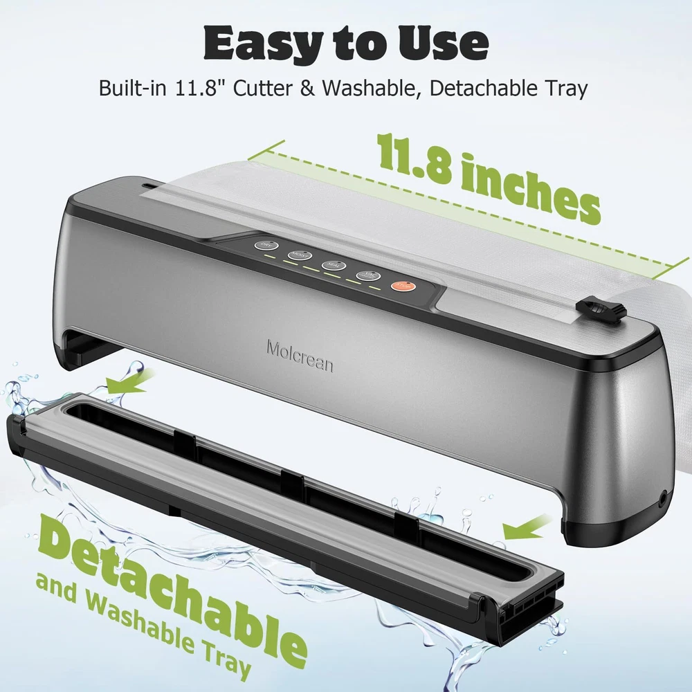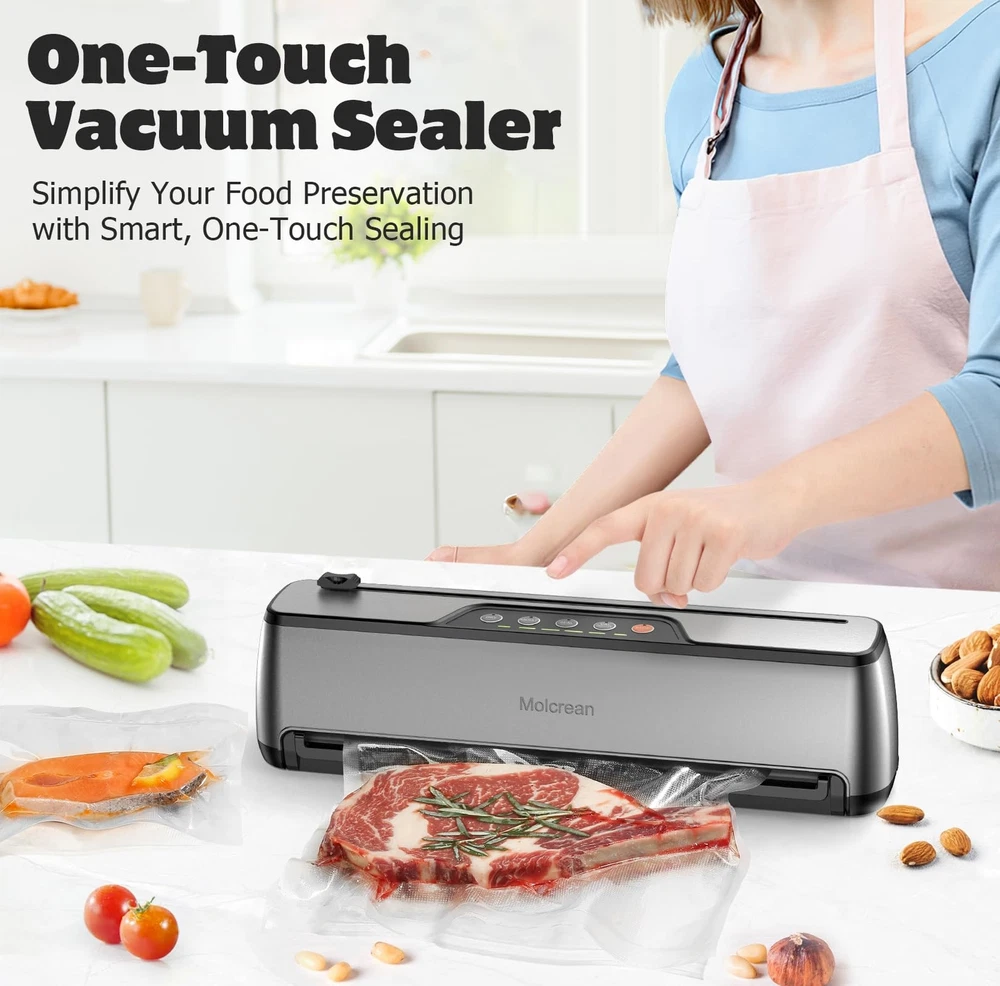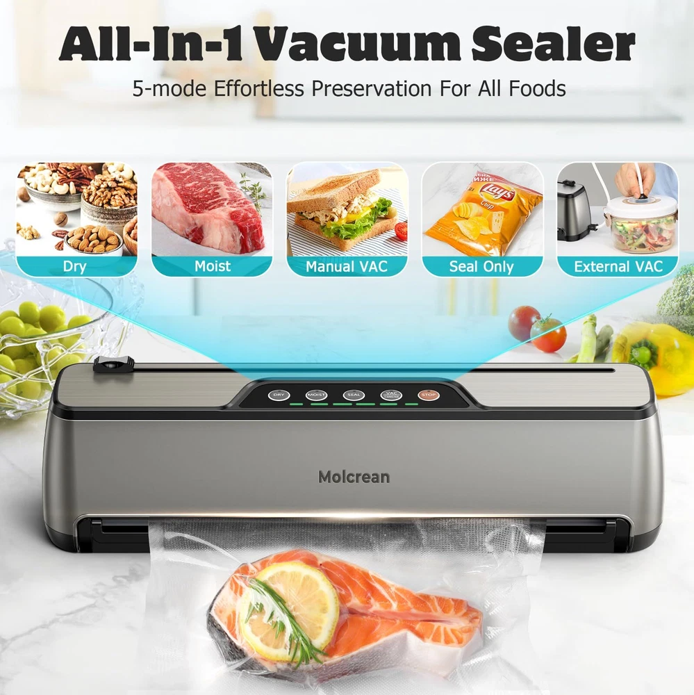 Food Vacuum Sealer: Features a one-touch fully automatic operation and a compact design, making it a true space saver in your kitchen. Constructed from durable stainless steel and ABS, it boasts an impressive 85kPa suction, sealing with a 5mm width for a tight and secure seal, making our appliance the best companion for your sous vide cooker and food dehydrator. It offers 5 preset modes for various food types, functioning as an efficient food processor, and includes an 11.8’’ built-in cutter for flexible bag sizing. Easy to clean with a detachable drip tray, it comes with 15 pre-cut bags and a suction hose. Choose , simplify your food preservation tasks with our best food sealer, and seal a meal effortlessly. 【ENJOY FRESHNESS AND SAVE MONEY】: Featuring 5 specialized modes to meet any food preservation needs and keep food fresh up to 10 times longer, Dry & Moist — ideal for a wide range of foods from grains, fruits, and vegetables to meats; Seal Only — effortlessly reseals half-empty chip bags; Manual Vacuum — offers precise control for delicate items; Canister Mode — perfect for marinating and pickling. 【QUICK & SECURE SEALING EVERY TIME】: With 135 watts of power, 85KPA suction, and a 12-inch long enhanced seal strip, our vacuum sealer machine ensures a fast and secure seal every time.This food vacuum sealer is truly the ultimate food saver. 【INTUITIVE ONE TOUCH OPERATION】: Simply place the vacuum bag into the food vacuum sealer, select the mode based on your food type, and press the button. That’s it—sealing your food is that simple! Say goodbye to manual hassle. Try it out and add to cart now. 【CONVENIENT FEATURES & READY-TO-USE KIT】: Features an 11.8-inch built-in cutter and a washable, detachable tray for easy cleanup. Includes 15 pre-cut bags (7.8” x 9.8”) and an external suction hose, providing everything needed to start sealing immediately. 【ULTRA COMPACT & SOLID DESIGN】: At just 2.2 inches at its thinnest, this vacuum sealer machine optimizes kitchen space without compromising quality. Crafted from premium stainless steel and high-grade ABS, it's built to last. 【Professional Customer Support】: Enjoy a 1-year warranty, 30-day free returns, and lifetime technical support. We promise to resolve any issue within 48 hours. We truly value our customers and are committed to ensuring your satisfaction.