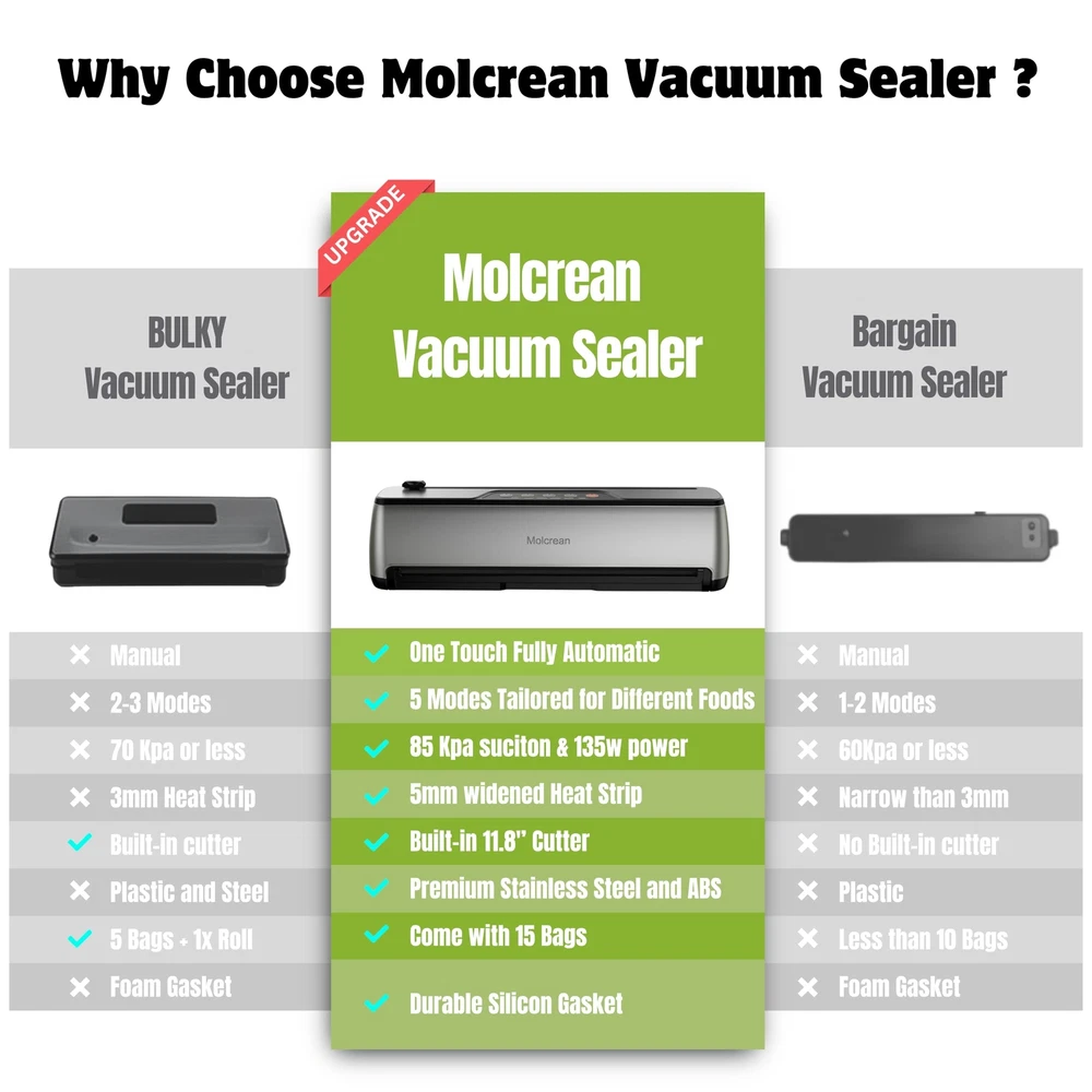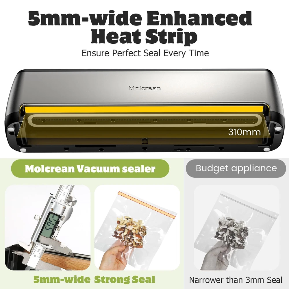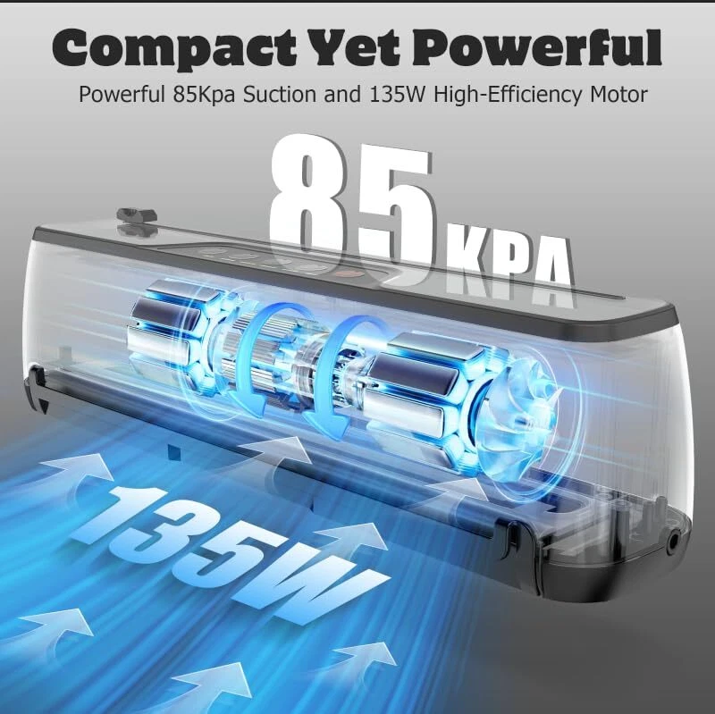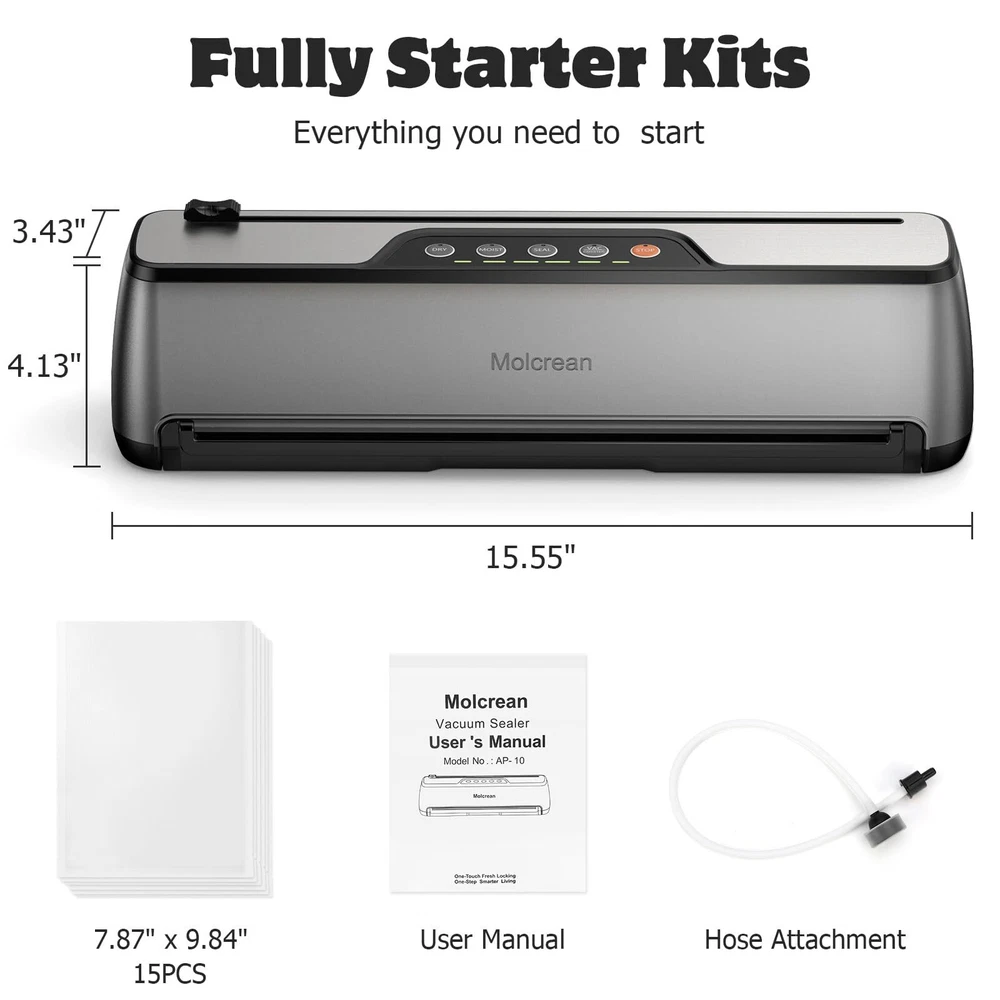 Food Vacuum Sealer: Features a one-touch fully automatic operation and a compact design, making it a true space saver in your kitchen. Constructed from durable stainless steel and ABS, it boasts an impressive 85kPa suction, sealing with a 5mm width for a tight and secure seal, making our appliance the best companion for your sous vide cooker and food dehydrator. It offers 5 preset modes for various food types, functioning as an efficient food processor, and includes an 11.8’’ built-in cutter for flexible bag sizing. Easy to clean with a detachable drip tray, it comes with 15 pre-cut bags and a suction hose. Choose , simplify your food preservation tasks with our best food sealer, and seal a meal effortlessly. 【ENJOY FRESHNESS AND SAVE MONEY】: Featuring 5 specialized modes to meet any food preservation needs and keep food fresh up to 10 times longer, Dry & Moist — ideal for a wide range of foods from grains, fruits, and vegetables to meats; Seal Only — effortlessly reseals half-empty chip bags; Manual Vacuum — offers precise control for delicate items; Canister Mode — perfect for marinating and pickling. 【QUICK & SECURE SEALING EVERY TIME】: With 135 watts of power, 85KPA suction, and a 12-inch long enhanced seal strip, our vacuum sealer machine ensures a fast and secure seal every time.This food vacuum sealer is truly the ultimate food saver. 【INTUITIVE ONE TOUCH OPERATION】: Simply place the vacuum bag into the food vacuum sealer, select the mode based on your food type, and press the button. That’s it—sealing your food is that simple! Say goodbye to manual hassle. Try it out and add to cart now. 【CONVENIENT FEATURES & READY-TO-USE KIT】: Features an 11.8-inch built-in cutter and a washable, detachable tray for easy cleanup. Includes 15 pre-cut bags (7.8” x 9.8”) and an external suction hose, providing everything needed to start sealing immediately. 【ULTRA COMPACT & SOLID DESIGN】: At just 2.2 inches at its thinnest, this vacuum sealer machine optimizes kitchen space without compromising quality. Crafted from premium stainless steel and high-grade ABS, it's built to last. 【Professional Customer Support】: Enjoy a 1-year warranty, 30-day free returns, and lifetime technical support. We promise to resolve any issue within 48 hours. We truly value our customers and are committed to ensuring your satisfaction.
