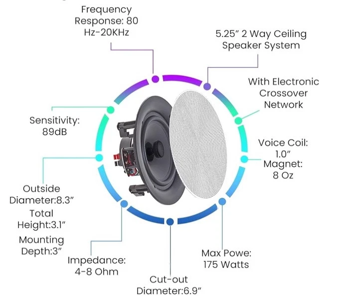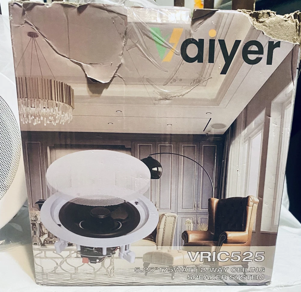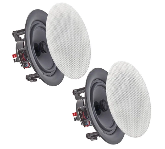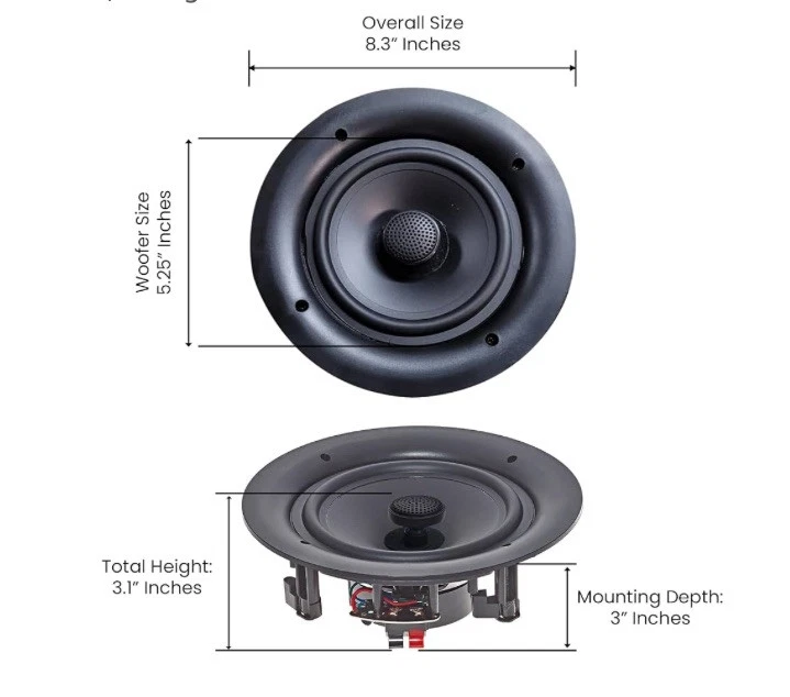 The Vaiyer Set of Two Framed Wall Speakers is a high-end 2.0 channel home theater entertainment system with Dolby Digital surround sound. These 2 compact round speakers have a sleek design, white color, and are made of metal. They have a driver size of 5.25 inches and a total RMS power of 200W. The unit includes audio inputs for Digital Coaxial RCA and Digital Optical TOSLINK, and is compatible with universal brands and models. White Framed Wall Speakers Home Enhance Your Sound Experience: Elevate your audio with our Vaiyer 5.25 Inch Ceiling Speakers, offering versatile installation options for in-wall or in-ceiling use. These 2-way mid bass woofer speakers provide exceptional sound quality. Powerful 175 Watts: Our in-wall speaker system is engineered for peak performance, delivering a robust 175 watts of power. The heavy-duty voice coil ensures impressive sound clarity and extended product lifespan. Sleek Flush Mount Design: With convenient push-type speaker terminals, our speakers are a breeze to install. The seamless flush mount design seamlessly integrates into your space, providing a clean and modern aesthetic. Seamless Integration: Whether you're upgrading your home theater system or customizing your sound experience, our 2-way in-ceiling or in-wall speaker system delivers crisp audio clarity whenever you desire. Easy Installation: We've made installation a cinch with the included 6.9" diameter cut-out template and 3" mounting depth. The product also includes all necessary mounting hardware for precise application.