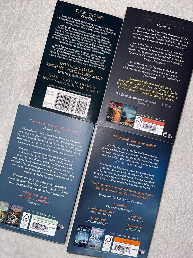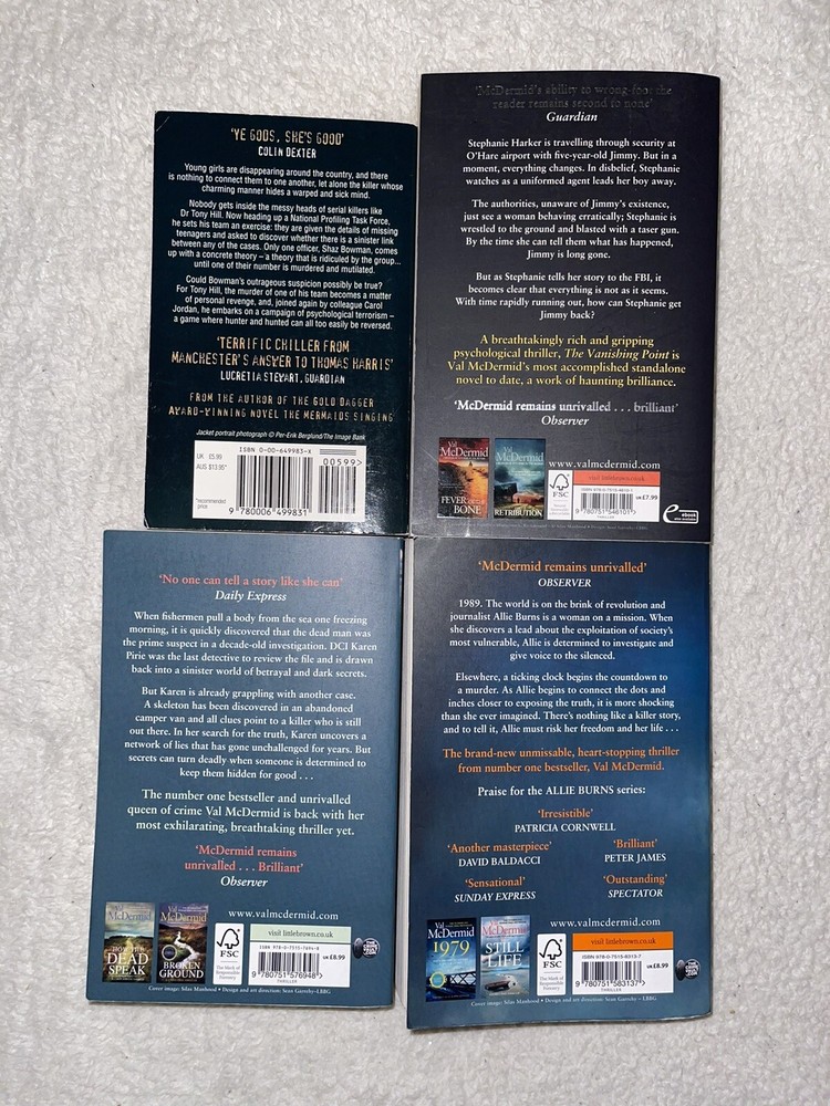 Dive into the gripping world of crime and suspense with this exclusive Val McDermid Book Bundle. Comprising four thrilling novels, this collection is a must-have for fans of psychological mystery and gripping thriller narratives. Each paperback book delivers a nail-biting storyline crafted by the acclaimed author Val McDermid, known for her intricate plots and compelling characters. This bundle is an ideal gift set or a treasured addition to any bookshelf, providing a selection of stories that will keep readers enthralled from start to finish. Published by HarperCollins and delivered in English, these novels reflect the quality and excitement that McDermid's fans have come to expect. Enjoy the convenience of free postage and add this collection of crime and thriller masterpieces to your literary collection today. NOTE : I label most if not all my book bundles as ‘ACCEPTABLE’, this is purely because everyone’s expectations can vary. So you’ll likely receive in most if not all cases ‘GOOD’ condition. Please follow me as a seller to get coupons and updates on future PS.. I have lots of bundles available from mixed authors and genres. If you need anything please don’t hesitate to get in touch. Thank you as always for your business and support.