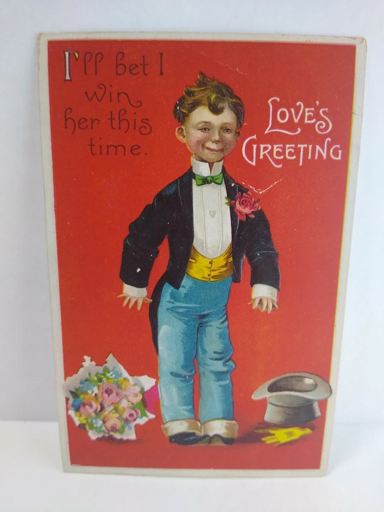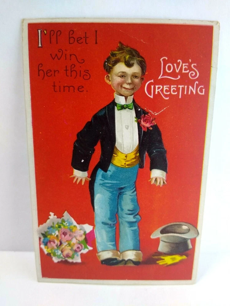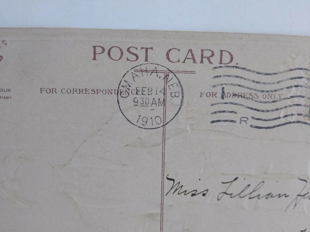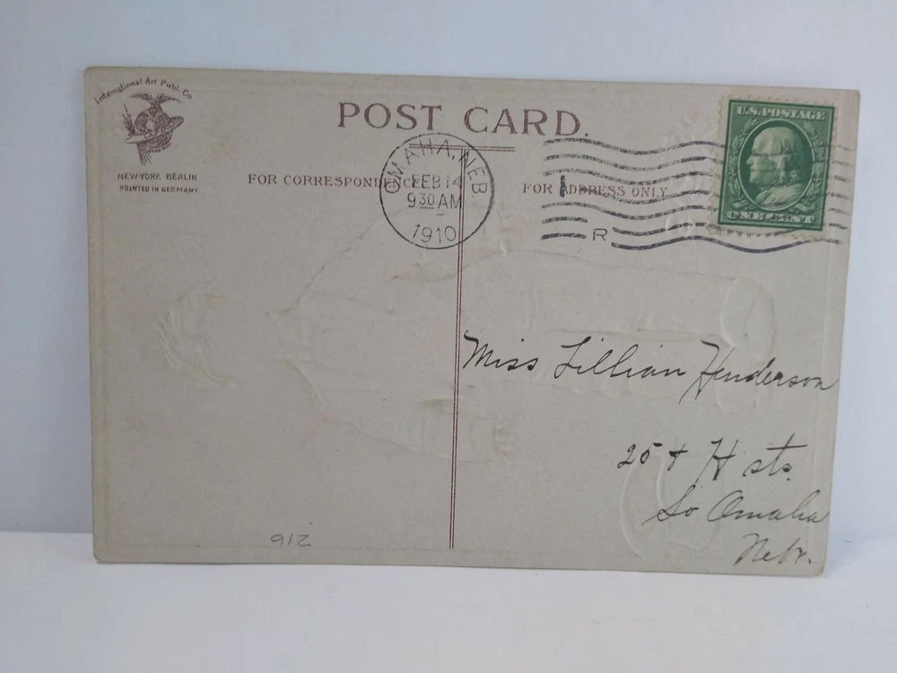 Antique original vintage embossed post card. Unsigned artist Ellen Clapsaddle with International Arts logo on back. Has top creases and age wear. Writing on back. Posted with 1910 Omaha, Nebraska cancel and stamp. Stock #val10. Additional vintage Halloween, Santa, Christmas, holiday postcards, are in our store. SHIPPING Bundle and save by using cart and making single payment. International buyers are responsible for any import fees/taxes. ABOUT US Seller of vintage ephemera, collectibles, retro gifts, advertising, artwork, vinyl records, pinball and arcade game flyers and parts, Mad magazines, antique Halloween & holiday postcards, Christmas items, super hero memorabilia, horror themed art, fun stuff. MORE POSTCARDS AND EPHEMERA IN OUR STORE.
