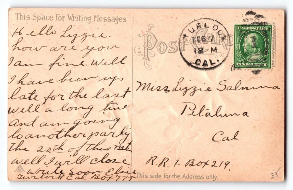 Posted with cancel and stamp. Antique original vintage post card. Has corner dings, and age wear. Stock #VAL159. Additional postcards are in our store. All post cards are old originals and may or may not have writing on back. Bundle and save by using cart and making single payment.