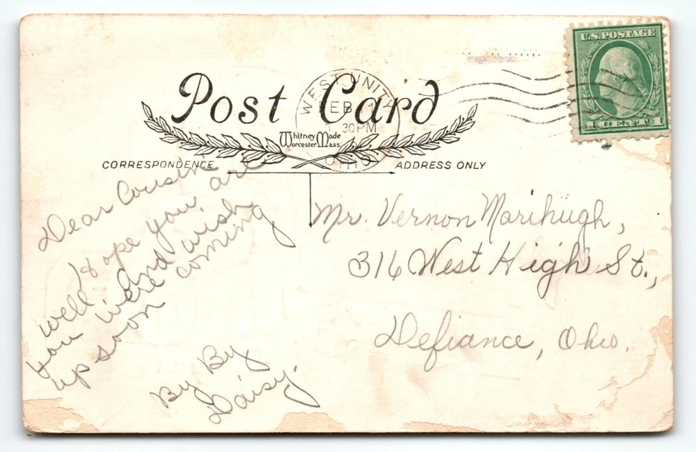 Posted with cancel and stamp. Antique original vintage post card. Has creases, corner dings, and age wear. Stock #val68. Additional postcards are in our store. All post cards are old originals and may or may not have writing on back. Bundle and save by using cart and making single payment.