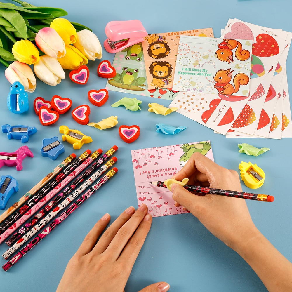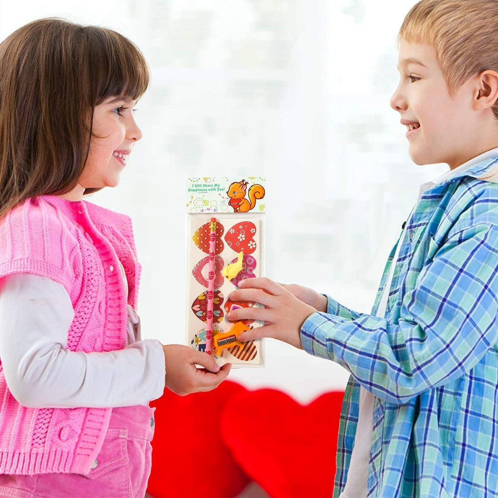 šSuper value kids valentines gifts set - 28 Packs, 590 PCS IN TOTAL! Each Pack of Valentineās Stationery includes 16 Patterns Valentine's heart stickers, 1 Valentineās pencil, 1 Valentine's card, 1 big red heart-shaped eraser, 1 pen sharpener, 1 pen holder! Besides, the package comes with a pink stapler and a box of staples, you could pack a great gift set by own. šSuper Good Quality Safe for Kids: All accessories included are made with premium BPA-free material, useful and durable. Cute heart shape erasers and colorful-printed pencils can be stationery for kids' daily school study. šCute Valentines Day Cards for Kids - This 28 pack of V-day Cards allows you to pick your favorite animal patterns design for your favorite person in the classroom. Comes with a 28 pack Valentine's gifts set, all you need is a pen to fill out a sweet message. šExtra Bonus - There are 28 pen holders in the package, which helps correct the child's pen holding posture. Surprise your friends by sending out such a unique Valentine's gift! šPerfect Valentines Cards Gifts for Kids classroom - There's no denying that love should be equally expressed on Valentine's Day. These Kids Valentine cards pencils sets are perfect for school valentines! Product Description With or without flowers and chocolate, cards are the perfect way to show your partner how much they mean to you with a touching message that will become a keepsake for years to come. Want to avoid a handmade card fail? Dreading the thought of helping your child write the names of all twenty classmates on those tiny Valentines? Looking for a way to get creative with your kid's Valentines without subjecting yourself to hot glue burns? Alternatively ā go for something funny. We've got you covered. 28 Packs Valentineās Day Cards Gift Sets For Kids - Will Be a Popular Hit In Any Classroom! WOW! Super Cute Kids Valentines Day Cards Stationery Set Comes in Pack! ļ·So you can easily send a card to all of your family members and friends. ļ·If your little sweetie pie is obsessed with hearts ā specifically Valentines stickers and pencils ā this valentines gifts pack will get some serious giggles. 28 Pack of Valentine Favors for Kids - 590 PCS in Total, 21PCS for Each Pack! 28 Kids Valentines days cardsļ¼28 PCSļ¼ 28 Valentines-themed pencilsļ¼28 PCSļ¼ 28 Set hearts erasers (28 PCS) 28 Pen sharpeners (28 PCS) 28pcs Pen Holders (28 PCS) 28 Pack * 16 Valentines stickers ( 448 PCS) 1 Stapling Machine (1 PCS) 1 Box of Staples (1 PCS) Write it Down and Send It Out! In Valentine's Days past, you once dutifully crafted hundreds of handmade cards as a student in school. Making and sharing Valentine's Day cards is still a cherished tradition. Kids will have a fun time with these Valentines cards and pencils set at school, handing them out to friends and crushes. All you need is a pen to fill out a sweet message! You donāt have to stop with just your sweetheart. Moms, dads, sister, kids, grandparents, nieces and nephews. Everyone appreciates a sweet card, especially if itās unexpected. Instead of just giving a plain card, your kids can give a whole lot of fun to their friends and classmates. This Valentineās gifts Set is fun for kids and also works well accompanying a present.