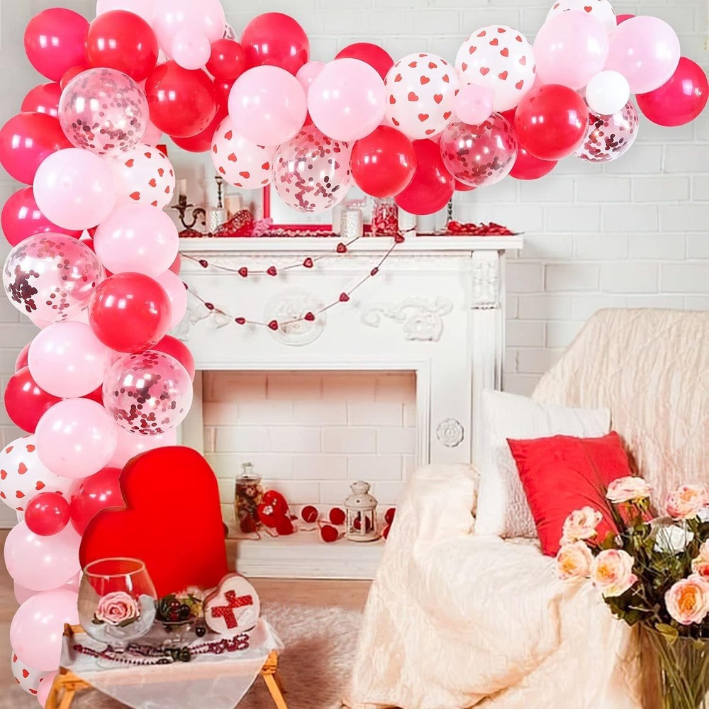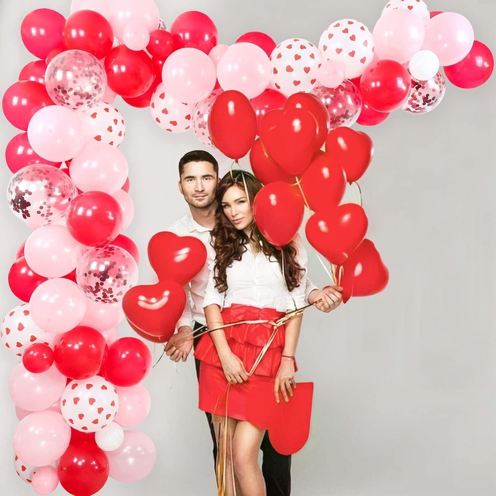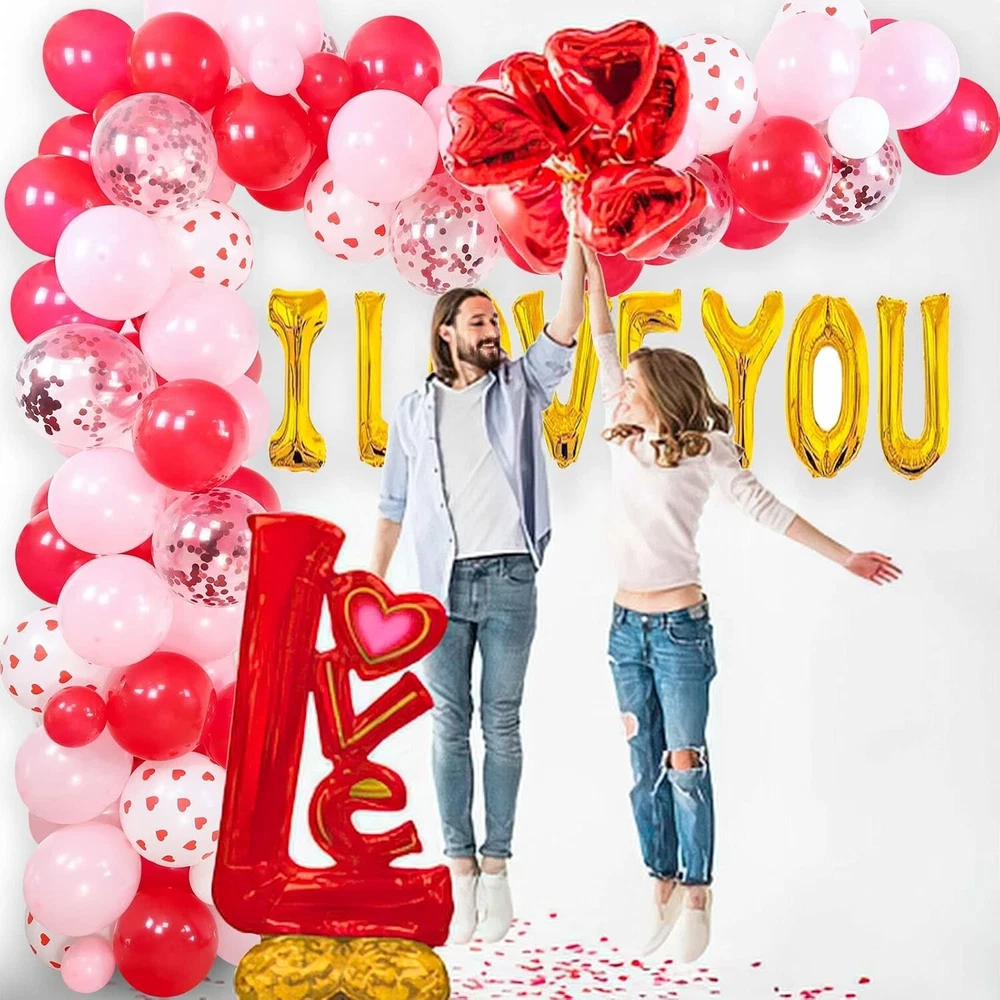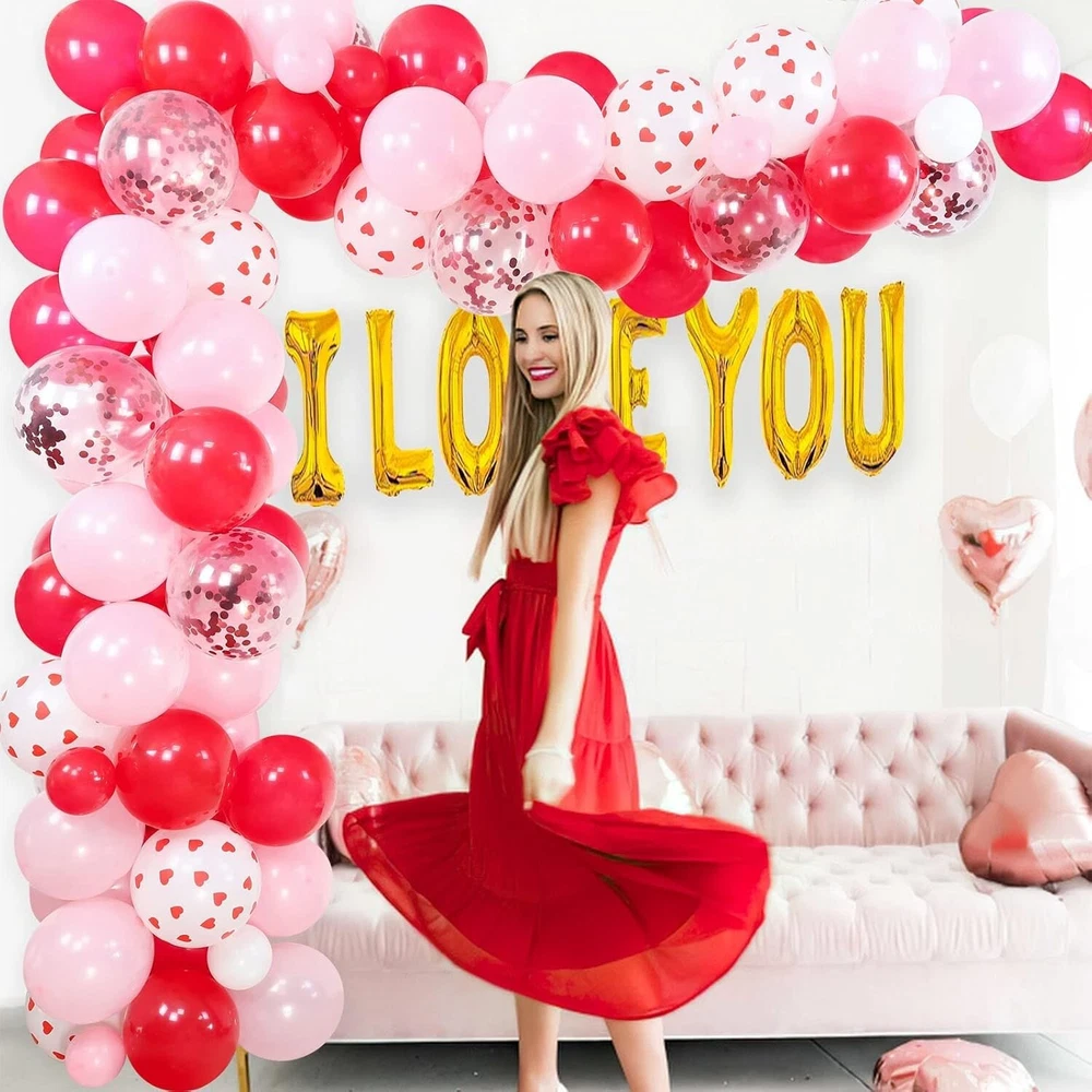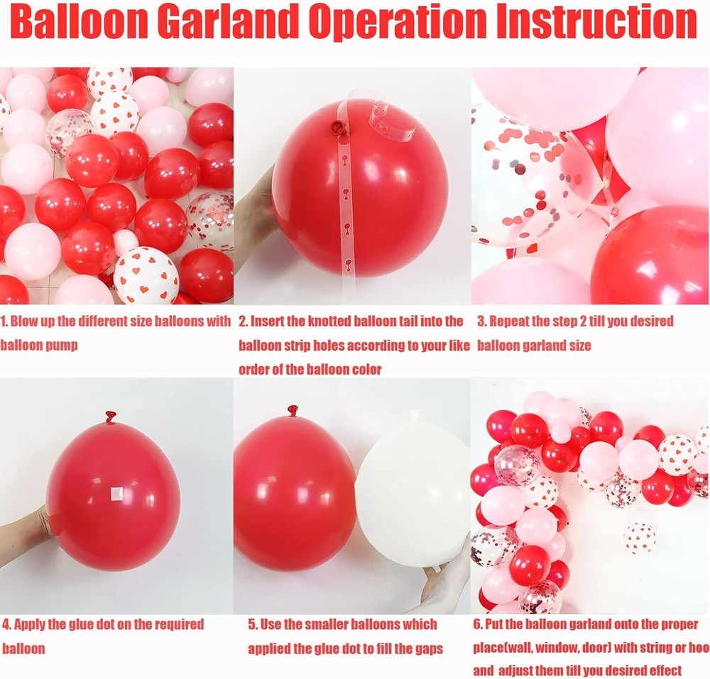 Valuable Valentine's Day Decorations -- Totally 129pcs items, including 60pcs 10 inch red pink latex balloons, 30pcs 5" red pink white latex balloons, 15pcs 12 inch red heart print balloons, 8pcs 12" red cofetti balloons, 10pcs 10" red heart foil balloons, 1 set 16" I LOVE YOU golden foil balloons, 300pcs silk rose petals, 1 roll 16ft balloon arch strip, 1 roll glue. Wonderful Valentines Decorations -- With our these nice bright color party decorations accessories, you can freely make various types of balloon arch garland to create wonderful romantic atmosphere and leave a deep impression on your lover. Great Valentine's Day Party Supplies -- Our sweet valentines balloon arch garland will be the perfect choice for you to decorate your home, bed room, hall, shopping mall, cafe, passageway, indoor or outdoor for Valentine's Day or Mother's Day, romantic party, proposal, galentines day decorations and more. No doubt is each one a great decoration. Easy to Assemble -- Making your own backdrop has never been easier! The balloon garland is surprisingly simple to build, no craft experience needed. Highly recommended filled balloons with air by electric air pump, it would save you lots of time to enjoy your sweet moment. Tips for You -- Please do not inflate latex balloons and foil balloons too full, 85% is fine. And at the same time, please inflate slowly to avoid over inflation.