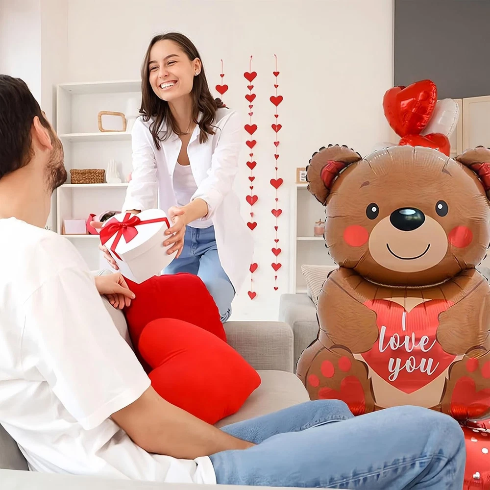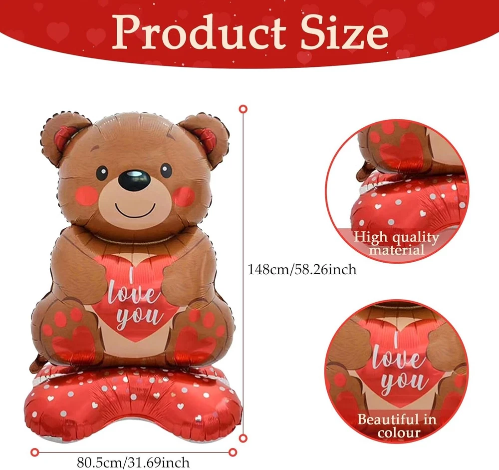 "Valentines Day Bear Balloon, 58in x 31in Standing Balloon for Party Decoration About this item: Adorable Bear Design: The standing balloon features a cute brown bear with a red heart on its belly, along with the "Love You" lettering, creating a romantic and playful atmosphere perfect for Valentine's Day parties, dates, or weddings. Easy Setup: The unique standing design eliminates the need for traditional balloon stands. Simply inflate to complete the shape, making it quick and easy to set up and saving time and effort for any event. Safe and Sturdy: Made from high-quality foil material, these balloons are durable and stable, maintaining their beautiful appearance for an extended period. Ideal for both indoor and outdoor settings. Double Heart Shaped Base: The two heart-shaped bases provide added stability while enhancing the romantic vibe, making this balloon arrangement the perfect decoration for weddings and Valentine's Day celebrations. Great for Any Setting: With a size of 58 inches x 31 inches x 31 inches, this standing balloon is ideal for a variety of events. It works beautifully as a standalone decoration or complements other Valentine's or wedding decor effortlessly.