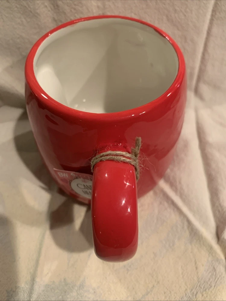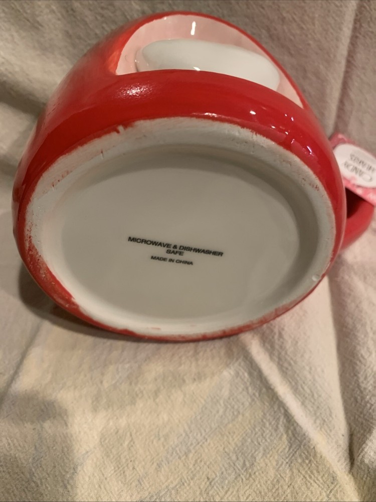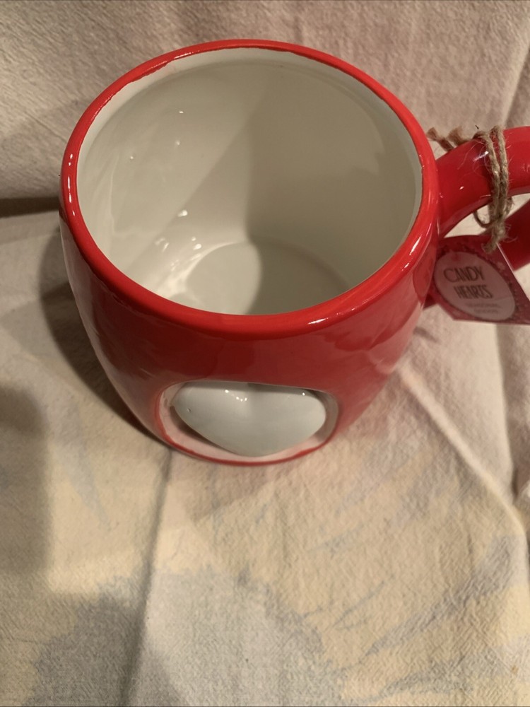 This beautiful mug is perfect for any occasion, whether you're drinking hot or cold beverages. Its unique heart shape and red color make it a great addition to your collection. The design is hand-painted and features the Candy Hearts franchise. Made of high-quality ceramic and porcelain, this mug is both microwave and dishwasher safe. It has a handle and can hold up to 20oz of your favorite drink. Its size is medium, with a height of 4 inches and a width of 3.5 inches. This original, art deco style mug is sure to impress your guests.