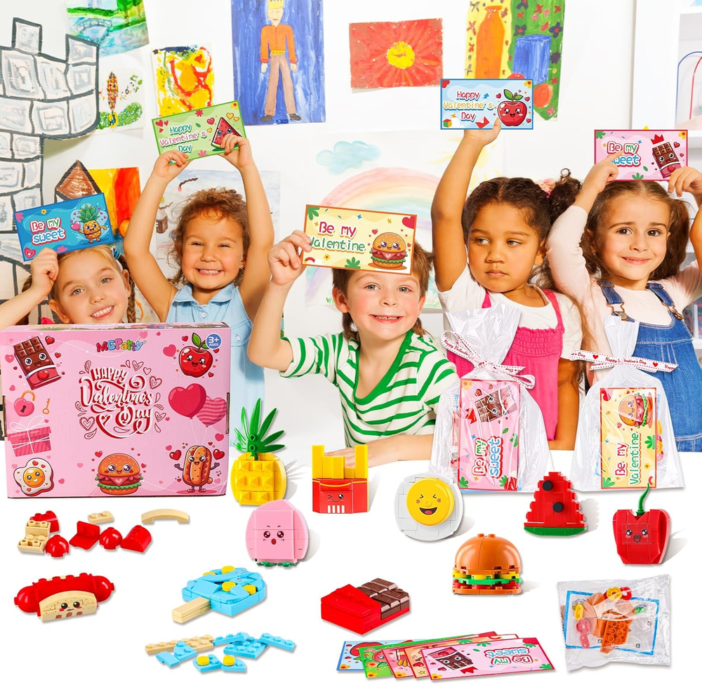 Valentine's Day Party Favors Set: Includes 30 adorable building blocks shaped like hamburgers, chocolates, French fries, hot dogs, steamed eggs, ice cream, peaches, pineapples, watermelons, and apples, perfect for kids' Valentine's Day themed parties. Accompanied by Valentine's Cards and Transparent Bags: Valentine's building blocks set comes with 30 Valentine's cards and 30 transparent bags, allowing your little ones to easily share these fun blocks and cards as gifts. Fun Classroom Activities for Valentine's Day: Kids can unleash their creativity by assembling the blocks, enjoying hands-on fun while developing teamwork and communication skills. Suitable for Multiple Occasions: Ideal for use in classrooms, Valentine's Day parties, birthday celebrations, and holiday events, making it the perfect small gift for classmates and friends. Safe Materials for Family Fun: All Valentine's blocks are made from safe and eco-friendly materials, ensuring children's health and safety, and are suitable for interactive games that parents can enjoy with their kids. Product Description MGparty 30PCS Valentines Day Gifts for Kids Classroom-Valentines Building Blocks Valentines Day Gifts,Valentines For Kids Classroom Valentines Cards For Kids Classroom,Valentine's Day Gift Kids Valentines Day Gifts For School,Valentines For Class Class Valentines Day Gifts For Kids,Valentines Day Gifts For Kids Classroom 30 Pack Valentine's Day Cards Building Block for Kids The video showcases the product in use. The video guides you through product setup. The video compares multiple products. The video shows the product being unpacked.