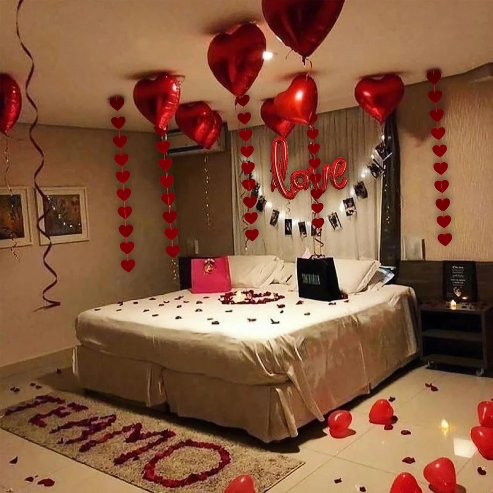 Perfect Decorations for Valentine's Day - This valentines day decorations kit inclueds (Red Felt Garland Hanging String Hearts, Latex heart balloons×20, foil heart balloons×10, Love balloon×1, Red Silk Rose Petals×1000). This valentines day decorations kit will make a unique and luxurious valentine's party High Quality Materials - Balloons are made of high quality with thick skin that won' t easily pop and are TRUE to their color. The latex allows the balloons to stretch very well when you inflate them. You don't need to worry about how long your balloon can last. You can tie the balloon where you want, or fill it with helium, tie it to a red ribbon and float it from the ceiling. It will be a romantic evening just for your love The Red Felt Garland Hanging String Hearts NO DIY - The garlands come pre-assembled and ready to hang, no assembly needed of buyer. You can cut it to any length and hang it anywhere Romantic Room Decoration - Romantic Room Decorations - On the floor, on the bed, in the bedroom, in a room full of balloons, so many romantic decorations for Valentine's Day to decorate your room. I'm sure your lover will squeal with surprise and hug you tightly when he enters the room decorated by your own hands 24-hours E-mail Response - If you have any problems about it; please contact us, We will provide the Warmest customer service Product Description This Valentine's Day set is suitable for indoor use, Great decorative heart garland for valentine’s day, wedding party, engagement party, bridal shower, baby shower, birthday party...add festive touch to your party.