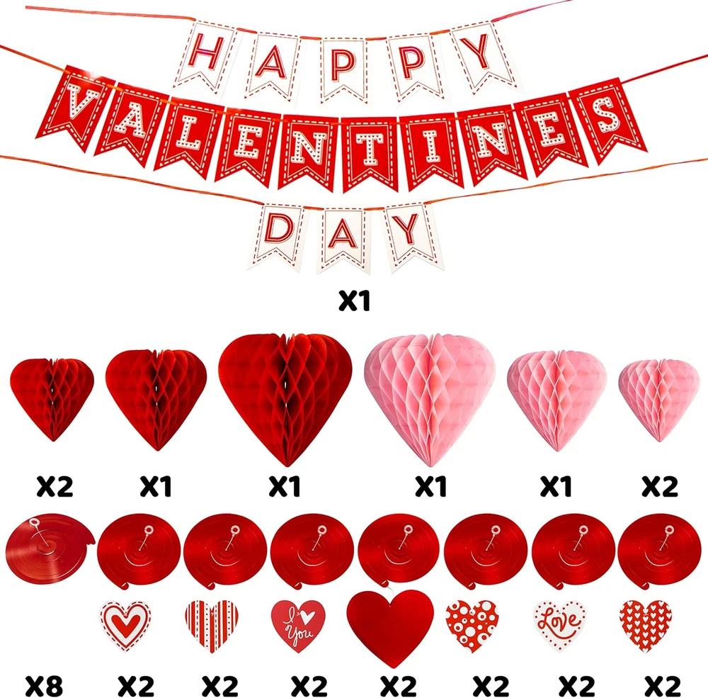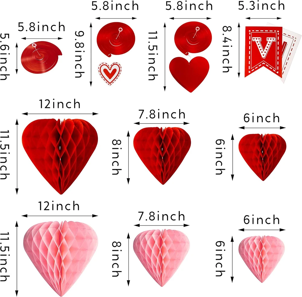 SUPER VALUE PACK. Pack included- Hanging Banner x 1, Red Heart Honeycomb Balls x 4, Pink Heart Honeycomb Balls x 4, Foil Swirls x 8, Foil Swirls with Heart Pendant x 14 ROMANTIC DESIGN. It is a must-have decoration if you would like to do something vivid to decorate your event, cater to the Valentine’s Day themed party and go well with other decorations to leave unforgettable memory for your love IDEAL GIFT. This decoration would look great on your window, mantle or wall or a lovely little present to give to your loved one. It can also be a perfect decoration for classroom parties, activities, family home decoration, indoor and outdoor decorations. PREMIUM QUALITY & SAFETY. Non-Toxic,safety test approved,paper clips make it easy to hold paper fans, they can be folded up for storage and used multiple times. EXCEPTIONAL CARE: We're big on the little things. That's why customer safety and satisfaction are at the heart of everything we do. Contact us if products don't meet your expectations. We look forward to ensuring every moment brings you joy. Product Description