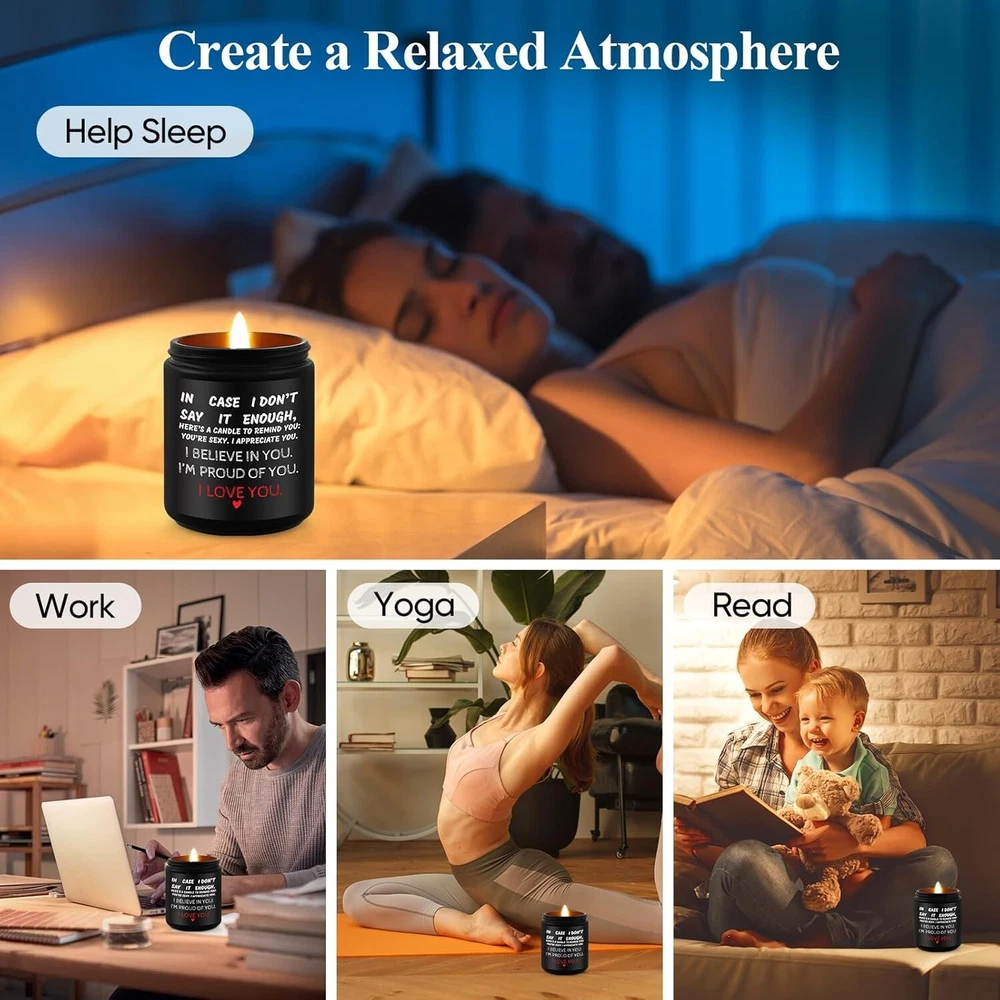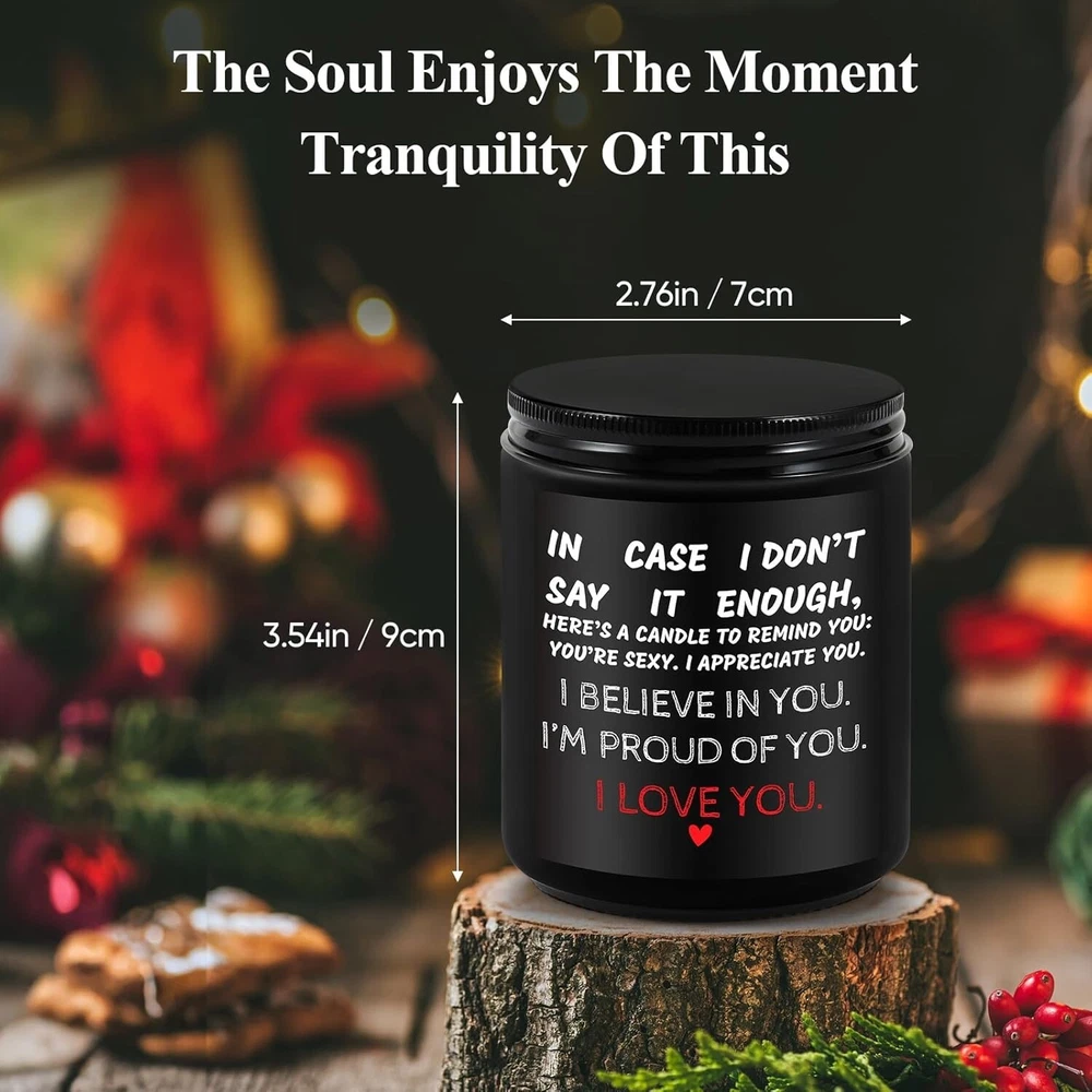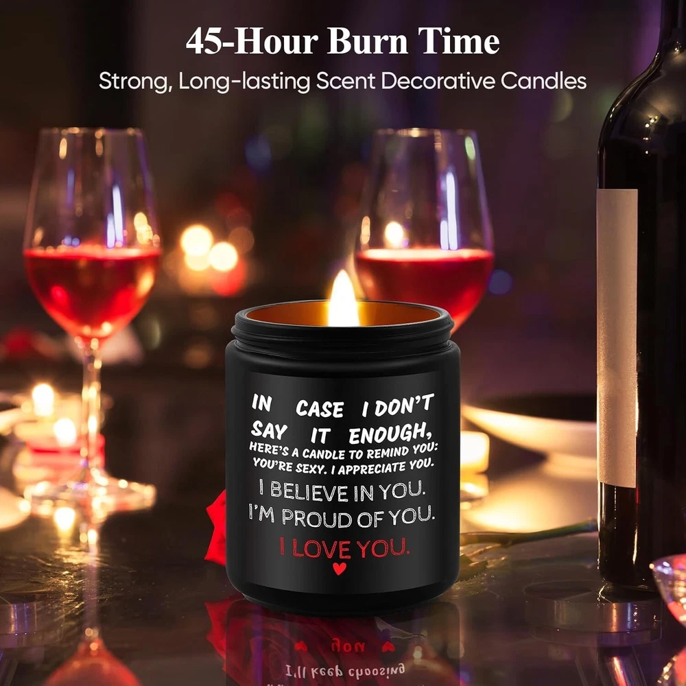 Valentines Day Gifts for Her, Him, Vanilla Lavender Scented Anniversary Candle Gift for Couples - Ideal for Weddings, Christmas, Birthdays, or Engagement - Gift Ideas for Him, Her, Husband, Wife Description: Expressive Romantic Candle Gift: Show your appreciation with a candle that says it all. Featuring the message “IN CASE I DON’T SAY IT ENOUGH, HERE’S A CANDLE TO REMIND YOU: YOU’RE SEXY. I APPRECIATE YOU. I BELIEVE IN YOU. I’M PROUD OF YOU. I LOVE YOU,” this is a sentimental gift for him and her and a perfect anniversary gift for couples. Ideal Engagement or Wedding Gift: This candle makes a thoughtful engagement gift for couple or wedding gift idea, ideal for celebrating relationship milestones with a lasting expression of love and support. Lavender Scented Candle for Relaxation: Infused with a soothing lavender aroma, this lavender scented candle is perfect for creating a relaxing, intimate atmosphere, making it an ideal romantic candle gift. Pe rsonalized Anniversary and Milestone Gift : Perfect for special occasions, this candle is a unique personalized anniversary gift and a funny couple gift that balances sentimentality and humor for meaningful gifting. Versatile for Any Occasion: Whether for an anniversary, birthday, or just because, this candle is a versatile choice. It’s a sentimental gift for him and her that celebrates love in an elegant, heartfelt way. Celebrate love with this Romantic Lavender Scented Candle, a thoughtful gift for anniversaries, weddings, or any special occasion. Featuring the heartfelt message “IN CASE I DON’T SAY IT ENOUGH…”, this candle is the perfect way to express appreciation and affection. Infused with a soothing lavender scent, it creates a relaxing and intimate atmosphere. Ideal as an engagement gift, wedding gift, or a personalized anniversary gift, it blends sentimentality and humor, making it a unique couple gift. Versatile for any occasion, this candle is a sentimental gift for him and her, designed to celebrate love and strengthen bonds.