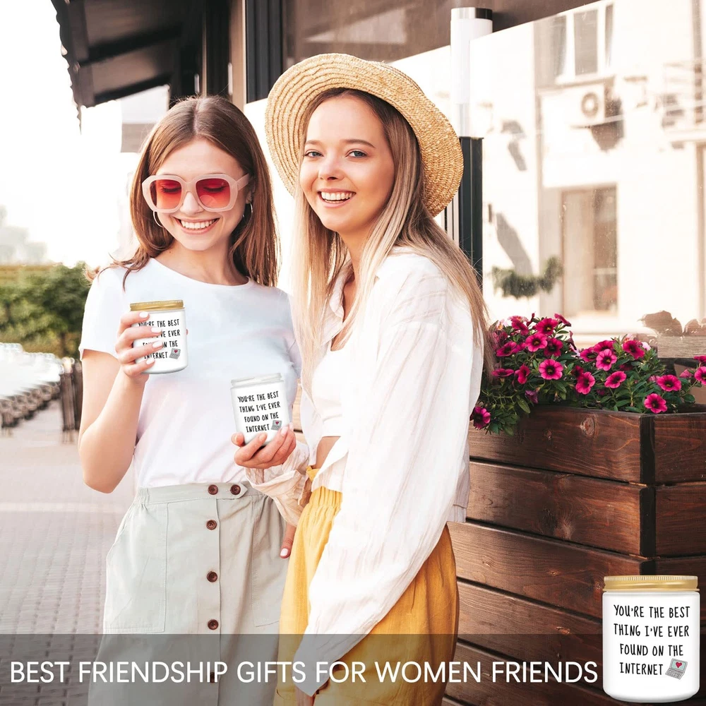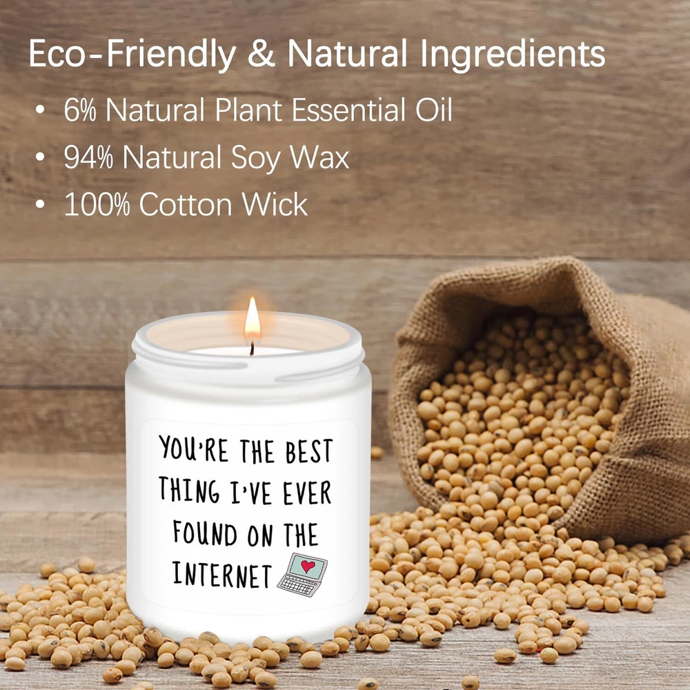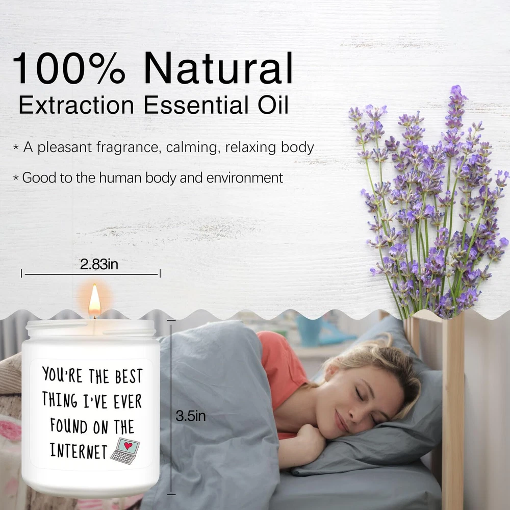 Gifts for Women: Premium quality lavender scented candles make great gifts for women. This funny scented candle features a witty and meaningful phrase to make her smile: You're the best thing I've ever found on the internet! Personalized gifts for women, gifts for her, best friends, girlfriend, wife, couple, fiancee, couples, teacher, coworker, boss, neighbor, classmate, sister,bestie, or anyone else. Warm and humorous candles have a unique way of making her laugh Relaxing Gift for Women: A premium lavender scented candle is great for sleep-promoting and from anxiety, depression, and . A good addition to the bathroom, bedroom, kitchen, living room, office, etc, funny gifts for women in your life to create a stressless relaxed, and comfortable life Funny Gifts for All Occasions: This candle is a best gift for most occasions, birthday gifts for women, Valentines Day gifts for her, new jobs gifts, housewarming gifts, graduation gifts, wedding gifts, Christmas Thanksgiving gifts, anniversary gifts, funny stocking stuffers, secret Santa gift, quarantine gift, holiday gifts. Warm and humorous candle gifts have a unique way of making her laugh, they will love them very much All Natural Scented Candle: This funny scented candle is made of all natural wax, cotton wick, and natural essential oil, which is burning for a long time, sufficiently, and clean, with no black smoke. Helps you fully relax your body, and enjoy the break day, work, reading, meditation, bathing, yoga, and date time Birthday Gifts for Women: This candle is a funny birthday anniversary Christmas unique gifts for best friends, girlfriend, wife, couple, fiancee, couples, teacher, coworker, boss, neighbor, classmate, sister,bestie coworker, employee, boss, buddy, partner, couple, lover, forever friends, separated friends, new friend, old friend or anyone else to show them how much you care about them and tell them how much you love them