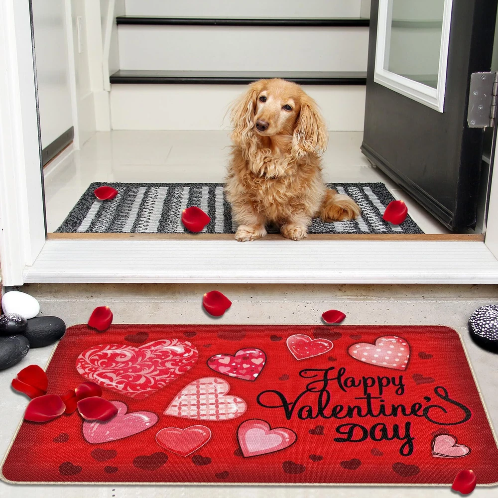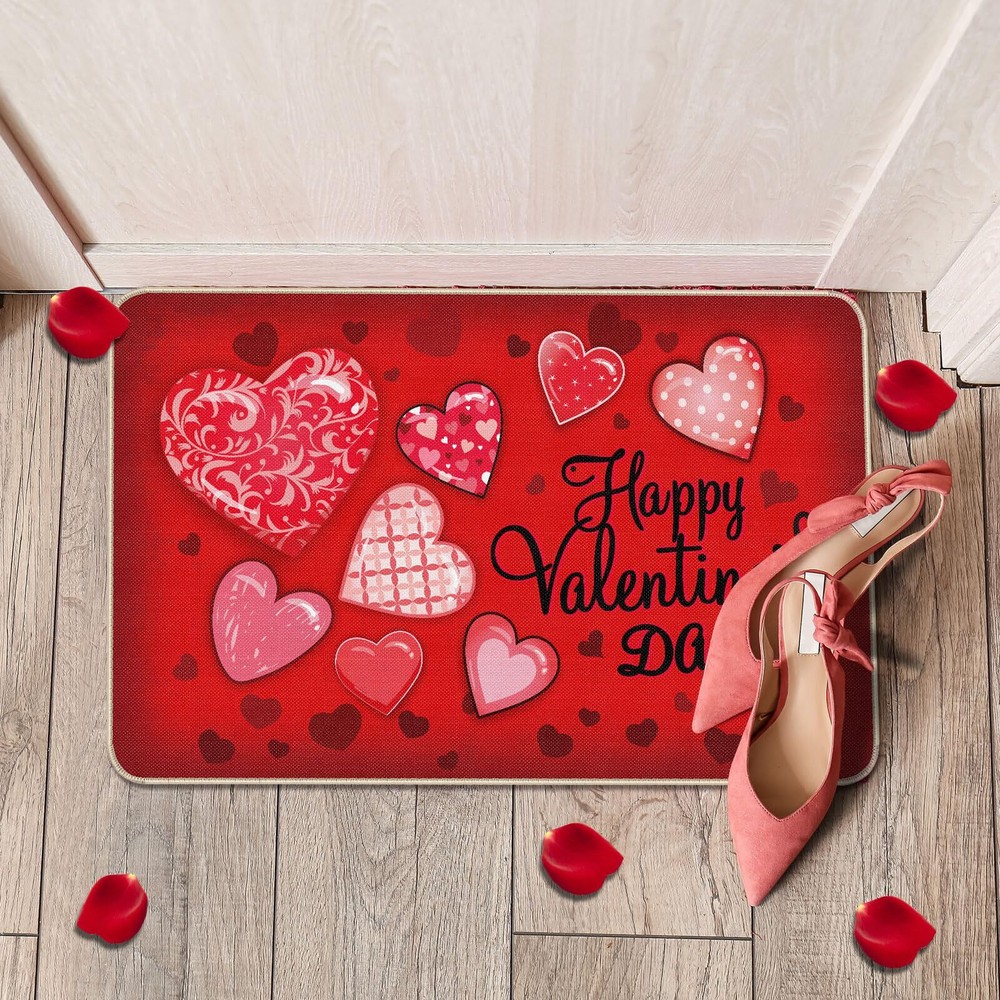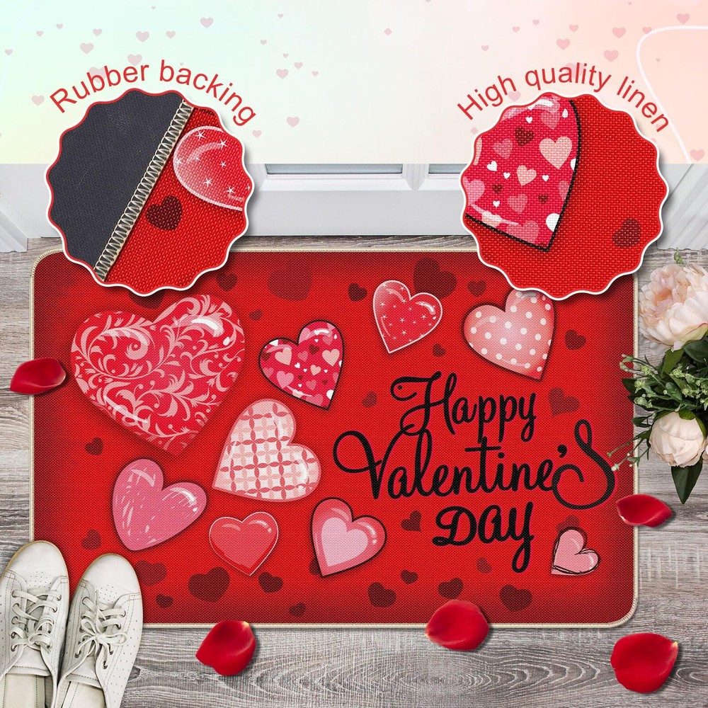 Decorative Mat: the package contains 1 Valentine's Day doormat, beautifully crafted with red heart patterns, and the words [Happy Valentine's Day], which fully meets your decoration needs, adds a festive atmosphere, and brings you convenience and aesthetic enjoyment Ideal Size: valentine decorative door mat measures approx. 17 x 29 inches, this doormat is the ideal size to place in your entryway, keeping a balance between being noticeable and not occupying too much space, making it an eye catching and practical addition to your home, and other places Durable Material: this washable heart floor rug is made of quality linen rubber, robust and enduring, not easy to break, deform, or wear out, can withstand heavy foot traffic over the holiday season, it is suitable for indoors and outdoors for long time use Anti Slip Design: the Valentine's Day flax mat is crafted with an anti slip rubber backing, ensuring safety for steps taken, which makes it a reliable choice for homes, reducing the risk of slipping during the bustling holiday season, keeping your guest safe and festive Cheerful Holiday Spirit: the welcome washable doormat provide a festive upgrade to your decor. The vibrant heart keeps in contrast to the red mat, immediately establishing a merry atmosphere, and leaving a deep impression on your guests