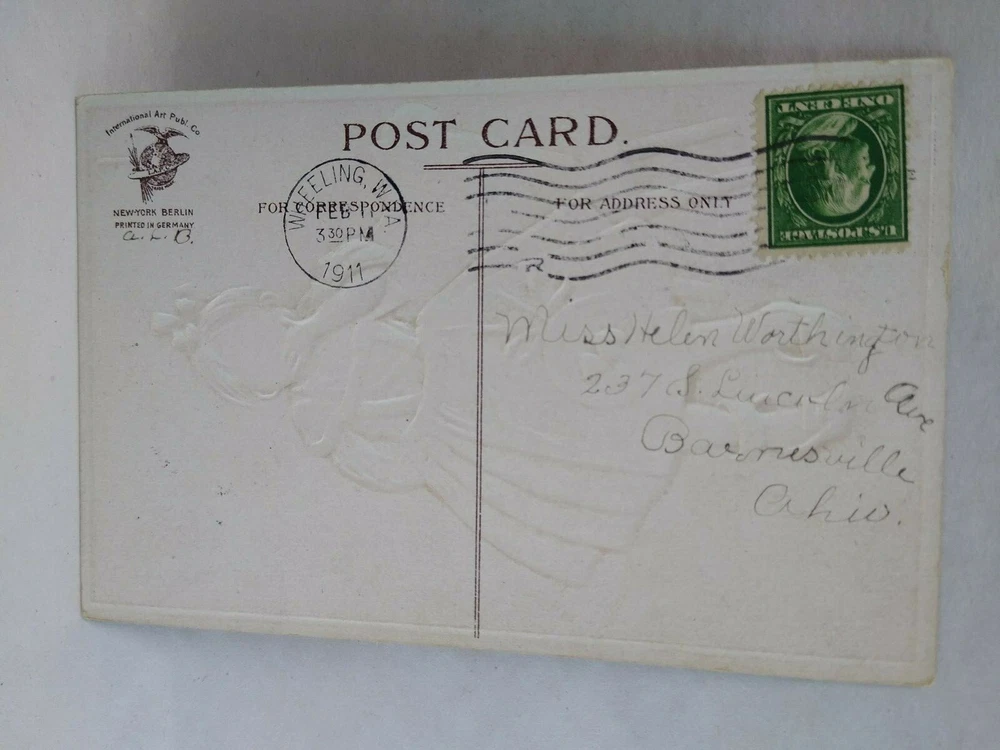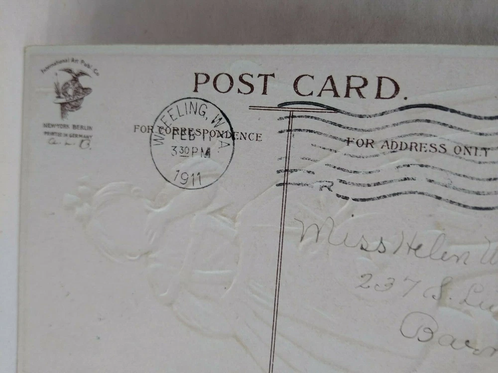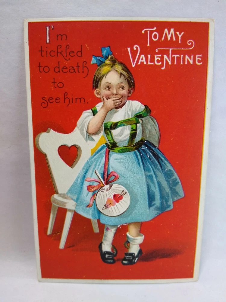 Valentines Day Postcard Unsigned Ellen Clapsaddle Germany Tickled To Death Girl Vintage embossed Valentine postcard. Unsigned Ellen Clapsaddle art. Has corner creases and age wear. Posted with 1911 Wheeling, West Virginia cancel and stamp. International Arts Publishing on back with printed in Germany. Stock #val28. Additional Halloween, Santa, Christmas, holiday postcards are in our store. SHIPPING Bundle and save by using cart and making single payment. International buyers are responsible for any import fees/taxes. ABOUT US Seller of vintage collectibles, retro gifts, advertising, artwork, vinyl records, pinball and arcade game flyers and parts, Mad magazines, antique Halloween and holiday postcards, Christmas items, super hero memorabilia, horror themed art, fun stuff. Combine to save by using the cart!