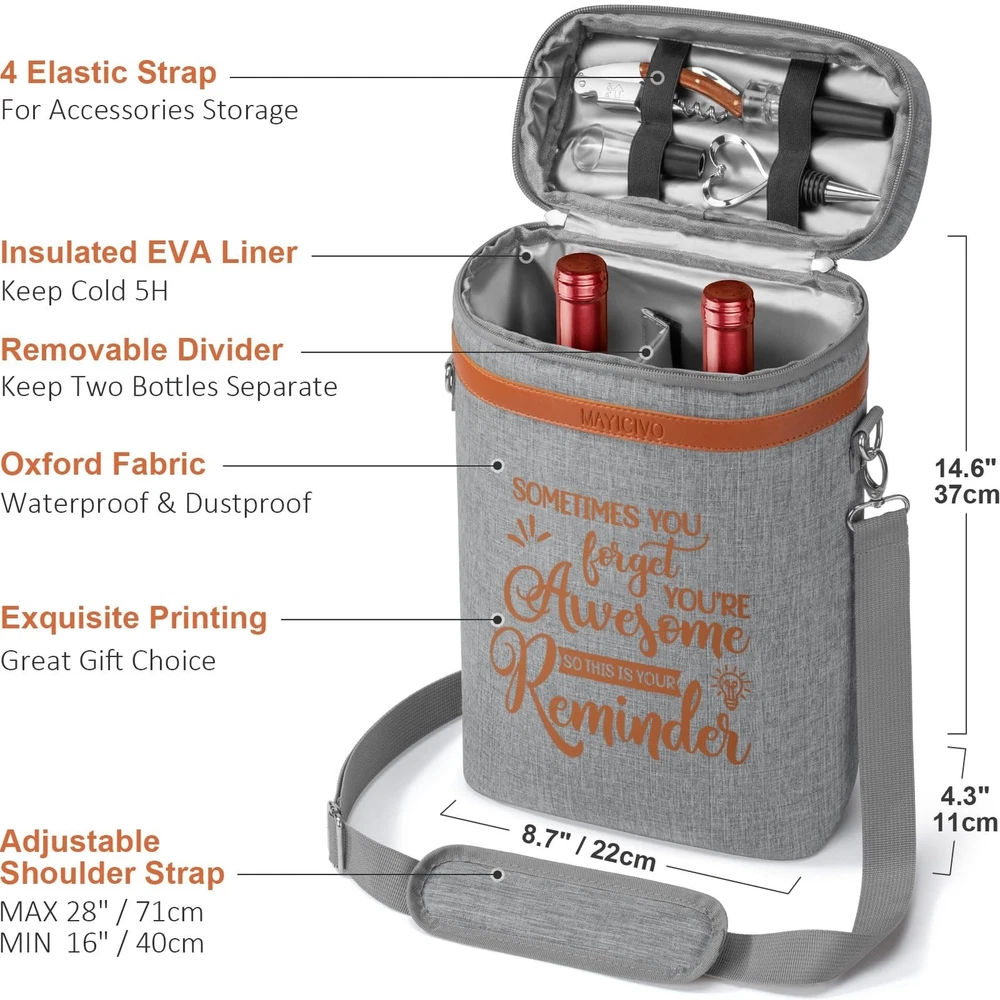 Valentines Day Wine Lovers Gifts for Women Wine Gifts Baskets, Birthday Gifts for Sister Friends Mom Dad Coworker Girlfriend Housewarming Gifts Set, Wine Cooler Bag Wine Tote Carrier w/Wine Tumblers Product Details Style Name: A1.You Are Awesome Brand: MAYICIVO MPN: Does not apply UPC: Does not apply EAN: Does not apply Brand: MAYICIVO Material: Oxford Fabric, Extra-Thick Padded Insulation, Seamless Leakproof EVA Liner Color: Black/White Special Feature: Insulated Style: A1.You Are Awesome Brand: MAYICIVO Material: Oxford Fabric, Extra-Thick Padded Insulation, Seamless Leakproof EVA Liner Color: Black/White Special Feature: Insulated Style: A1.You Are Awesome Theme: Holiday Recommended Uses For Product: Travel, Home Included Components: Insulated Tumblers, 3 in 1 Corkscrew Wine Opener, Wine Aerator Pourer, Heart-Shaped Wine Stopper, Vacuum Wine Stopper, Drawstring Storage Bag Specific Uses For Product: Wine, Hot & Cold Beverages Shape: Rectangular Pattern: Solid Material Feature: Insulated Reusability: Reusable Number of Items: 9 Embellishment: Glitter Package Type: Standard Packaging Manufacturer: MAYICIVO Package Dimensions: 12.52 x 10.55 x 4.02 inches Item Weight: 2.53 pounds Date First Available: March 3, 2024 PERFECT & CUTE BIRTHDAY GIFTS FOR WOMEN MEN: Still looking for an upscale wine lover gifts as birthday gifts for your love ones? MAYICIVO Insulated Wine Cooler Bag Wine Tote Carrier with Wine Tumbler Wine Accessories Gift Set is a prefect & cherished Christmas or birthday gifts for best friends mom dad sister couples wife girlfriend coworkers teacher nurse, etc. Great as Mothers day gifts for mom, valentines day gifts. This essential Wine Gifts Set is ideal for wine enthusiasts & sommeliers 9PCS WINE LOVER GIFTS FOR WOMEN MEN: MAYICIVO Best Friend Birthday Gifts for Women Friendship contains all carefully-designed thoughtful goodies, including 2x 12oz insulated tumblers, insulated wine tote bag, 3 in 1 corkscrew wine opener, wine aerator pourer, heart-shaped wine stopper, vacuum wine stopper, drawstring storage bag and elegant gift box. Such a heart-warming Wine Gifts for Women! Send this Inspirational Gifts For Women Men to convey your blessings and let them enjoy tasty wine FINE INSULATED WINE TRAVEL BAG: MAYICIVO Wine Bottle Cooler Bag is made of high quality waterproof & dustproof oxford fabric, extra-thick padded insulation & seamless leakproof EVA liner to protect bottles of wine from external collision, durable, lightweight, thermal insulated to effectively keep bottles of wine stay cold, warm & fresh for hours. Suitable for wine, liquor, champagne, whiskey, beer, coffee, etc. Also great as Christmas Gifts for Women Friends Sister Mom, Graduation Gifts CONSIDERATE DESIGN & MULTIFUNCTIONAL: MAYICIVO Insulated Wine Carrier Tote Bag (8.7L x 4.3W x 14.6H) can hold 2 standard 750ML wine bottles or wine and tumblers at the same time. Interior removable divider keeps 2 bottles separate and avoid colliding. 4 elastic straps on the top designed for wine accessories storage. The removable adjustable shoulder strap (16" to 28") & comfort handle make it portable to carry wine for dinner, party, bar, picnic, camping, beach, travel or road trip INSULATED VACUUM TUMBLER: Made of 18/8 food-grade sturdy stainless steel, with double-walled vacuum insulation, these sweat-free insulated tumblers can preserve beverage temperature up to 8h for cold and 4h for hot, great for wine, champagne, whiskey, beer, iced coffee, juice, smoothies, etc; Drink Happy Thoughts positive quote printing put glowing smiles on the face of recipient, making it an unique Birthday Gifts Idea for Sister Mom Dad Valentines Day Gifts for Her Him Girlfriend Wife PRACTICAL WINE ACCESSORIES GIFT SET: Our Wine Lovers Gifts for Women Men offers everything wine lovers need to enjoy wine time! The premium 3 in 1 corkscrew wine opener cuts foil & opens wine easily. The vacuum wine stopper keeps wine fresh & preserves its flavor. The wine aerator pourer instantly enriches wine's aroma & texture and reduces drips & spills. The delicate heart-shaped wine stopper airtight seals & decorates wine bottle. A drawstring bag can storage all small wine accessories DELUXE WINE BAG GIFT SET: This Wine Cooler Bag Wine Carrier Tote Gift Set with Glasses, wrapped in our high-end gift box, is perfectly presented as Birthday or Christmas Gifts for Women Men, Mothers Day Gifts for Mom, Valentines Day Gifts for Her Him Girlfriend wife couples, Cheer Up Gifts, Inspirational Gifts for Women Men or Appreciation Gifts.