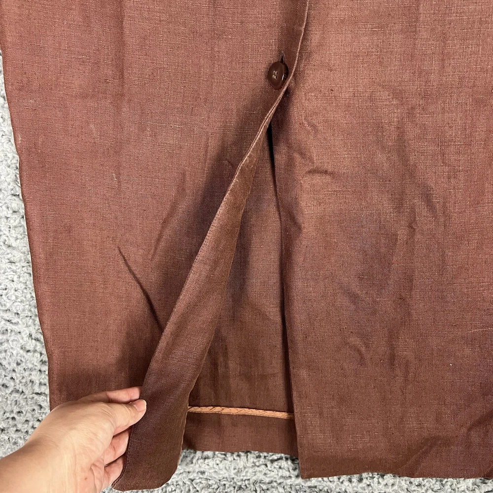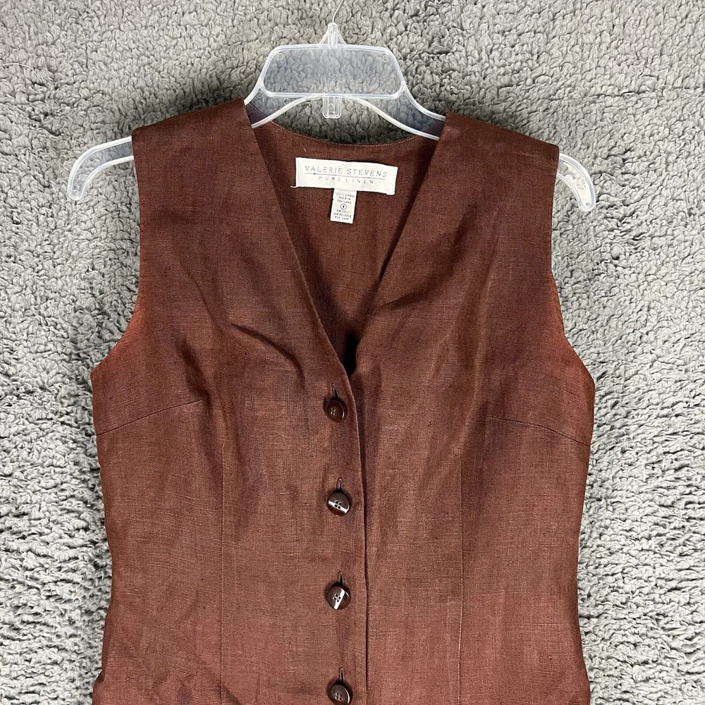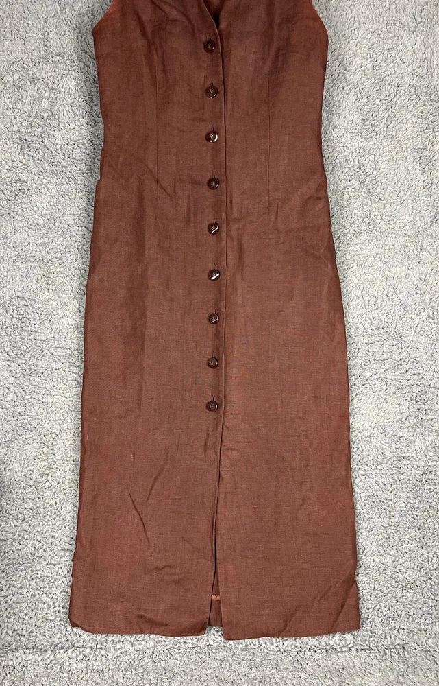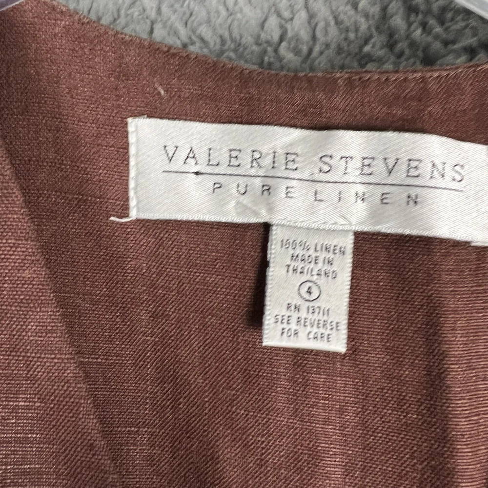 This beautiful Valerie Stevens maxi dress is a must-have for any vintage bohemian-inspired wardrobe. With its pure linen material and button-front design, this dress is both stylish and comfortable. The brown color and 1990s decade make it a unique vintage piece that is sure to turn heads. Perfect for a day dress occasion, this dress is available in size 4 and is an original piece. Its regular size type and women's vintage clothing category make it a great addition to any fashion-forward wardrobe. Don't miss out on the opportunity to add this stunning dress to your collection. An instant classic! Measurements are in photos and approximate.
