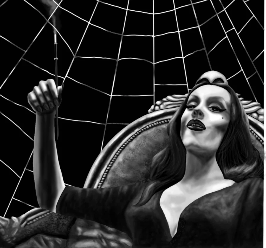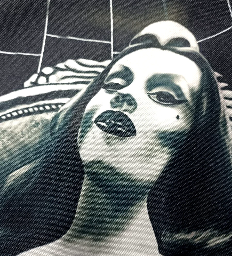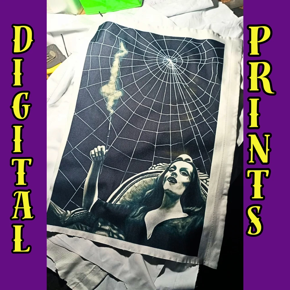 ***Treasure Suite offers you many pieces of my art prints now*** ###This section is for large sized sublimation prints of my digital art. measurements are 15"hx12"w. ### A 12x15 sublimation print of my digital artwork of the always lovely Vampira chilling and smoking it up by ye ol' cobweb. *Welcome to my unique collection of digital art, where creativity meets craftsmanship! Each piece in this category features my original designs, heat pressed into vibrant sublimation prints on polyester canvas material. These art pieces are not just decorations, they are collectibles that bring a touch of gothic, rock and roll, horror, pin-up, and lowbrow art into your space. *I leave extra fabric border so you can gallery wrap on frame,cut to size, or sew onto clothes. Sublimation printing is what's done on clothing, like all over sweaters,tshirts,banners,etc. So that means it can be used on clothing and washed. If print gets wrinkled, you can steam it. *These pieces are perfect for adding a distinctive edge to your home or office, and they make fantastic gifts for art enthusiasts and collectors alike. Who doesn't enjoy vibrant digital art of out of this world space huntresses, demon witches, cyberpunk vixen cyborgs, spooky mistresses,and so on?