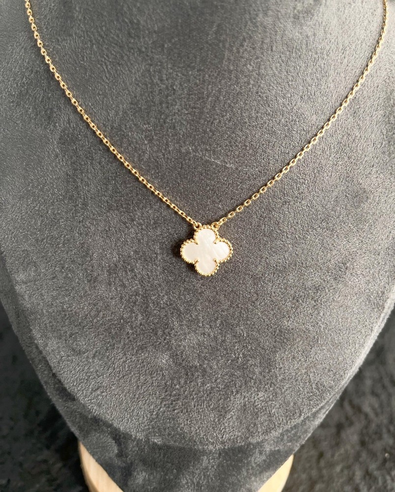 About this item Elevate your style with our Clover 1 motifs Mother Of Pearl Necklace. Featuring 1 delicate motifs crafted from luxurious Mother Of Pearl with a shimmering gold chain, this necklace exudes sophistication and elegance. Perfect for adding a touch of high-end glamour to any outfit. ADDITIONAL INFORMATION • Color: Gold • Stone: Mother Of Pearl • Material: - 925 Sterling Silver - 18k Gold Plated