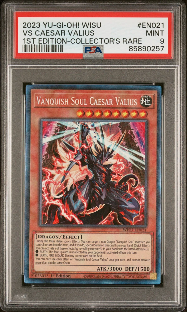This Yu-Gi-Oh! TCG card is a 1st Edition Ultra Rare NM Vanquish Soul Caesar Valius from the Wild Survivors set. It features a Japanese card size, English language, and the card number WISU-EN021. The card is an effect type, with a creature/monster type of dragon. The card manufacturer is Konami, and it is a great addition to any collection of collectible card games. The card's rarity and condition type of 400010 make it a highly sought-after item. Get your hands on this card today and add it to your collection!