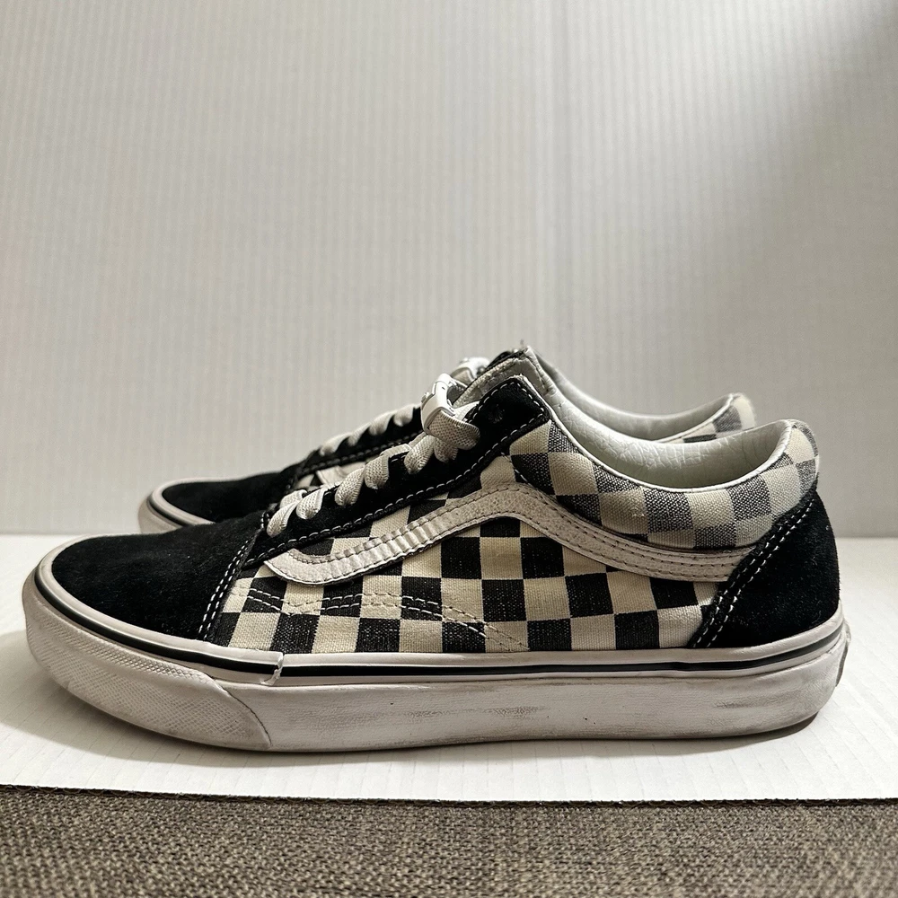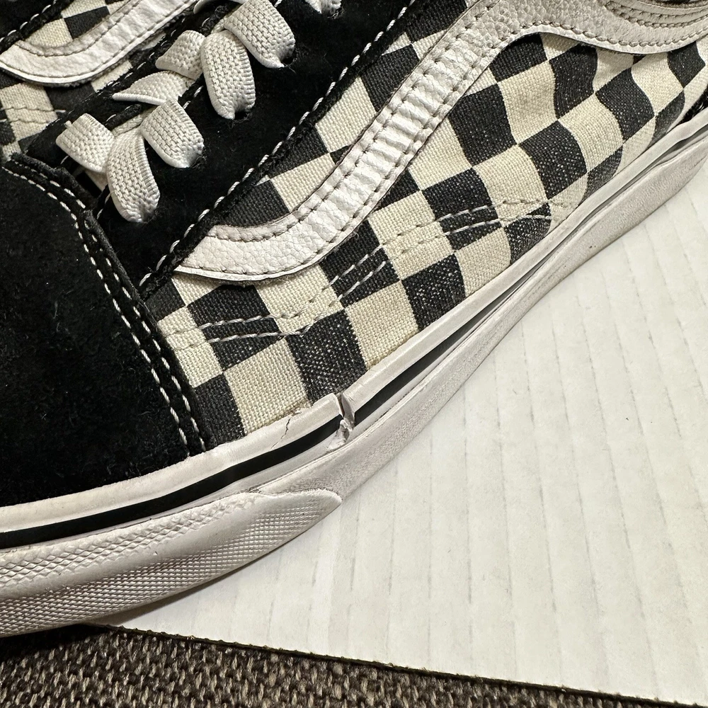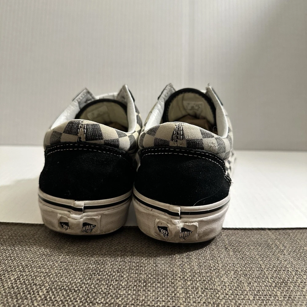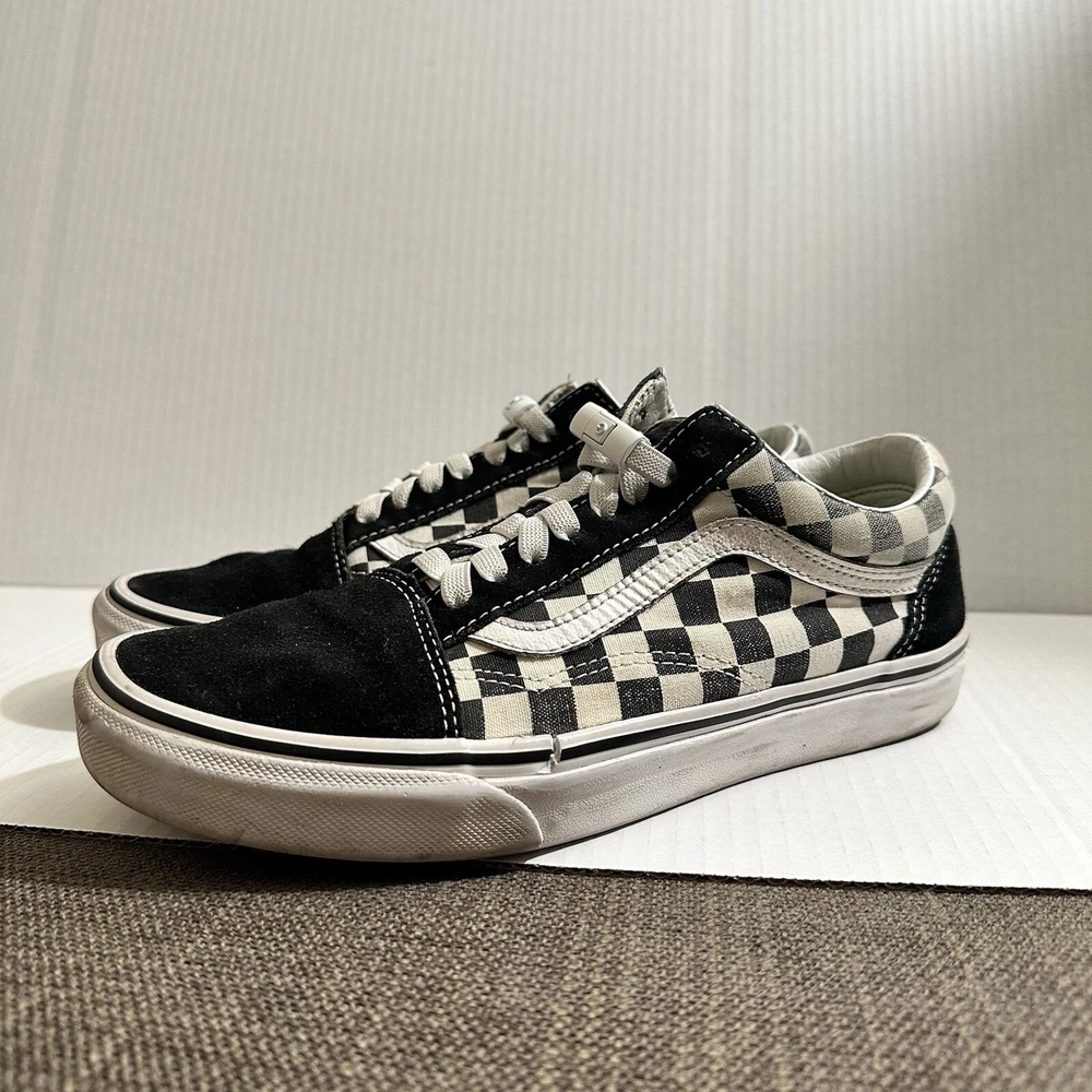 The Vans Off The Wall Checkerboard Skate Shoes are a stylish and functional choice for men. These athletic sneakers feature a black and white checkered pattern with a lace-up closure and suede upper material. The toe cap and outsole are also made of suede, adding durability and a sleek look to the design. With a size of 6.5, these Vans Checkerboard shoes are perfect for casual or activewear occasions, offering both comfort and street style for daily wear. Lace and insole are changed