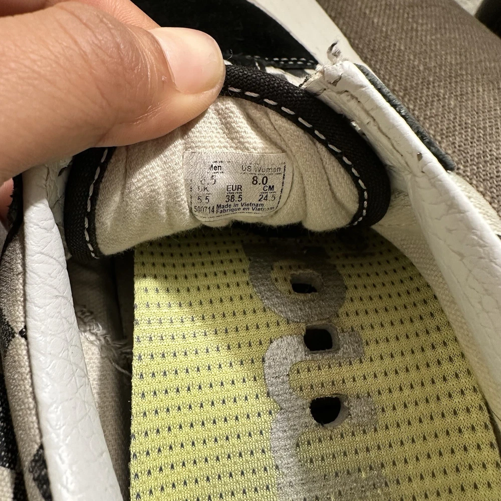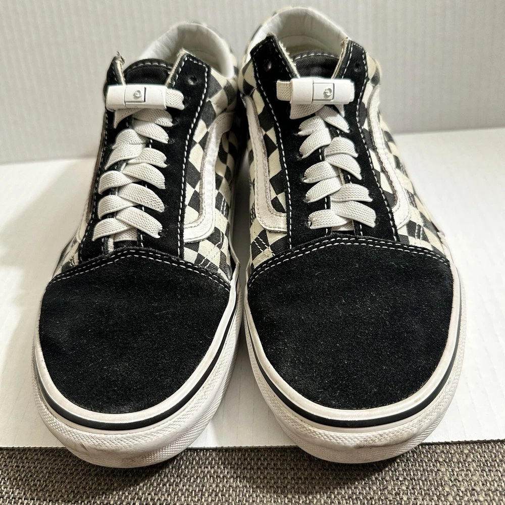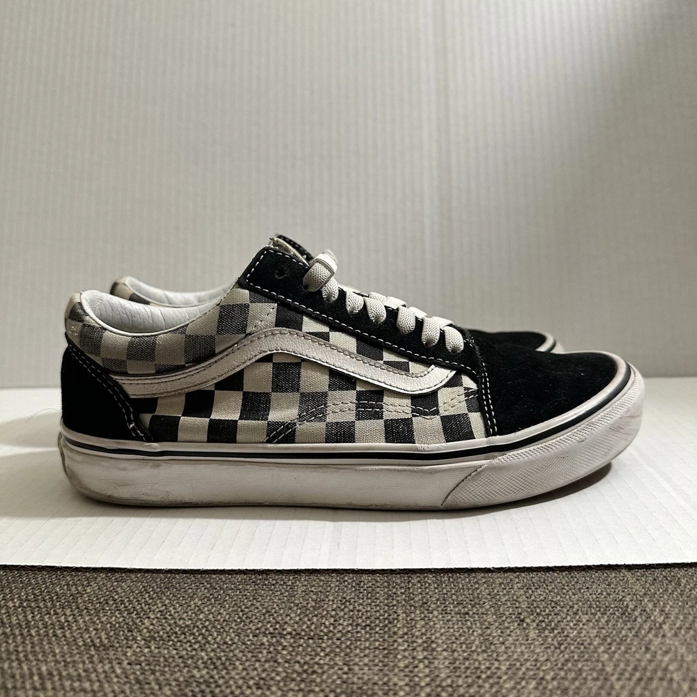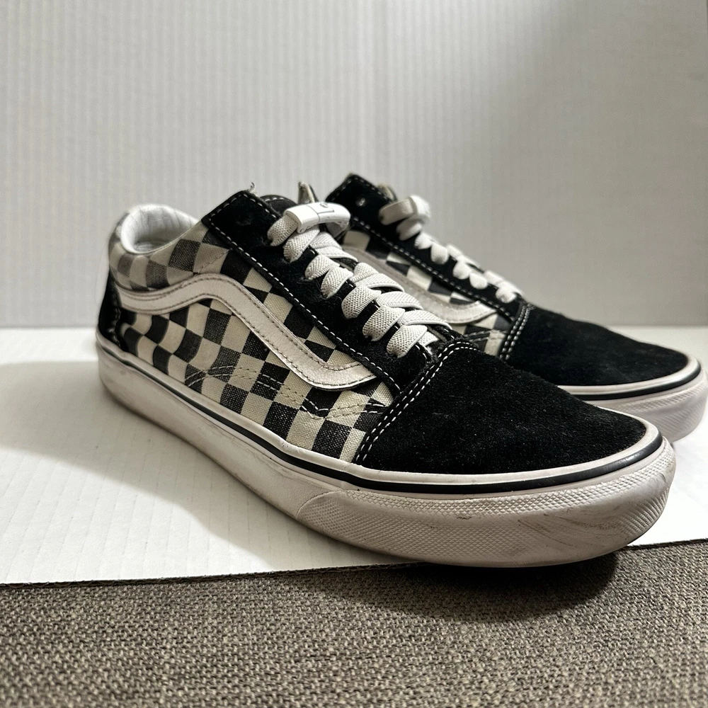 The Vans Off The Wall Checkerboard Skate Shoes are a stylish and functional choice for men. These athletic sneakers feature a black and white checkered pattern with a lace-up closure and suede upper material. The toe cap and outsole are also made of suede, adding durability and a sleek look to the design. With a size of 6.5, these Vans Checkerboard shoes are perfect for casual or activewear occasions, offering both comfort and street style for daily wear. Lace and insole are changed