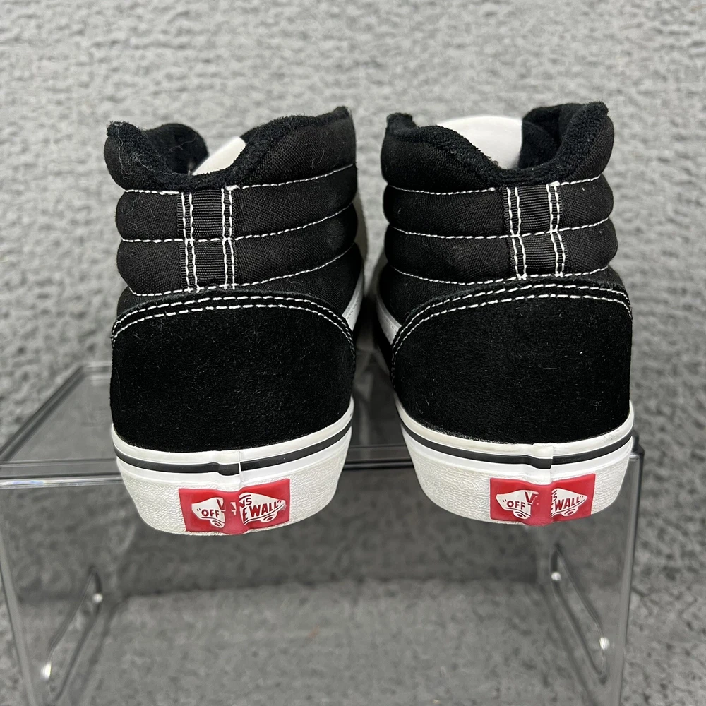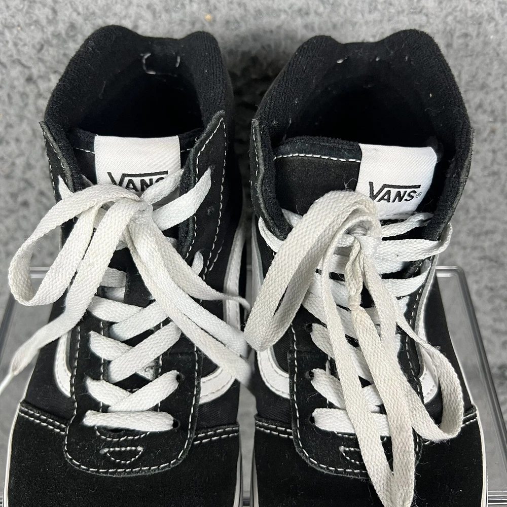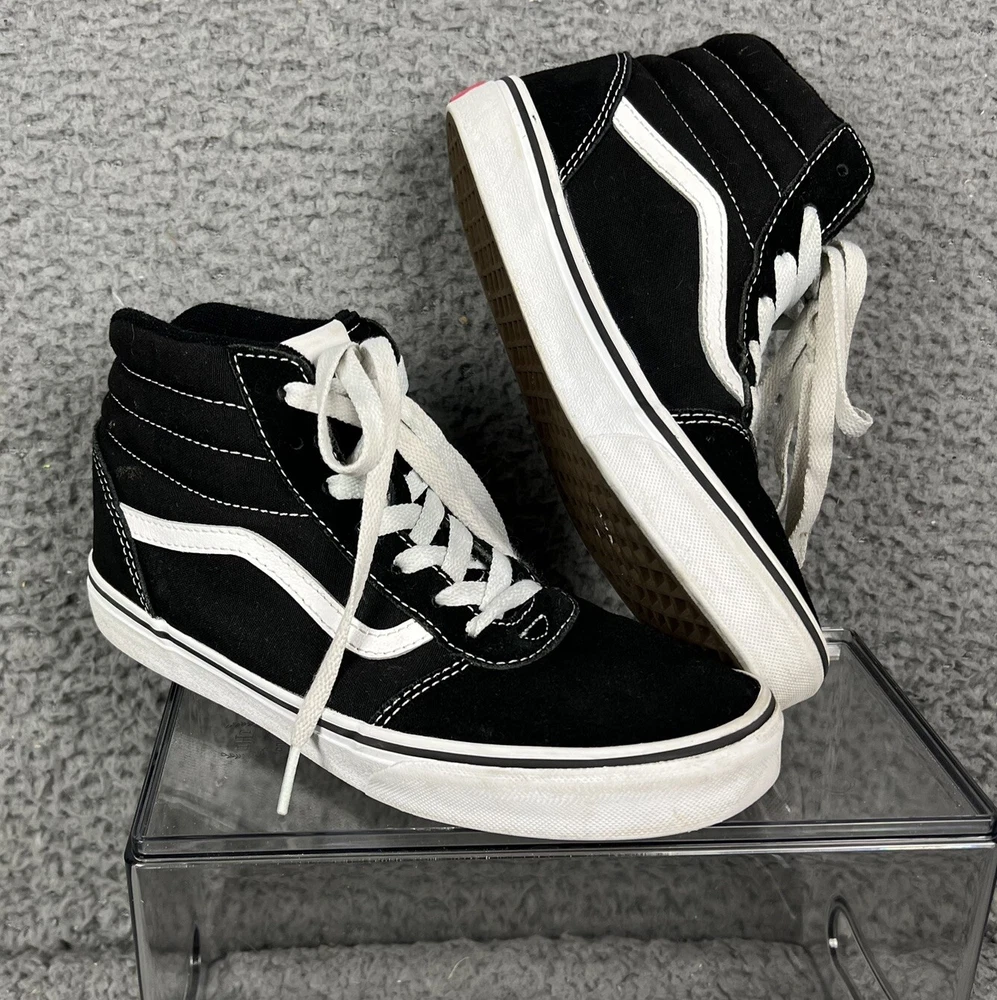 This is a pair of Vans Off The Wall high top canvas sneakers in black and white, designed for men in a US size 5, which would also fit youth size 5 or women's size 6. The sneakers feature a lace-up closure, round toe shape, and solid pattern with the VANS Off The Wall logo. They are suitable for casual wear during all seasons and are made in Vietnam. With a standard shoe width, these Vans sneakers offer a classic and versatile style for everyday use.