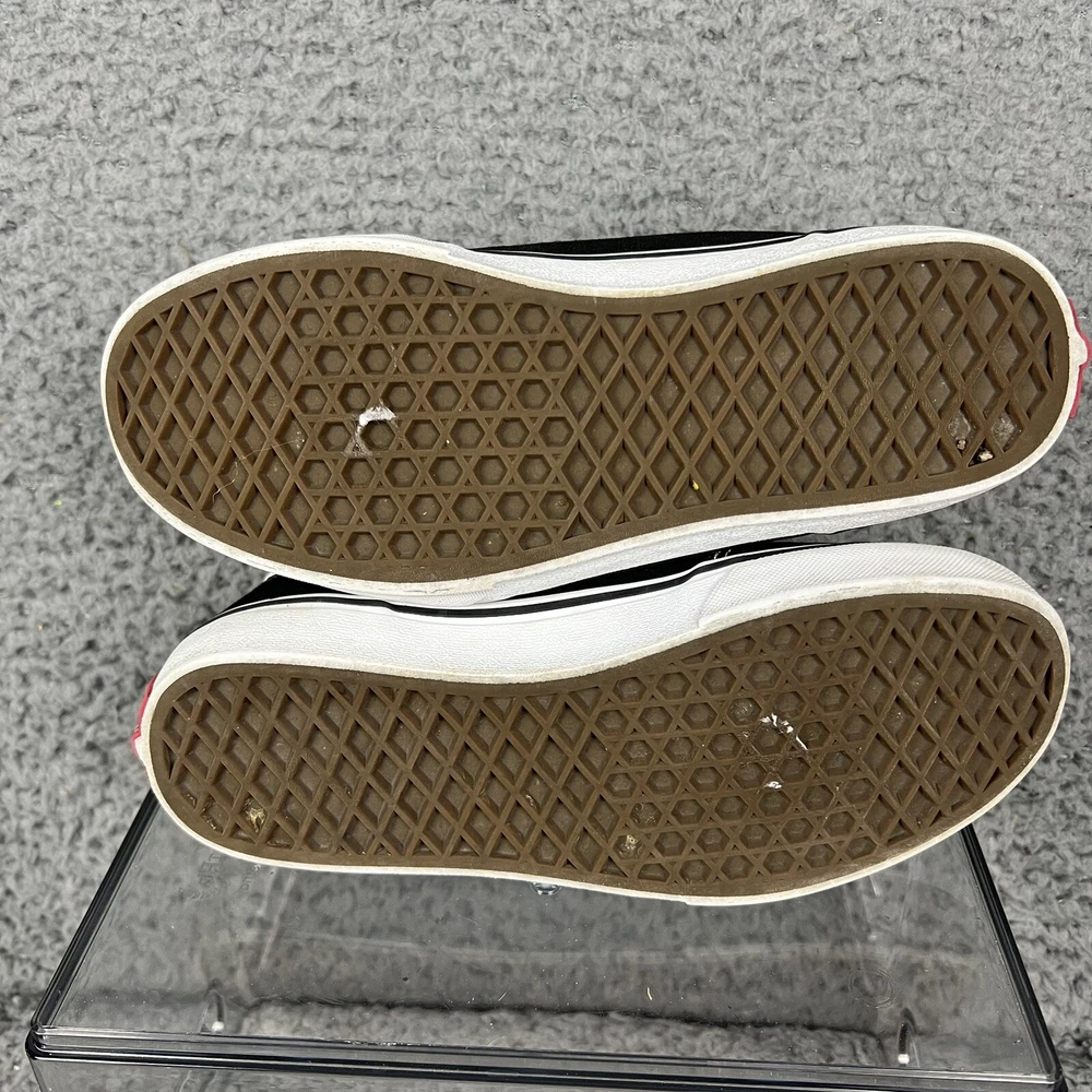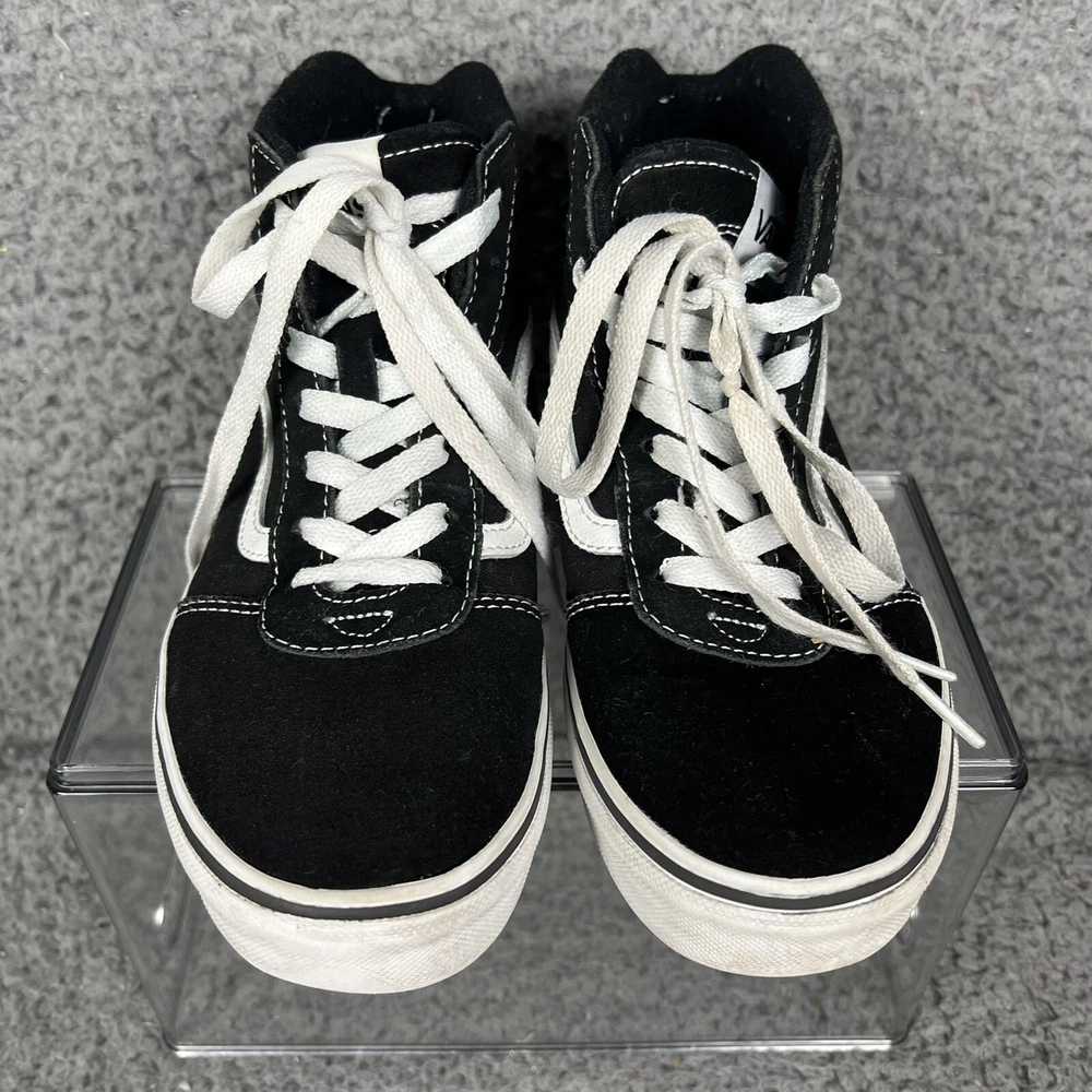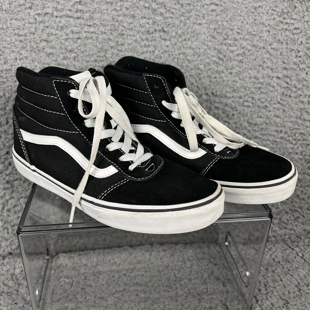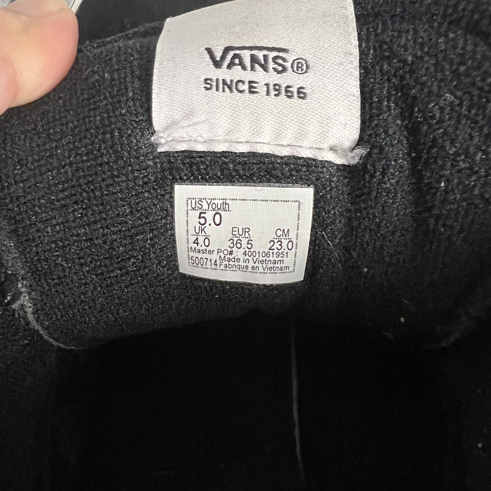 This is a pair of Vans Off The Wall high top canvas sneakers in black and white, designed for men in a US size 5, which would also fit youth size 5 or women's size 6. The sneakers feature a lace-up closure, round toe shape, and solid pattern with the VANS Off The Wall logo. They are suitable for casual wear during all seasons and are made in Vietnam. With a standard shoe width, these Vans sneakers offer a classic and versatile style for everyday use.