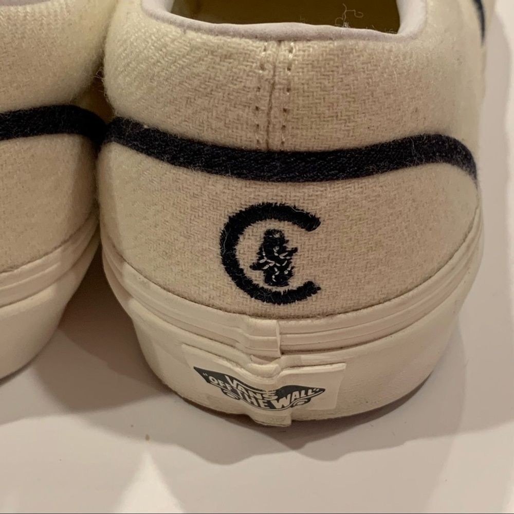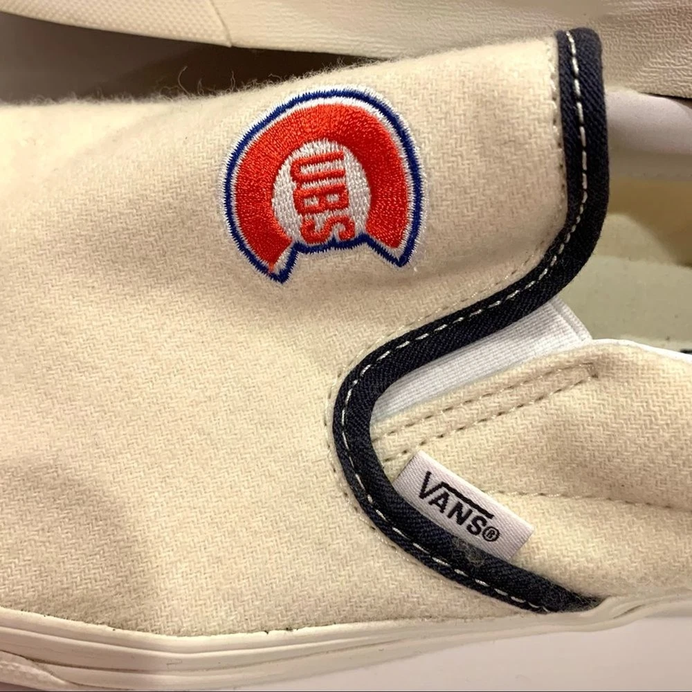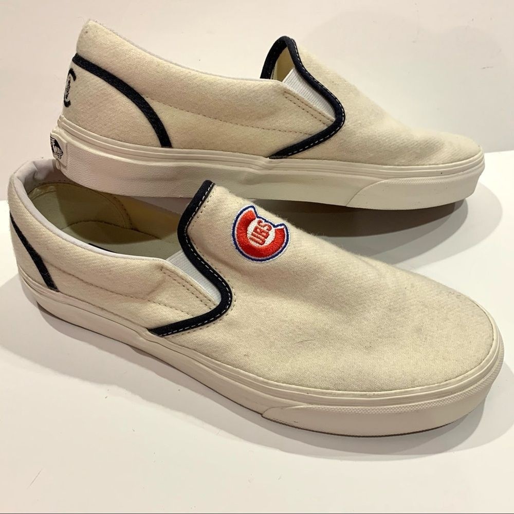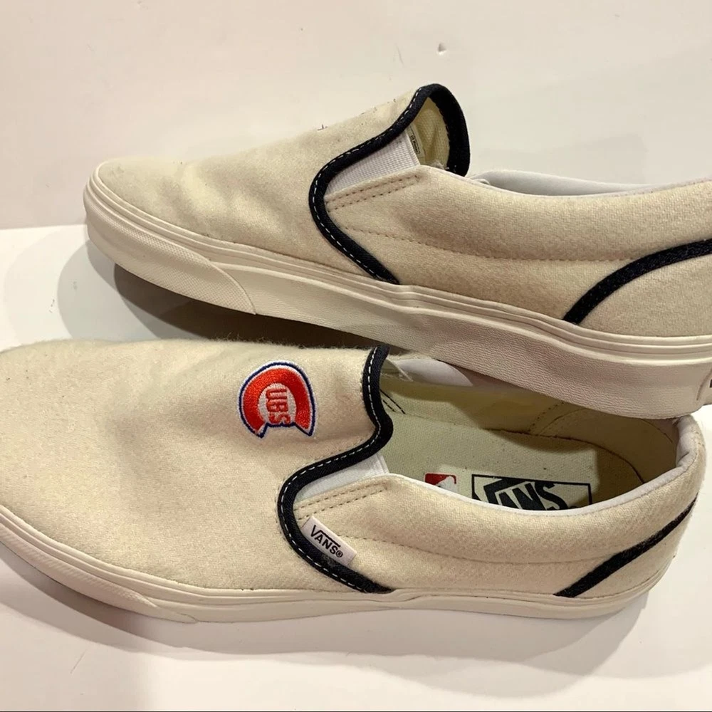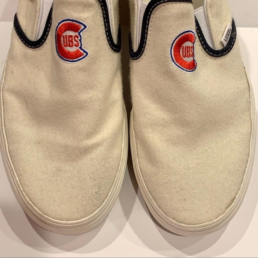 Vans White Wool Chicago Cubs Slip-on Loafer Unisex Men’s 9.5 Women’s 11 These shoes were worn once. Still in great condition. The rubber is very white and cleans very well. Very minor markings on wool tops. Non smoking home. Please visit my closet for more great items.