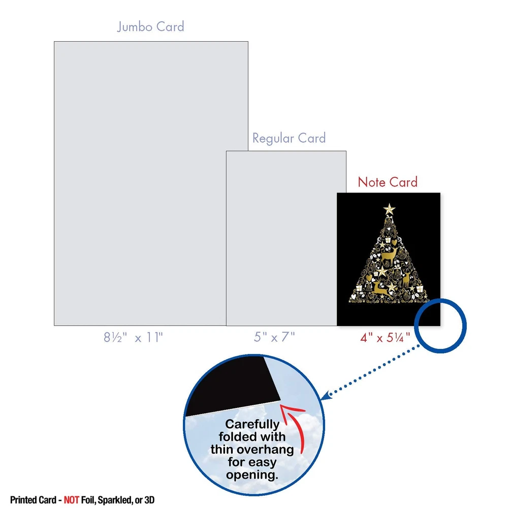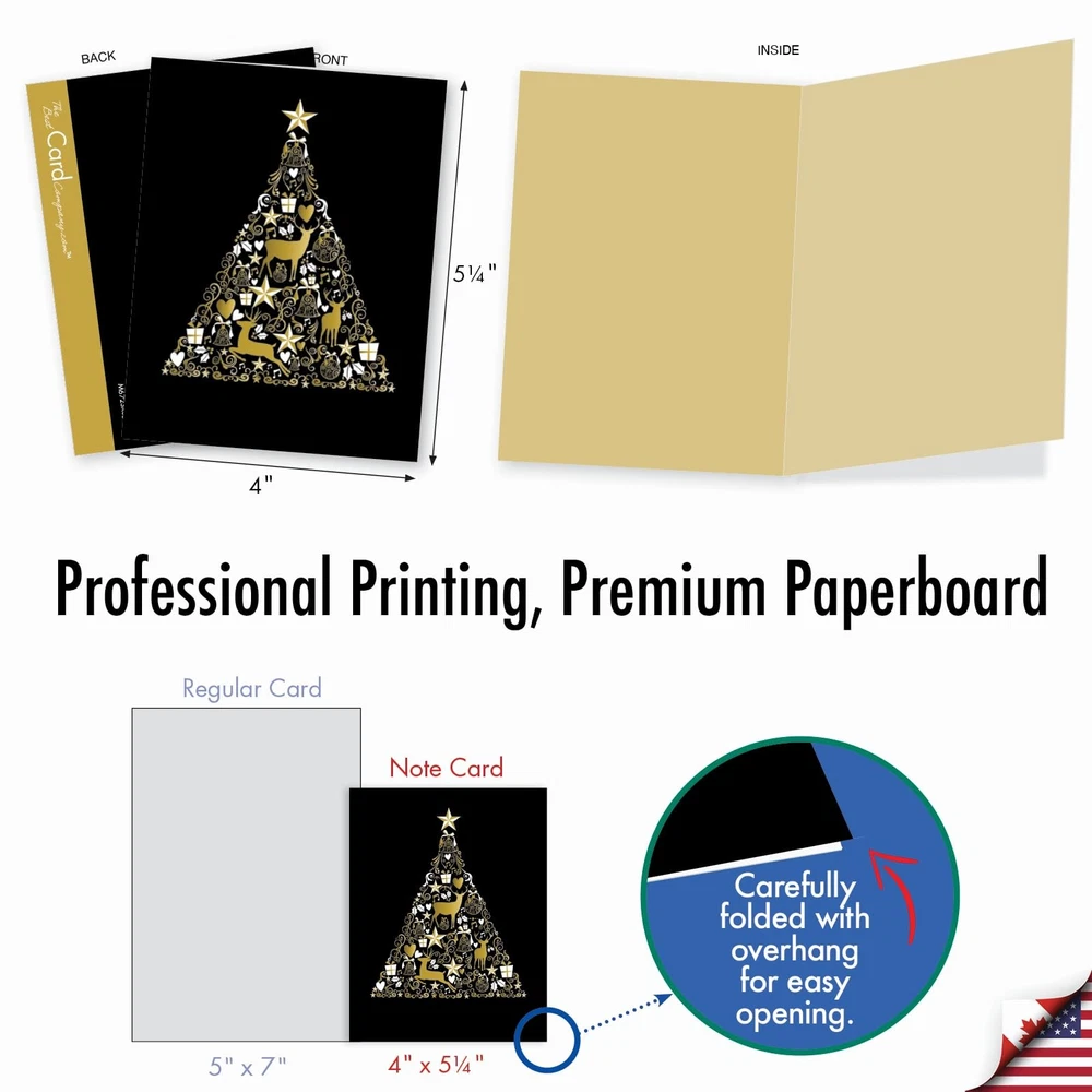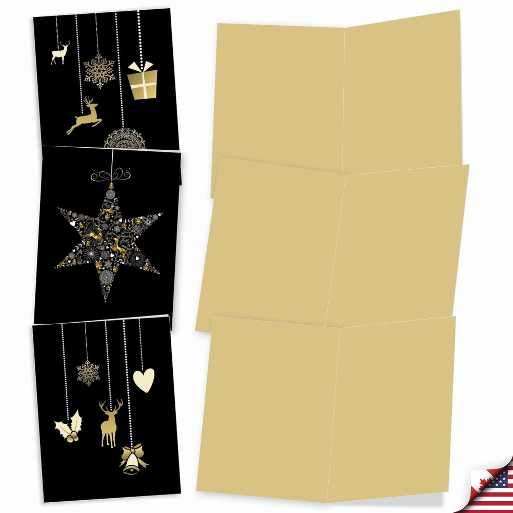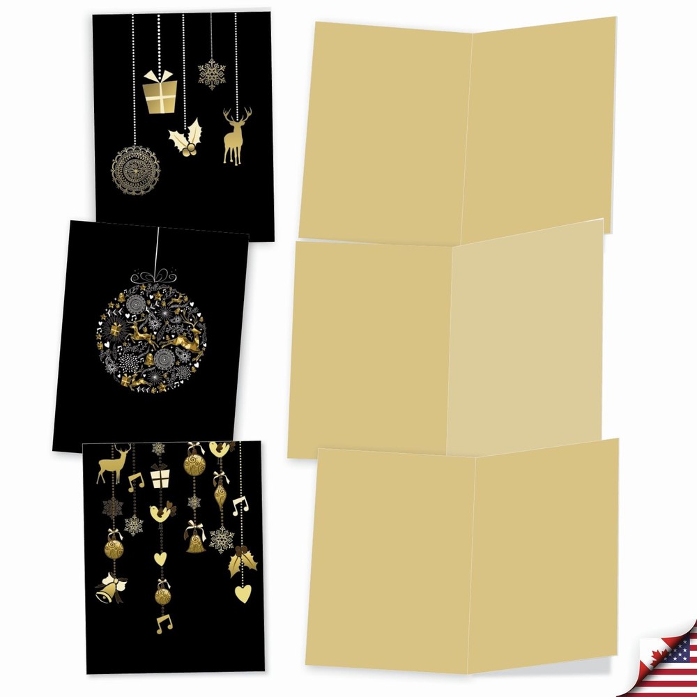 Printed (not foiled or gilded) gold and silver festive icons on black backgrounds strike a stunning contrast on these unique holiday All Occasions cards. Golden Xmas trees, reindeer, bells, snowflakes, holly and stars are set against dark backgrounds and embossed with silver swirls and white hearts to create memorably iconic images. To be treasured by all who gratefully receive them!These unique note cards are packaged in a complementary-themed set featuring carefully edited, gallery-quality assorted images, each different yet closely related. We offer a broad collection of everyday and seasonal designs, presented in a wide variety of artistic styles. Available with a blank inside, this versatile note card set is printed in the U.S. on high-quality, recycled stock and packaged in a design-specific and color-coordinated custom box featuring a visual reference of the entire series contained within. They look great framed, too! Try framing them individually, or grouping several in a collage frame, to create visually appealing wall decor.Assorted Note Cards Depicting Golden Hanging Ornaments and Silver Swirls with White Envelopes. INSIDE GREETING: The inside is ungreeted, making this perfect for your customized notes for all occasions! SIZE - Bulk gift box set of 10 beautiful assorted blank Christmas note cards & envelopes and measure 4" x 5", which is smaller than your regular standard card. SIZE - Bulk gift box set of 10 beautiful assorted blank Christmas note cards & envelopes and measure 4" x 5", which is smaller than your regular standard card. SOCIALLY RESPONSIBLE - Keeping US jobs at home, our products are Made in the USA (and Canada) for almost 40 years. We use thick, white, glossy cardstock, w/ 30% recycled content (no papyrus, naturally).