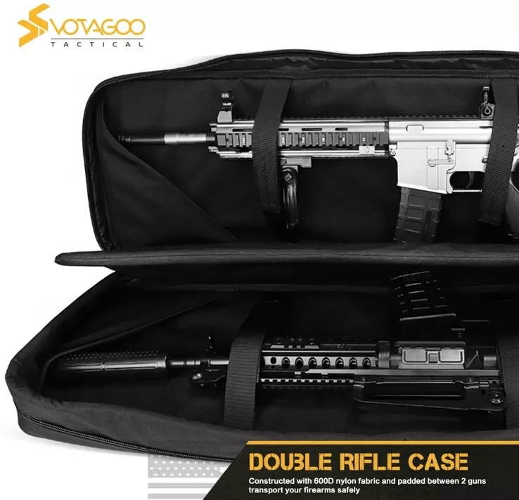 Durable Construction Material: Constructed by heavy-duty 600D nylon fabric exterior & interior. Padded on all side for increased protection. Removable protective pad keep your valuable firearm from wear also can be used as shooting mat. Safe & Spacious: Dual lockable zippers keep your firearms safe, 2 locks included in the package. Holds 2 rifles and 2 pistols, ample storage in the front for your range accessories. Molle compatible webbing for customization. Professional Rifle Bag: Rugged ballistic pack cloth construction, extra 2 outside accessory pouches fit all your need. Portable removable backpack w/storage pouches. Double stitching construction workmanship solid. Hold 2 Rifle Refined Design & Functional: Double rifle case with more refined design, multiple compartments inside and out provide storage for just about anything you’ll want to carry. Fully customizable web and loop platform can carry all your other tactical accessories.