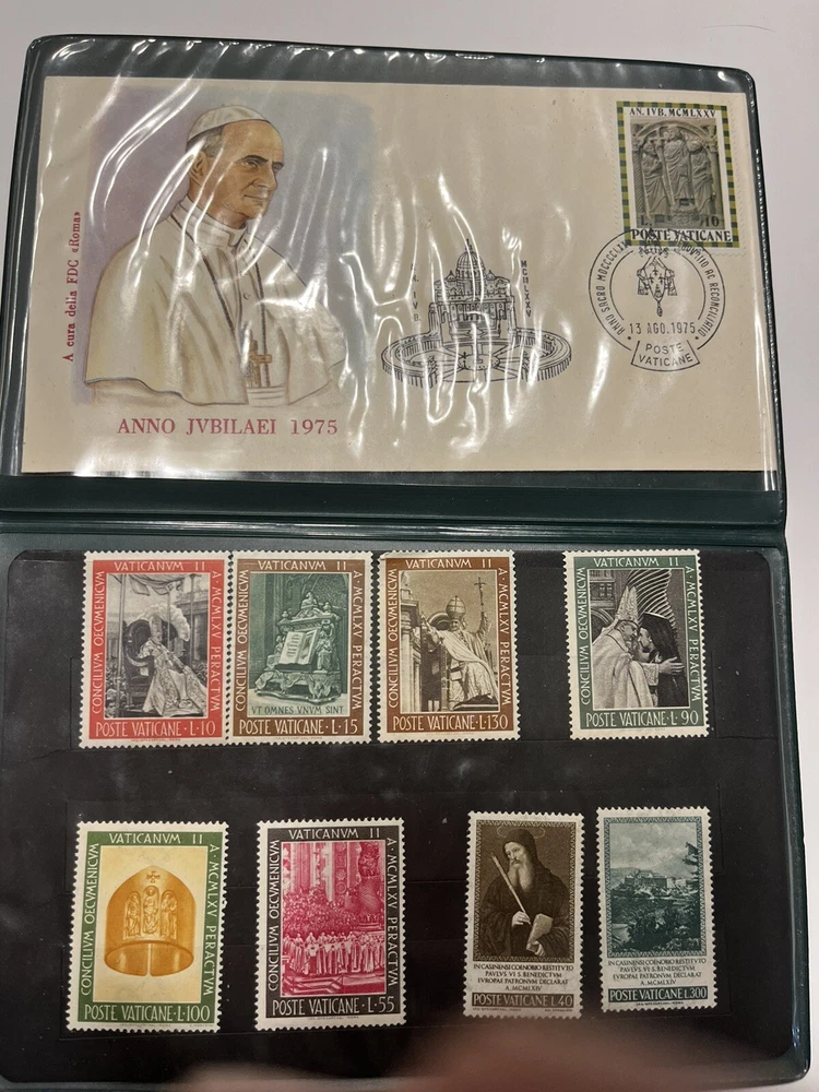 This Vatican stamp collection from 1975 commemorates the Anno Jvbilaei and features beautiful architecture from Rome. The collection includes a souvenir sheet and a first day of issue cancellation. The stamps and booklet are in very fine condition, making it a great addition to any stamp collection. Although it is not certified, this cover is a unique and valuable piece for any stamp enthusiast. Stamps, envelope and booklet in very good condition.