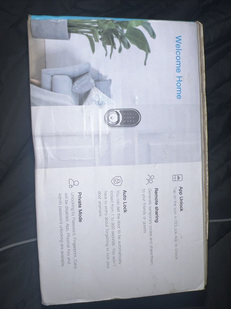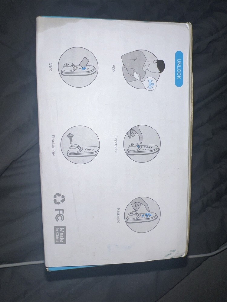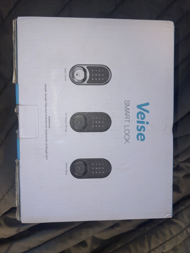 The Veise RZ07 Smart Lock is a black door lock made of aluminum alloy with a matte finish. It features a keyless entry system, fingerprint touchscreen, and includes keys for manual entry. Suitable for front doors, it comes with hardware and instructions for installation. Open box
