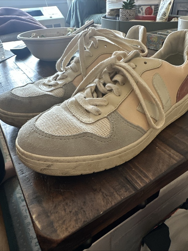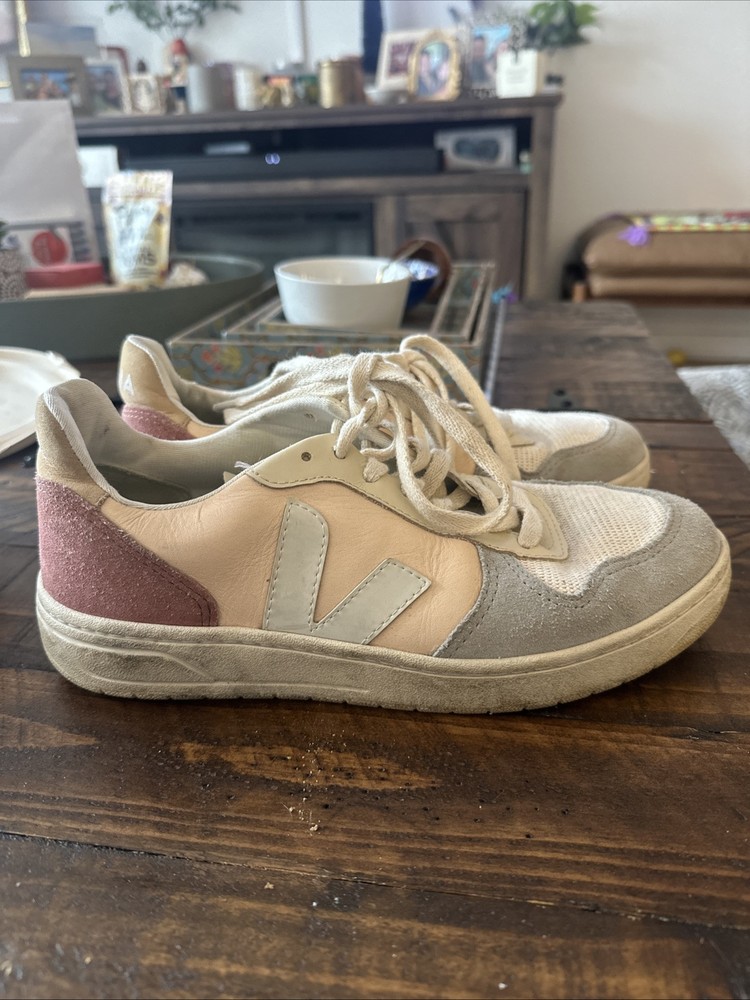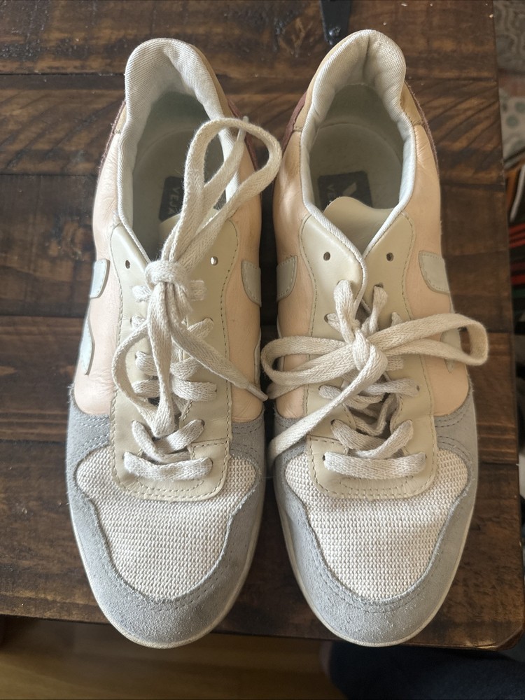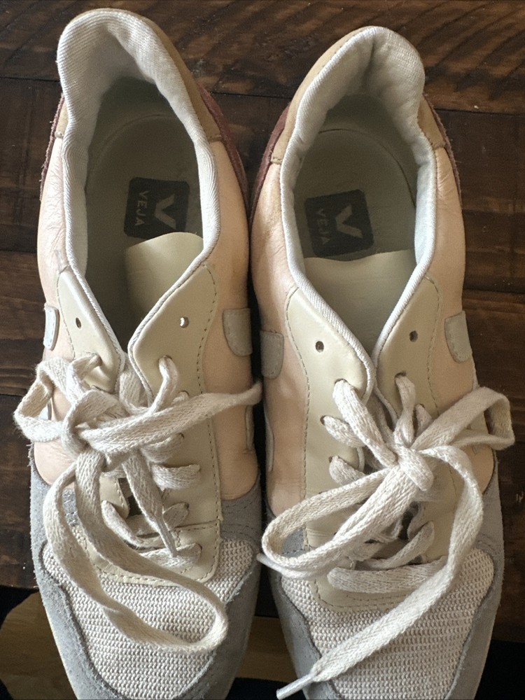 Lightly worn still in very good condition multiple mediums on the shoe leather suede and canvas. Colors ar cream, raspberry, peach and light blue gorgeous shoes!