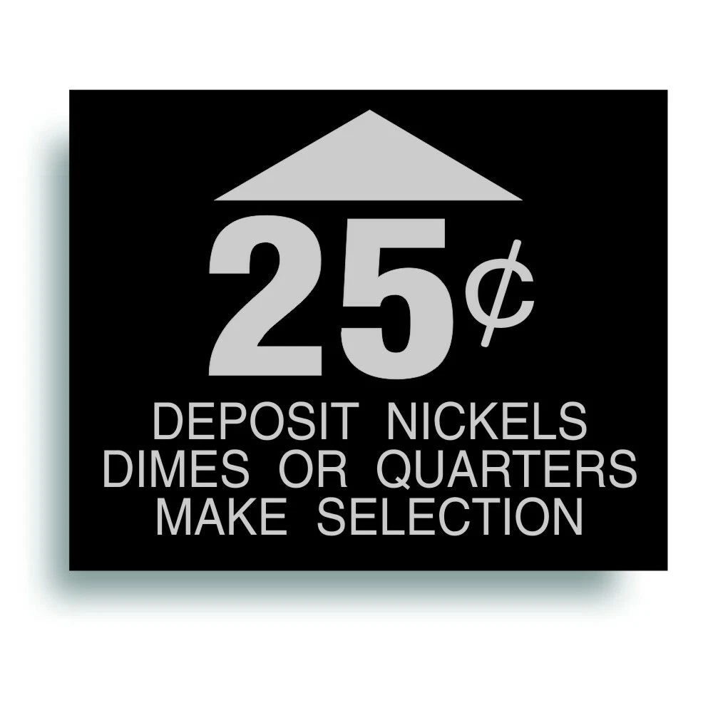 Vending Machine coin slot Decal Sticker - Fits some Cavalier machines, measures approximately 1 3/4 x 2 1/8 Inches, Black on Silver. - Comes with 3 additional denomination decals (1 1/4 inch) Special Notes About This Item: Black printed on a silver metallic vinyl, clear laminated - please note, color displayed may be slightly different than actual decal. Decal is vinyl with a clear gloss lamination, not a coated paper. Decal will hold up very well on indoor or outdoor applications. We do have other vending machine decals available in different sizes and for different applications. Use the keyword of the machine type in in the following list to search our store for other listings if you are looking for a decal of different size or application. Universal Fit measures 1 1/2 x 4 1/2. Dixie Narco measures 2 3/16 X 4 1/2. Cavalier measures 1 3/4 X 2 1/8. Vendo measures 1 11/16 X 4 7/8. Vendo H63 measures 1 1/4 x 3 1/4. Select-O-Matic Westinghouse measures 2 x 6 3/4, 7 3/4 slant cut. About DIGITALLY PRINTED DECALS This decal is printed on quality 3M vinyl with a true solvent printer (outdoor durable). Decals hold up well indoors and outdoors, as they have a clear gloss laminate for extra protection from the UV sun rays and scratching. Simply peel the back, rub/squeegee in place. The decal has adhesive on back. The colors may vary slightly from what shows on your computer monitor. Our decals are aftermarket, of our own design, and are not direct reproduction, NOS, or original equipment decals. ABOUT FEEDBACK and our 100% Satisfaction Guarantee There is never a reason to leave Neutral/Negative feedback with our 100% policy. Items are refunded or replaced if you have any problems or issues whatsoever. Contact us prior to dispute feedback.