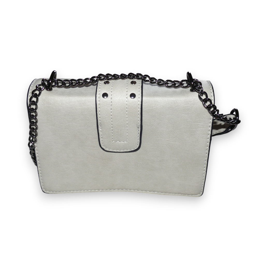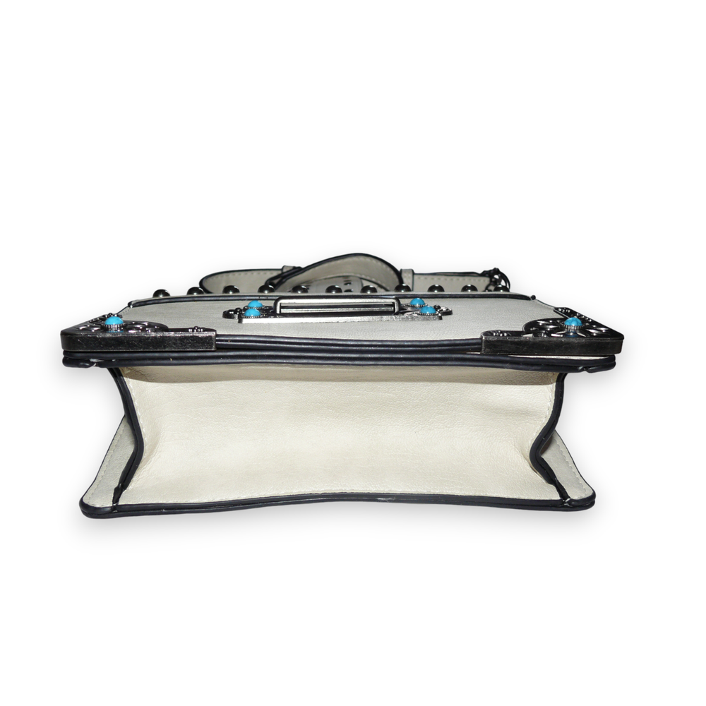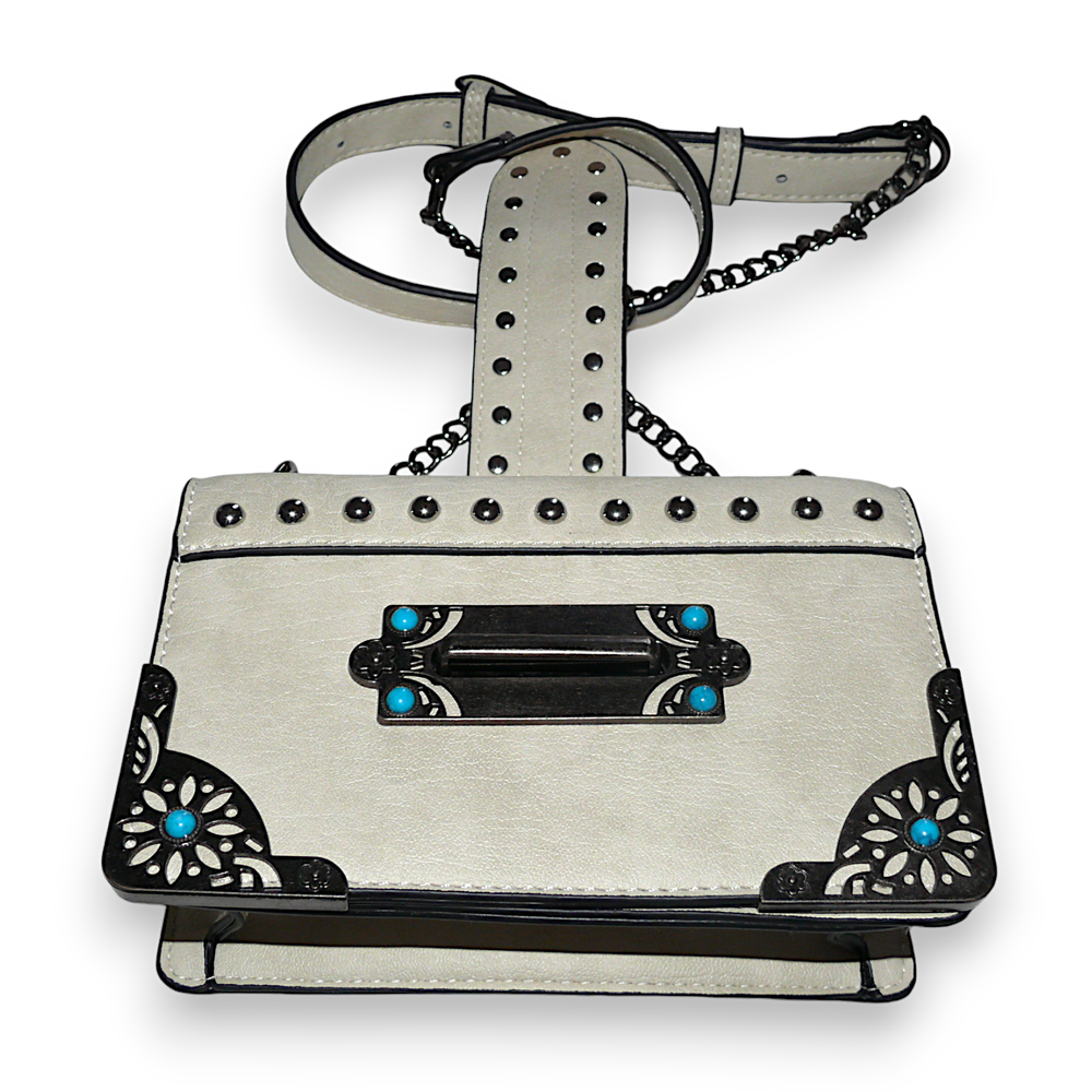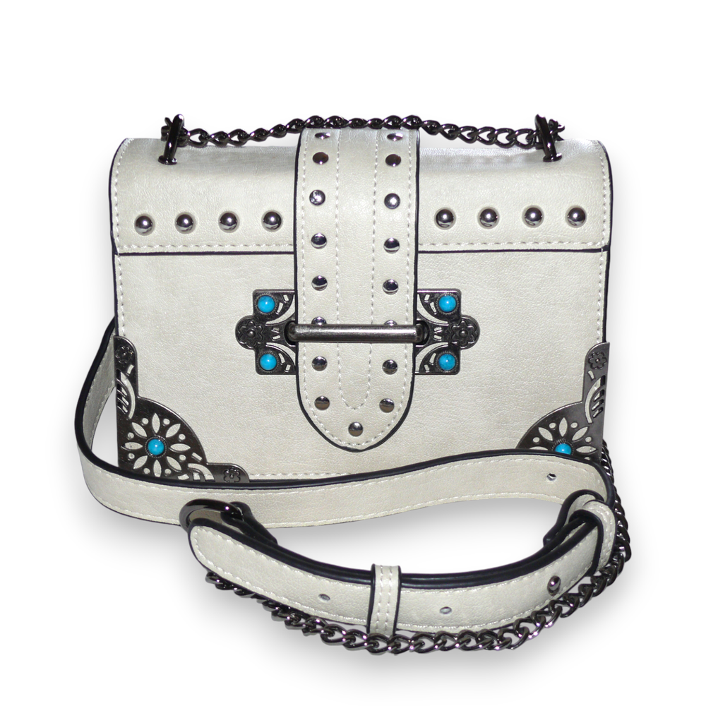 Venus handbag/cross body bag. Silver tone hardware with silver tone studs and faux turquoise cabs. Western themed. Chain and Polyurethane adjustable handle. Lined. One interior zippered pocket and two sections.