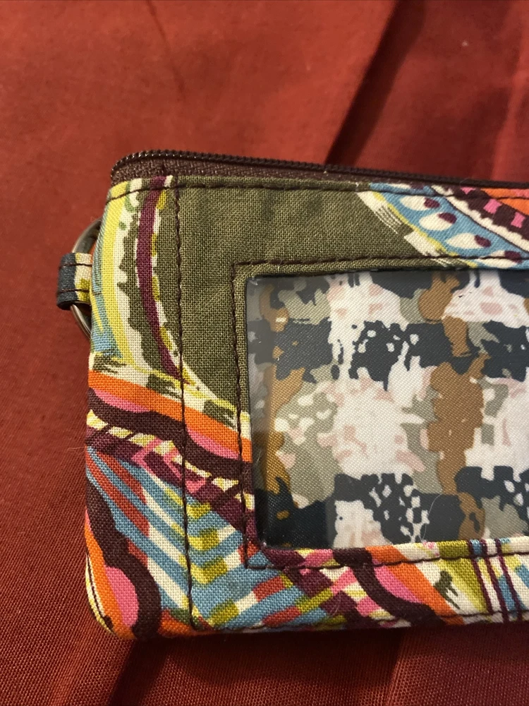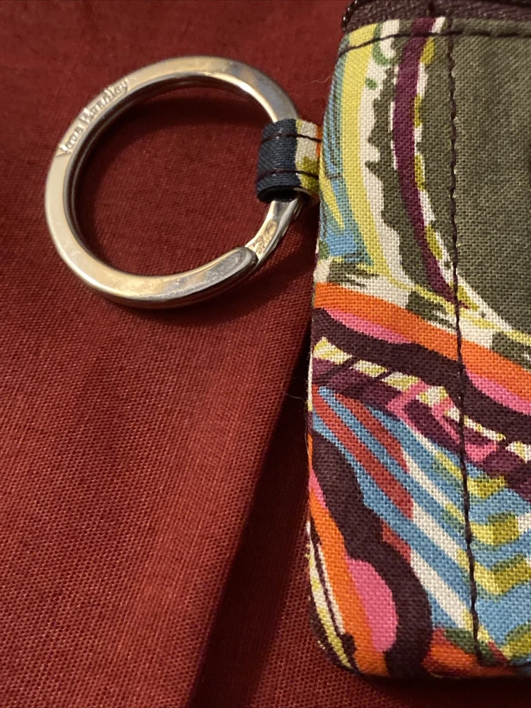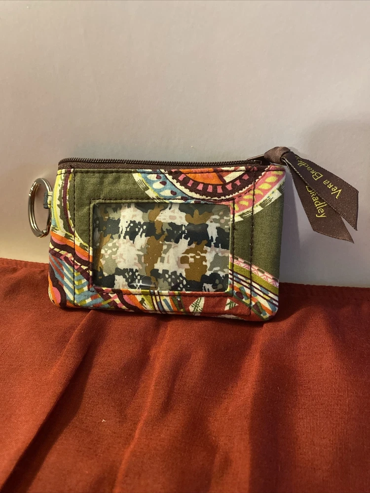 This Vera Bradley coin purse/ID pouch is a perfect accessory for any bohemian-themed outfit. The multicolor floral pattern on the cotton material adds a pop of color to your ensemble. Measuring 5 inches in length and 3 inches in width, it's a perfect size for your coin collection and ID cards. The key chain coin purse style is both practical and fashionable, with the added bonus of a Vera Bradley logo accent. This unit is made in China and is not vintage or handmade. It's a great addition to any woman's wardrobe, especially those who love the bohemian theme.