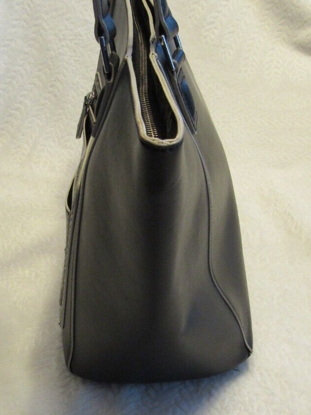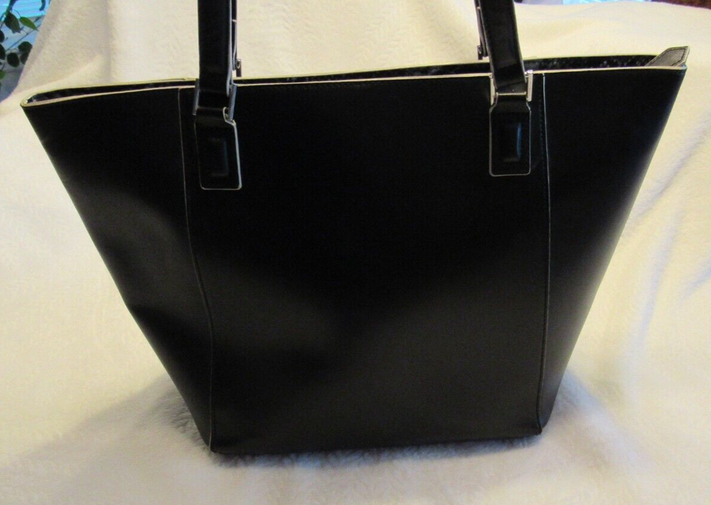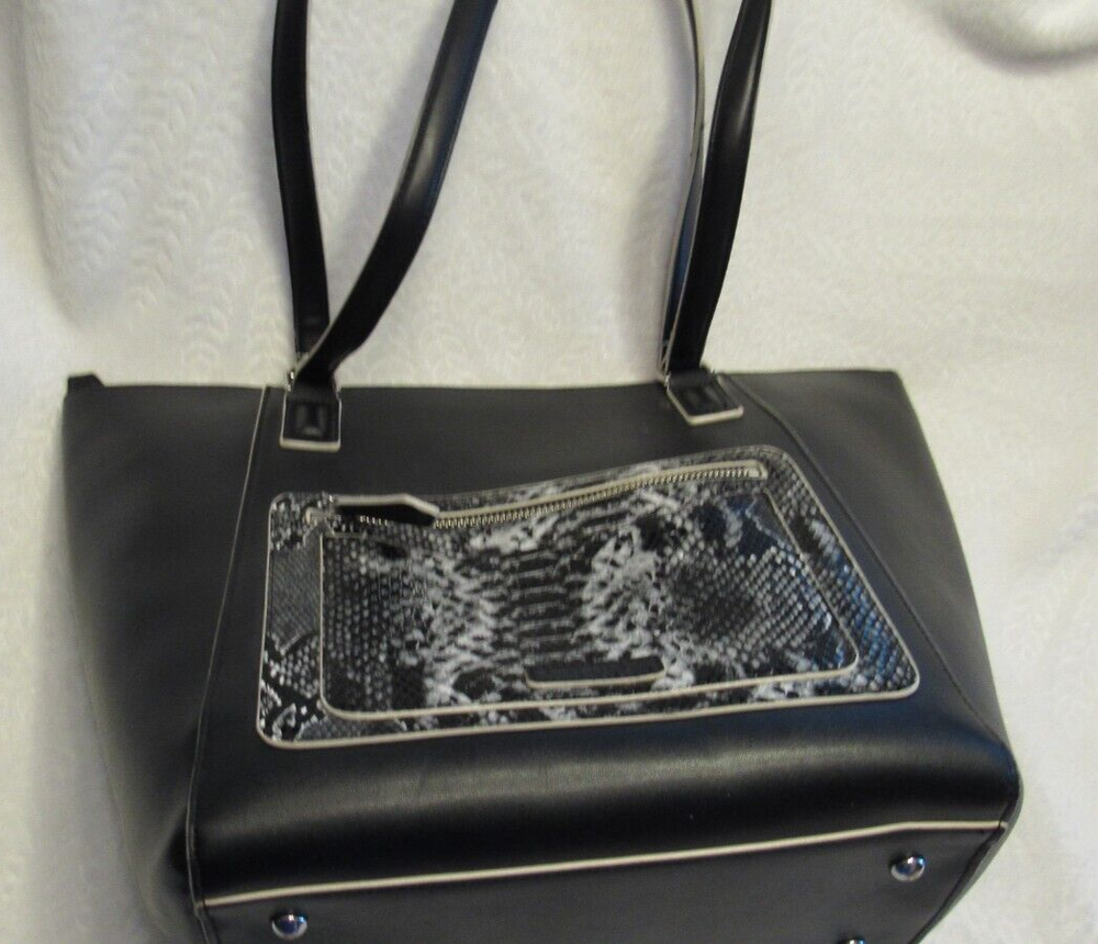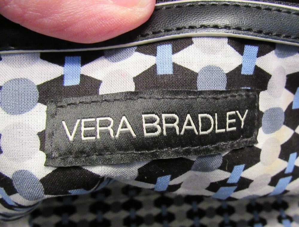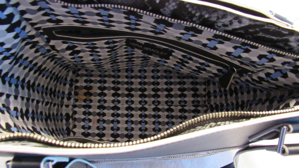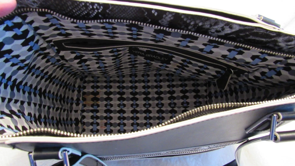 Vera Bradley Ella Tote Purse Bag Black Faux Leather Snake Print Women's Pre-owned in good condition - stain on inside bottom lining -see photos This stylish Vera Bradley Ella Tote in black faux leather features a unique snake print and is perfect for any occasion, whether it be for travel, workwear, or casual use. The tote has a zip closure and double handles with a 12-inch drop, making it easy to carry. It also has an outer zip pocket and an inner zip pocket for added convenience. The hardware is silver in color and the bag has a fabric lining in blue multi. The tote is medium-sized, measuring 10 inches in width, 12 inches in height, and 4.75 inches in depth. It is a rectangular shape and has a key holder as an accessory. The Vera Bradley Ella Tote is a part of the Vera Bradley Tote product line and has a snake theme. The bag is made in China and has a zip top.