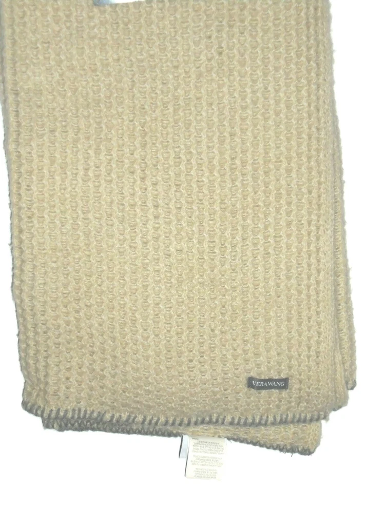 Vera Wang Heather Knit Throw size: 50" x 60" color: Beige acrylic / polyester blend knit machine washable soft luxurious knit for year round use whip-stitch detail on edges in grey zipE