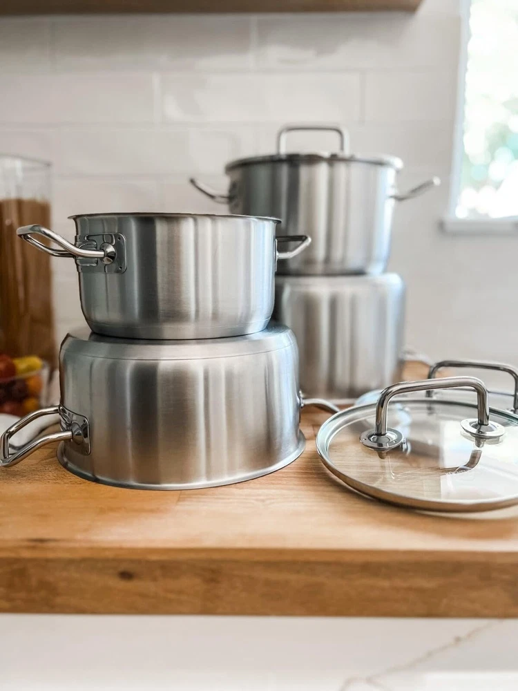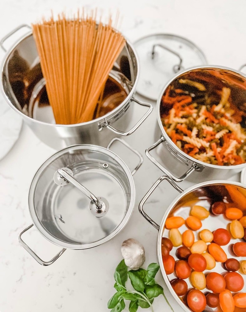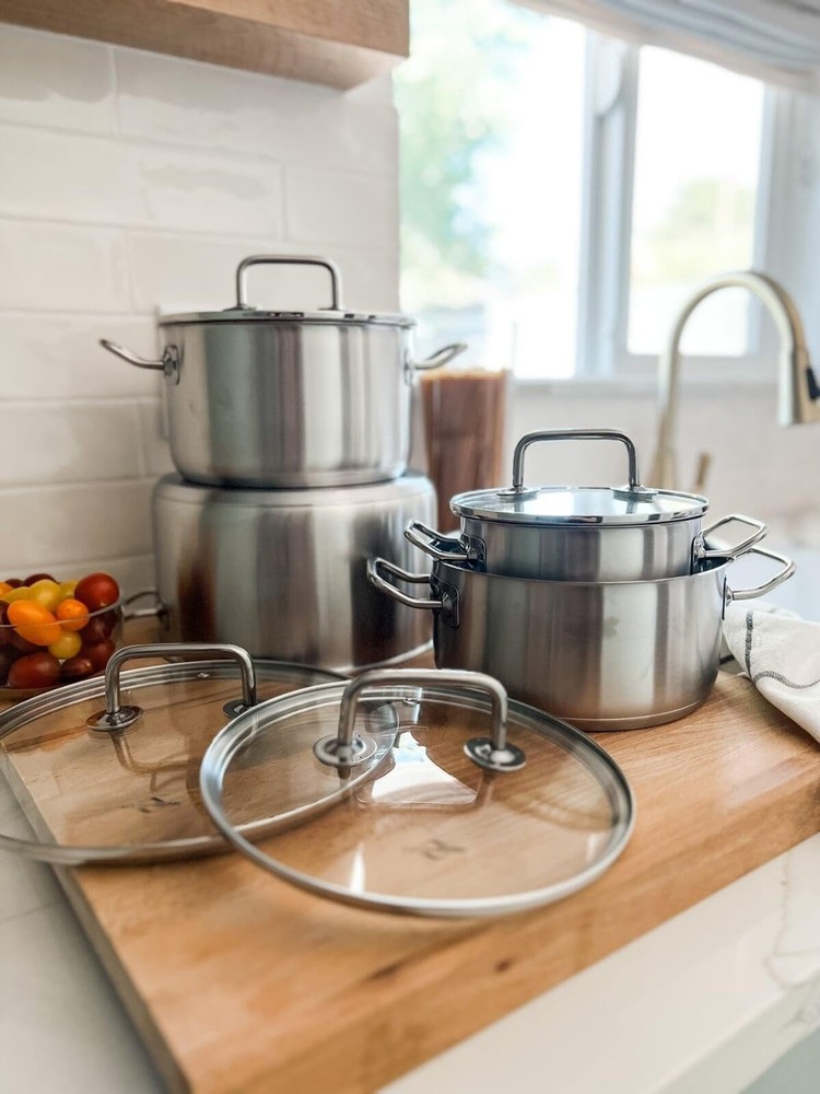 8-PIECE SET: This 8-piece set includes the following: 1-1.85 qt pot (6” x 3.5”) with lid, 1-3.7 qt pot (8” x 4.5”) with lid, 1-6.3 qt pot( 9.5” x 5.3”)with lid, and 1-3.2 qt pot(8” x 3.7”) with lid. These pots are made of 100% 18/8 stainless steel and each feature 2 comfortable oversized handles for easy lifting. For further convenience and precision, there are graduated ml markings on the inside of the pot. Each lid is designed to with safety glass and stainless steel handles. PROFESSIONAL GRADE: This set of 4 pots and lids are perfectly balanced and weighted with a comfortable, sturdy, and durable handle. Whenever you use our Verona Stainless Steel 8-piece pot set with clad bottom, you become a chef in your own kitchen. They have been designed to the highest quality standards with a clad bottom base and a welded handle. Stainless steel cookware doesn't get any better than this. The pots and lids are so well designed that you will be inspired to try new recipes often and without fuss! SUITABLE FOR ALL COOKTOPS: has the right cookware for every dish. High quality stainless steel provides cooking pleasure at the professional level. Whether you are steaming vegetables or heating soup stock for your latest recipe, these are the perfect cooking pot to use when prepping your next recipe. cookware is suitable for any stovetop, including gas, electric, and induction. Dishwasher safe. VERSATILE AND CONVENIENT: This dishwasher safe, stainless steel cookware is extra easy to clean. When quality cookware is this easy to care for, there's nothing stopping you from melting, boiling, or heating up any small batch recipe your imagination can dream up! TRADITION OF QUALITY: was founded in Germany in 1923. Designing top-tier items has distinguished this brand as one of the best in the industry. They strive to bring imagination and creativity to the home cook's kitchen and to enhance your overall cooking experience. Frieling has partnered with this brand since 2017 and proudly brings its premium quality hand tools, salt and pepper mills, and more to the US market.