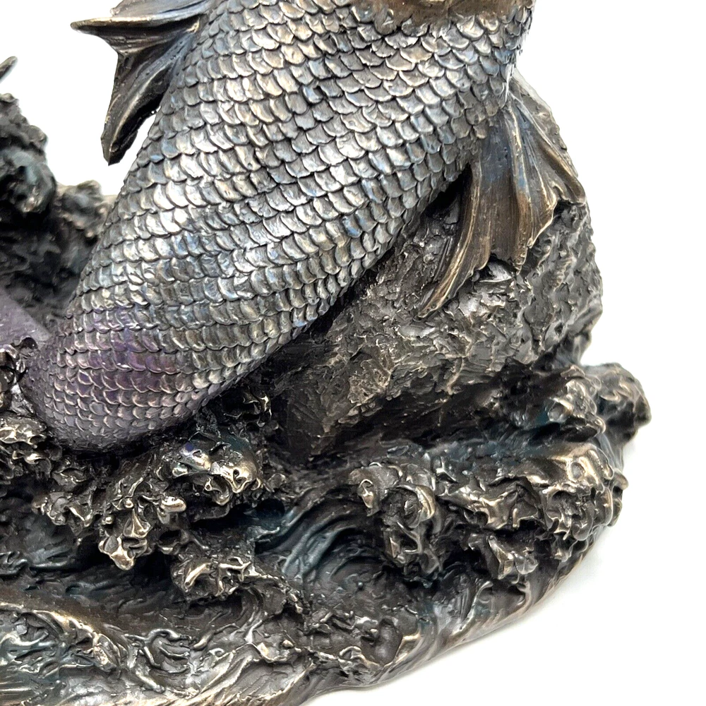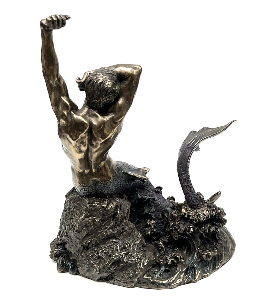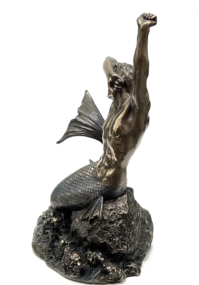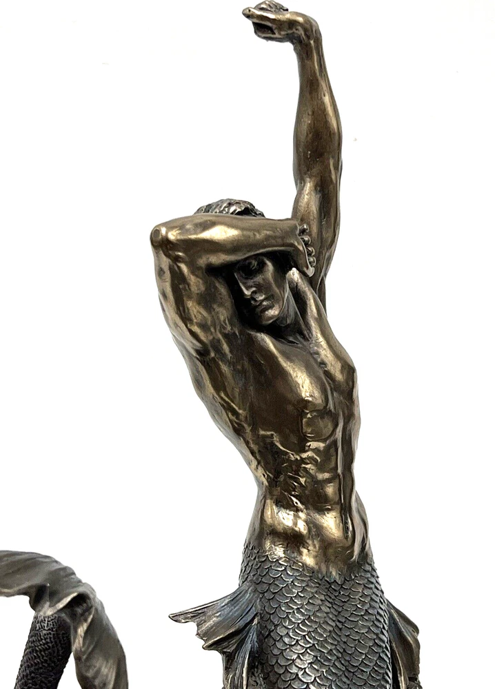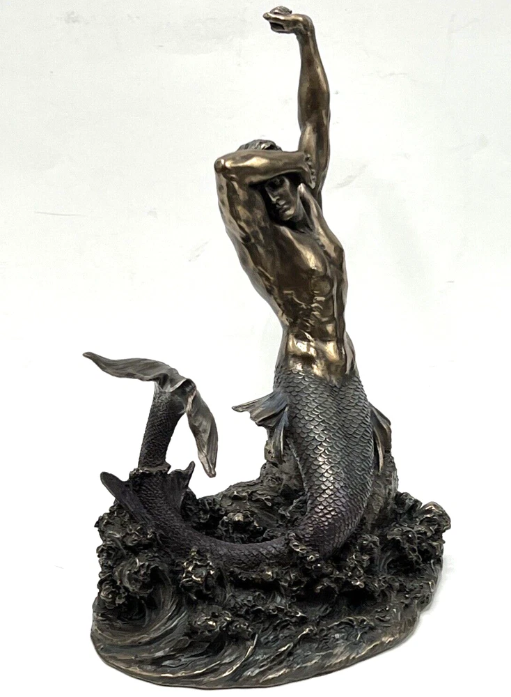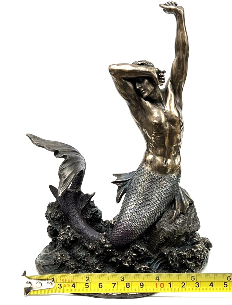 The Veronese Design Merman sculpture is a 7 7/8" tall piece made of bronze and resin, featuring a merman stretching on a rock. It has an antique bronze finish and an eclectic style, perfect for home decoration. The tabletop sculpture has dimensions of 4.25"D x 5.5"W x 7.5"H and weighs 1.4 pounds. Ideal for Mothers or Father's Day, it adds an architectural theme to any space. I will pack with care and get it to you ASAP /thanks for looking !