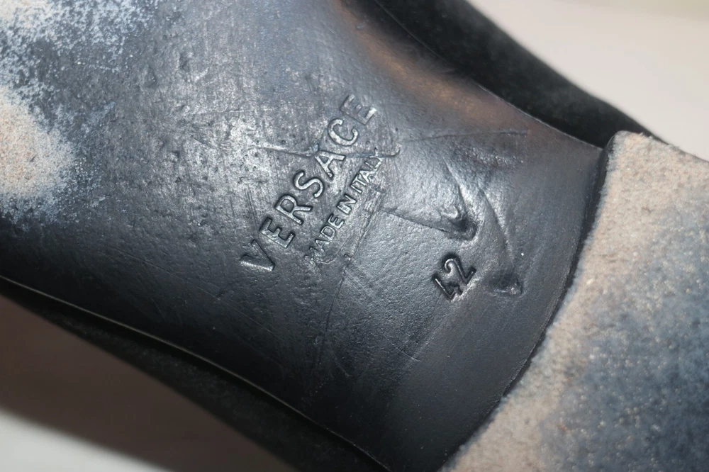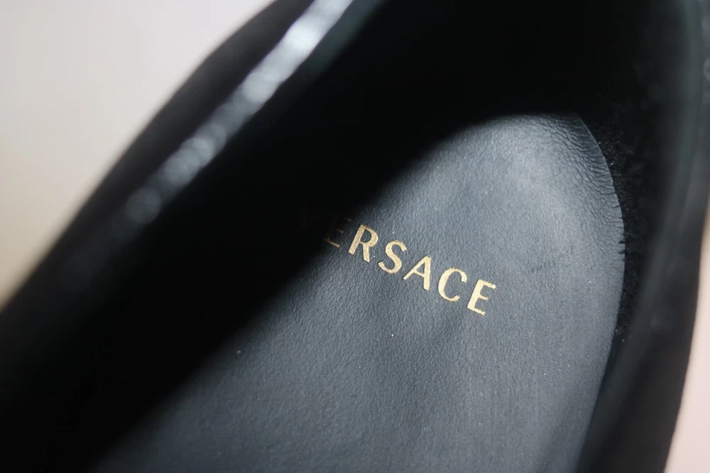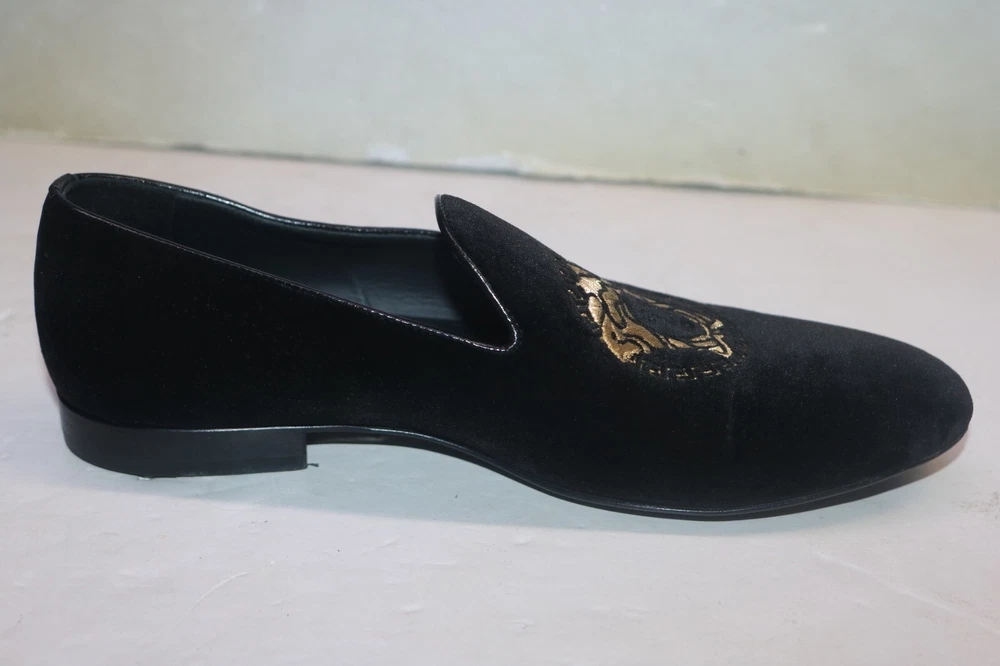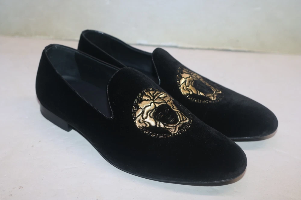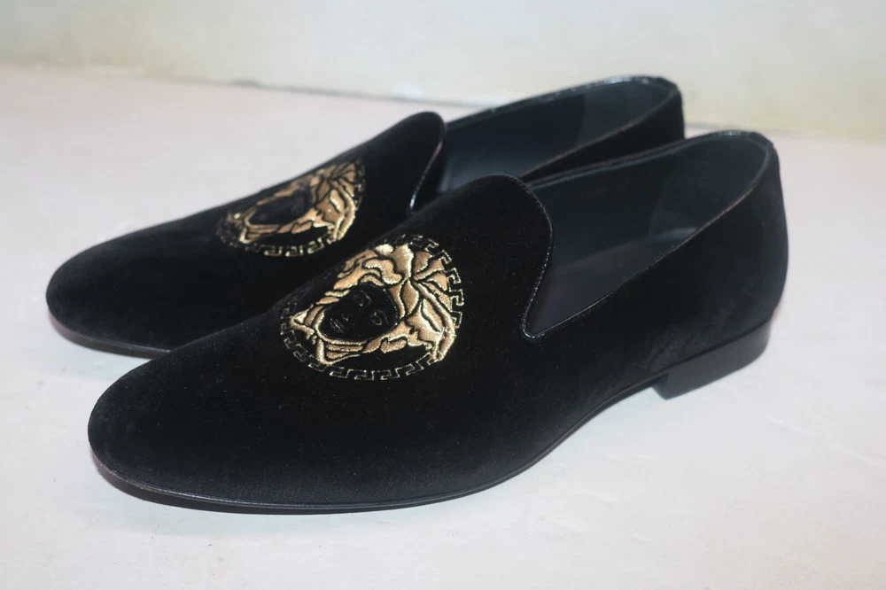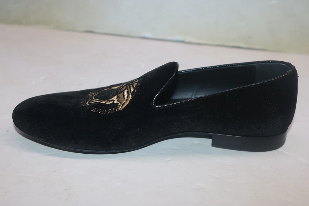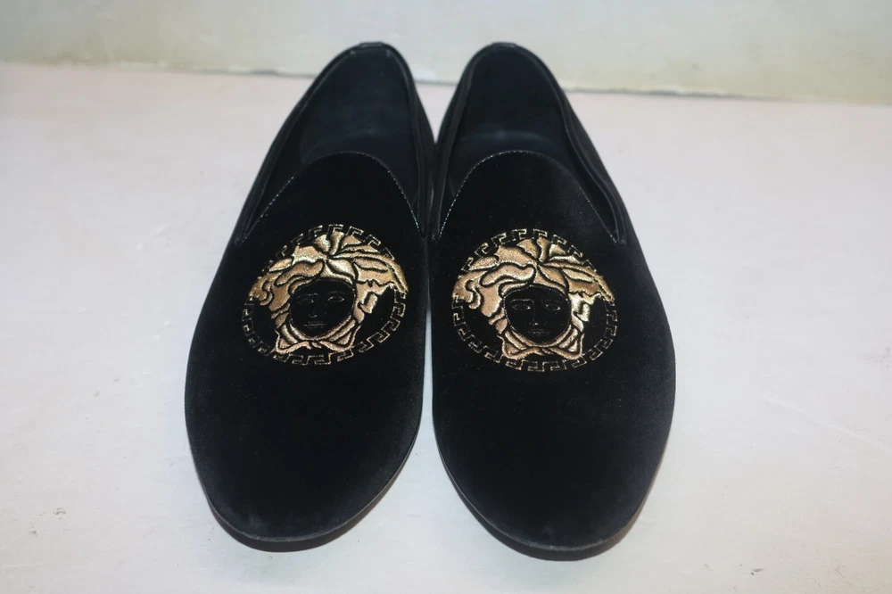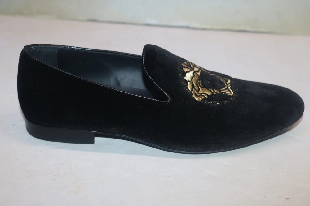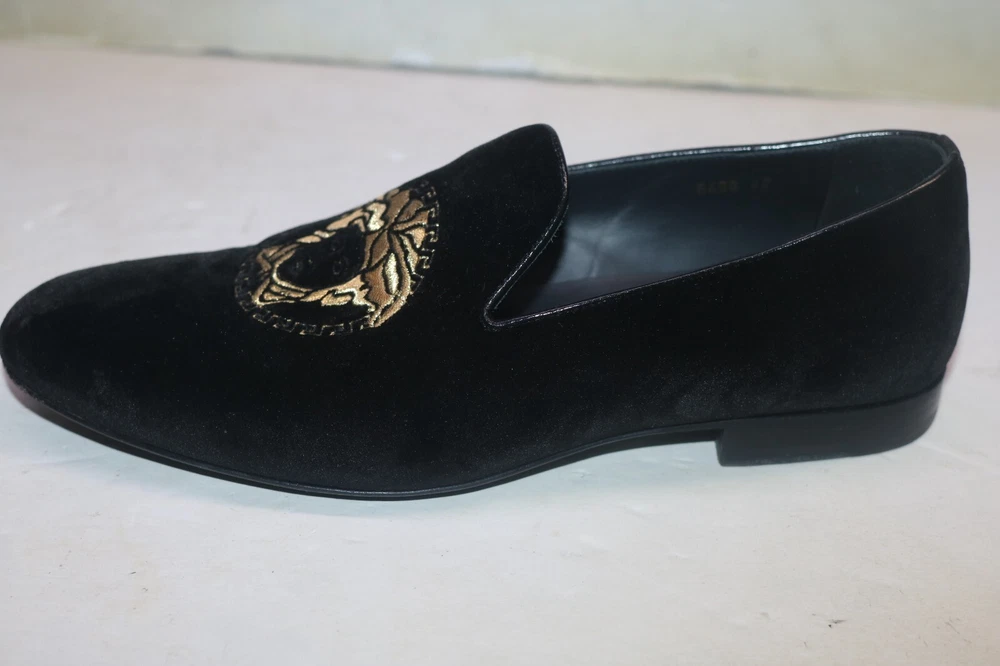Versace Men's Black Velvet Medusa Head Gold Logo Loafers Size 42 Black velvet Smooth leather trims and interior Golden embroidered Medusa logo Slip on Flat stacked heel Made in Italy Size 42 (according to Versace shoe size chart is 9 US Men's size) A10