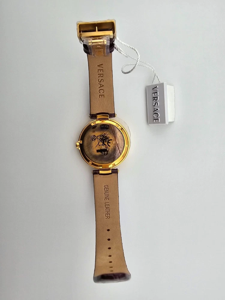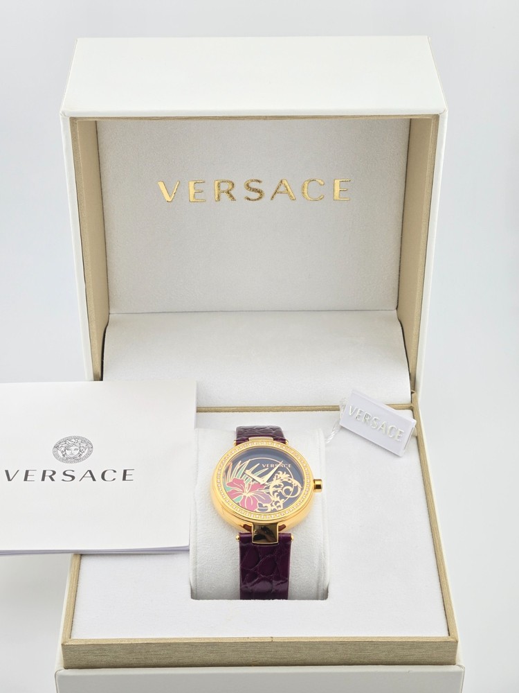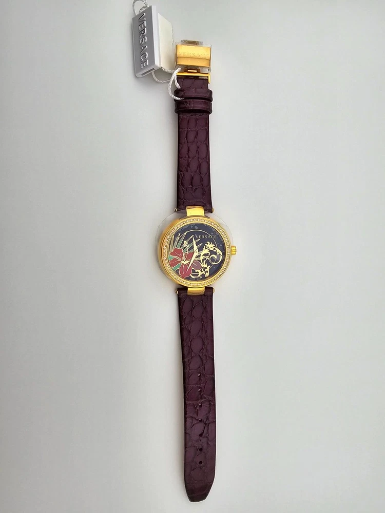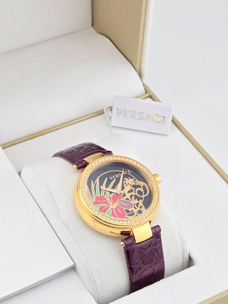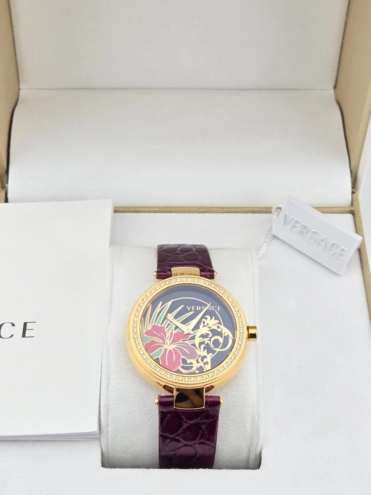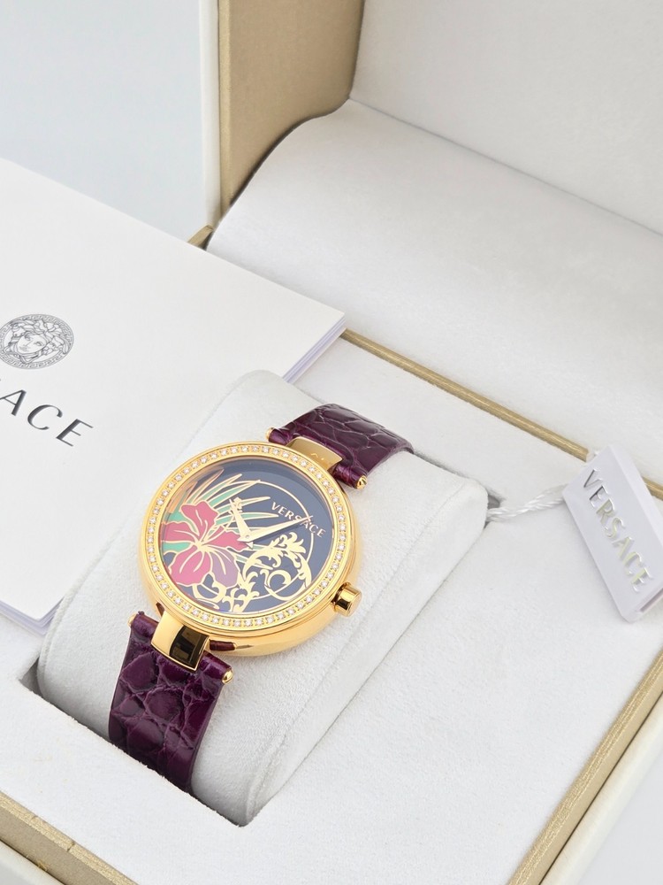 Versace Mystique Hibiscus Flower Dial Purple Watch – 19Q81D9HI-S702 ($5400 MSRP) New with Original Box and Tags! This watch is a Shelf Pull from one of the Major Department Stores. May find few micro scratches on the watch case/band, visible under a direct and strong light. Indulge in the allure of high fashion with the Versace Mystique Hibiscus Flower Dial Purple Watch – 19Q81D9HI-S702, a masterpiece that seamlessly blends opulence with sophisticated design. The watch features a striking gold PVD stainless steel case, which is elegantly complemented by a sumptuous purple leather strap. The fixed gold PVD bezel, adorned with dazzling diamonds, accentuates the luxurious nature of this timepiece, while the 38mm round case shape ensures a flattering fit on any wrist. The focal point of this exquisite watch is its unique hibiscus flower baroque dial, which is a testament to Versace's commitment to artistry and innovation. The dial's rich purple hue is beautifully contrasted by the gold-tone hands, adding a touch of regal elegance. With no markers to distract from its pure design, this analog watch emphasizes its sophisticated simplicity. Equipped with a scratch-resistant sapphire crystal and a water resistance of up to 50 meters, this watch offers both style and practicality. The quartz movement guarantees precise timekeeping, while the fold-over clasp ensures a secure and comfortable fit. Perfect for those who appreciate luxury and artistry, the Versace Mystique Hibiscus Flower Dial Purple Watch is a statement piece that combines timeless elegance with modern functionality. Features Gold PVD stainless steel case with a purple leather strap. Fixed gold PVD bezel set with diamonds. Hibiscus flower baroque dial with gold-tone hands. No markers. Dial Type: Analog. Quartz movement. Scratch resistant sapphire crystal. Pull / push crown. Solid case back. Case diameter: 38 mm. Round case shape. Fold over clasp. Water resistant at 50 meters / 165 feet. Functions: hour, minute. Fast and Free Shipping You're already purchasing the item. Why pay additional for shipping, especially slow shipping? We get your order shipped out within 1-business day and delivered to your doorstep as quickly as possible. Competitive Pricing With our dynamic pricing model, our prices are always competitive. Our prices are some of the lowest that you will find on the internet. Rest assured that you're getting a good deal when purchasing with us. 30-day Money Back Guarantee We are committed to making sure that you leave this transaction satisfied. If you're unhappy with the product for any reason, you may return it back for your money-back or a replacement within 30 days. No questions asked!