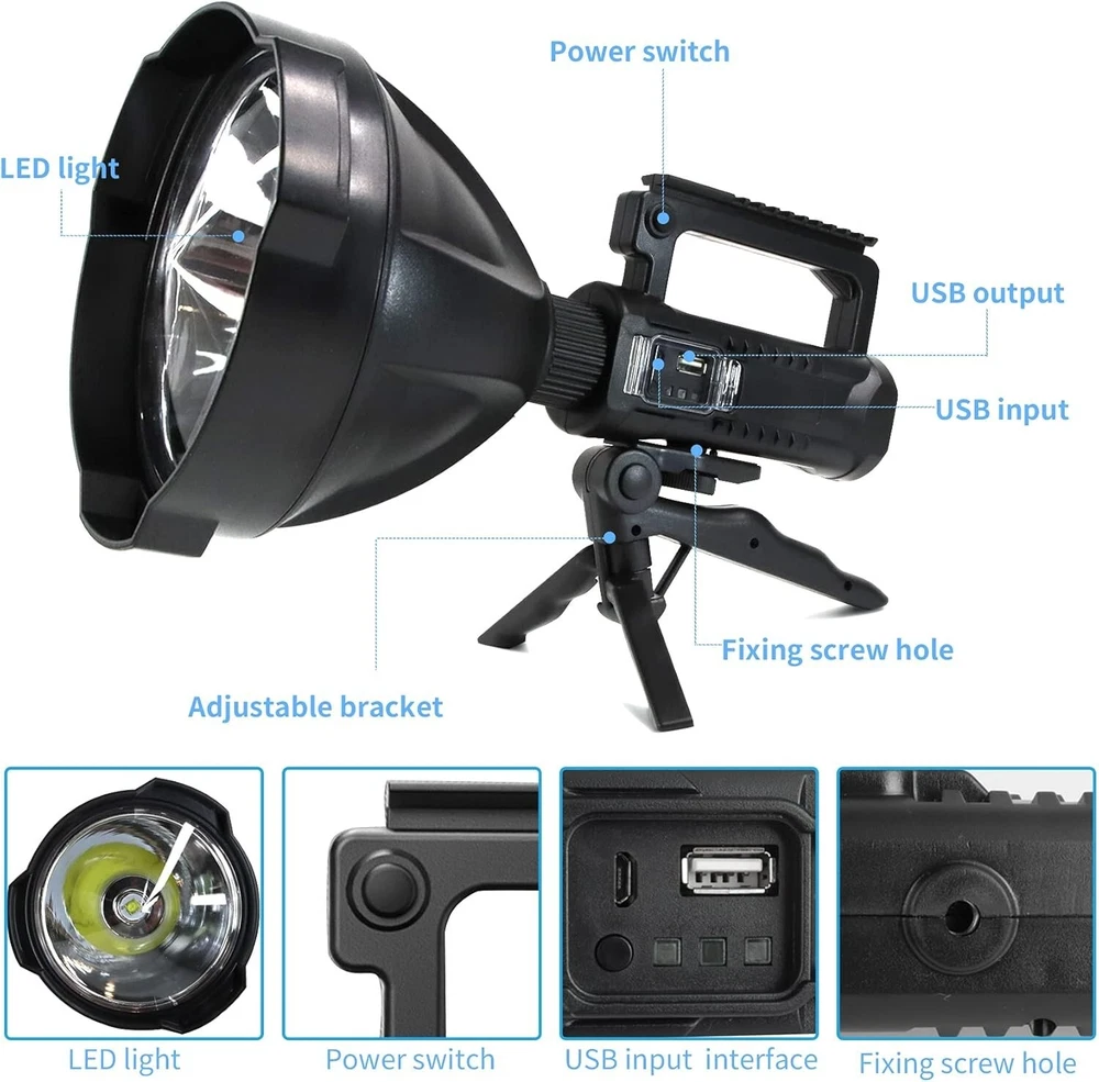 Versatile 120000 Lumen LED Flashlight - 4 Modes & 360° Tripod for Outdoor Uses ‹ › ‹ › ‹ › ‹ › ‹ › ‹ › ‹ › ‹ › ‹ › Versatile 120000 Lumen LED Flashlight Super Bright X-Large Spotlight Flashlight: Upgraded XHP90.2 LED chips deliver an astounding 120,000 lumens, offering a focused beam with a remarkable lighting distance of over 3280 ft (1000 m). Perfect for illuminating even the darkest nights with a powerful 8000mAh battery that lasts all night. 4 Light Modes & IPX5 Waterproof: Customize your lighting with 4 modes: High, Medium, Low, and Strobe. Its IPX5 rating makes this tactical flashlight resilient in harsh weather conditions, ensuring reliable functionality in rain or snow. (Note: Avoid submerging in water.) USB Rechargeable & Power Display: This spotlight features a built-in large-capacity rechargeable battery with an impressive working time of up to 10 hours on the low setting. The USB output port allows you to charge other devices, while the power display keeps you informed about remaining battery life. Super Durable & Lightweight: Constructed from high-grade ABS and aluminum alloy, this spotlight is designed to withstand drops and high-altitude falls. The adjustable hands-free tripod provides versatility, making it ideal for camping, hiking, sailing, or hunting adventures. Lifetime Guarantee: Package includes: 1 Rechargeable Spotlight, 1 Foldable Tripod, and worry-free 2 years of free replacement service with 24/7 online support to ensure your satisfaction. High Beam & Long Lasting Spotlight: Enjoy a long-lasting high lumen output, rechargeable over 1000 times. This flashlight doubles as an emergency power supply for devices like smartphones and PCs, enhancing convenience during outdoor activities. 360° Rotating Tripod & Handheld Spotlight: The removable tripod allows for hands-free use or handheld operation, perfect for various activities from fishing and camping to dog walking and cave exploring. Lightweight & Impact Resistant: This robust design ensures portability and protection from bumps and drops, making it perfect for all types of outdoor excursions. Why Choose Our Versatile Flashlight? Empower your outdoor adventures with the ultimate in lighting technology! The 120,000 lumen LED Flashlight stands as a beacon of reliability and brilliance, engineered for those who demand the best. Whether you're in need of powerful illumination for a late-night hike or need a dependable light source for emergencies, this is your go-to solution. With its impressive durability, multifunctionality, and the convenience of USB charging, this spotlight flashlight is more than just light—it's an essential companion. Illuminate your path and embrace the adventure! Shipping Free & Fast Shipping - We offer free shipping to most of the USA with a normal delivery time of 3-7 days. However, due to the current situation, additional delivery time (up to 3 weeks) may be required for some items. Alternative Carriers - We may use alternative carriers (e.g. USPS, FedEx, UPS, etc.) to ensure your package arrives safely and on time. Due to the use of multiple carriers, we are unable to provide a tracking number automatically. Handling Time - Orders are processed and shipped within 1-2 business days of receiving cleared payment. Shipping Restrictions - Shipping to Alaska, Hawaii, Puerto Rico, Guam, and other US territories may incur shipping charges or delivery restrictions. Please contact us before ordering, or your order can be refunded/cancelled. State Restrictions - There may be restrictions based on your state of purchase. For example, certain items may not be shipped to California due to state regulations. Contact for Tracking Updates - If you require tracking updates or have any concerns about the delivery of your order, please feel free to contact us, and we will be happy to assist you. Return Please see our eBay Return Policy. Thank you. Payment We accept all major credit cards, PayPal, and Apple Pay for your convenience. Your payment information is secure and encrypted to ensure a safe and seamless transaction. Please complete your payment within 3 days of purchase to avoid any delays in shipping. Feedback Your feedback is extremely important to us. We strive to provide the best products and customer service possible. If you are satisfied with your purchase, please take a moment to leave us a positive review. If you have any concerns or issues with your order, please contact us before leaving negative feedback. We are committed to resolving any problems and ensuring your satisfaction. Contact Us If you have any questions or concerns, please feel free to reach out to our customer support team. You can contact us through the eBay messaging system. We are available Monday to Friday, 9:00 am to 5:00 pm EST, and we will do our best to respond to your inquiry within 24 hours. Thank you for supporting our small family business! UPC: Not Set Voltage: 110 volts (ac) Item Height: Not Set Item Length: Not Set Item Weight: 2.1 pounds Item Width: Not Set Model: Not Set Lumens: 120000 Number of LEDs: Not specified Unit Quantity: 1 Material: ABS,Aluminum Features: Batteries Included,Rechargeable,IPX5 Waterproof,4 Light Modes,USB Rechargeable,Power Display,Adjustable Tripod,Lightweight,Impact Resistant,Drop Resistant,Durable Brand: Unbranded Type: Flashlight Lighting Technology: LED Power Source: Battery Operating Range: 1000 m MPN: Not Set Battery Technology: Lithium Number of Batteries: 1 Color: Black Country/Region of Manufacture: Not Set Operating Time: 5-10 Hours IP Rating: Not Set Number of Lights: 1-3 Unit Type: lb Personalize: Not Set