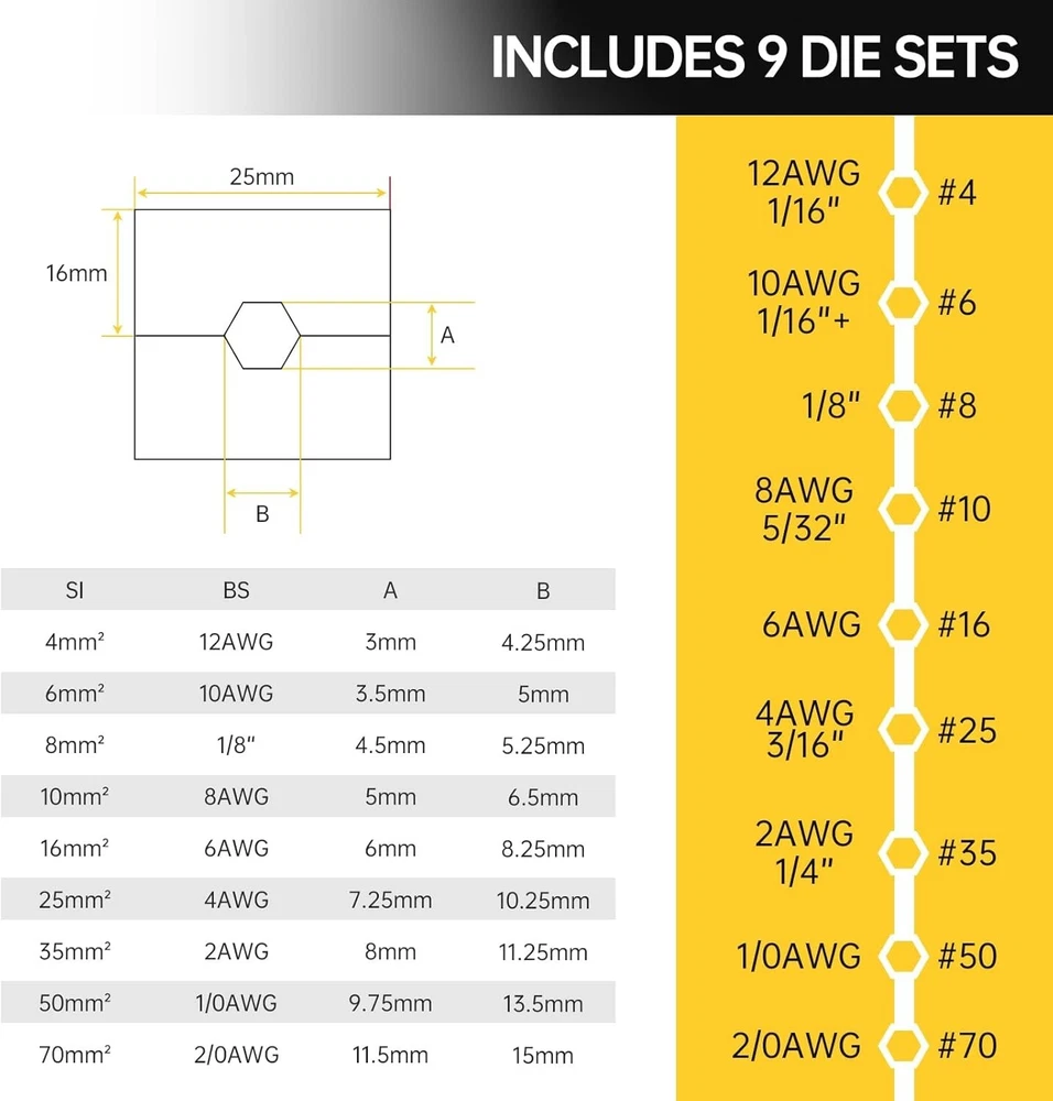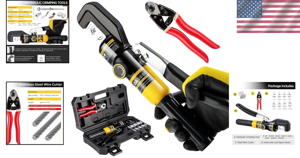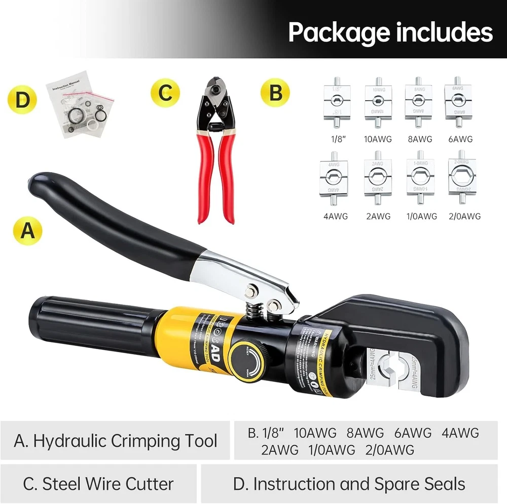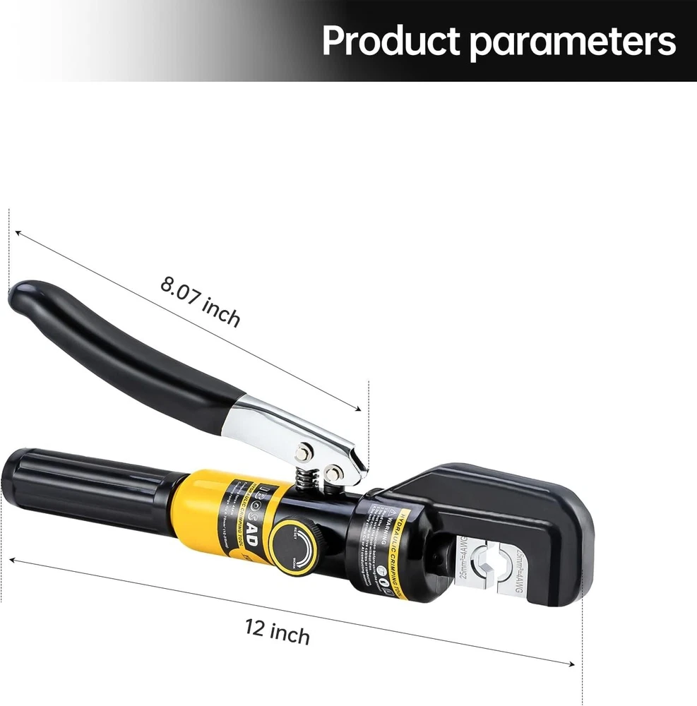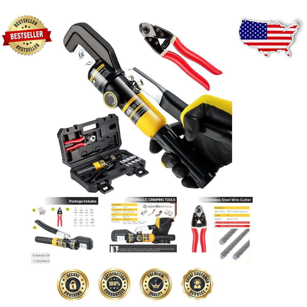 Versatile Hydraulic Crimping Tool with 180° Rotating Head & Cable Cutter ‹ › ‹ › ‹ › ‹ › ‹ › ‹ › ‹ › ‹ › Versatile Hydraulic Crimping Tool Your ultimate solution for precision crimping and cutting. This tool features a 180° rotating head to maneuver even in tight spaces effortlessly. Key Features: Crimping range: 12 AWG to 2/0 AWG Steel Wire Cutter: Cuts up to 5/32" stainless steel cable Includes 9 pairs of hexagon crimping dies (sizes: 12, 10, 8, 6, 4, 2, 1/0, and 2/0 AWG; and 1/8" for stainless steel wire rope) Ideal for battery, welding cables, power wires, and electrical cables 180° rotating head for versatile use in narrow spaces Innovative Design: Collet structure increases mold guide to eliminate any shaking during the crimping process Overall quenching technology ensures a strong and durable pliers head, built to withstand rigorous use Handle return spring mechanism allows easy one-handed operation, making it effortless to complete crimping tasks independently Quality Assurance: Our products undergo strict double-checking before leaving the factory, ensuring reliability and superior performance every time. Should you encounter any quality issues, our dedicated support team is here to assist you. Why Choose Our Hydraulic Crimping Tool? When it comes to crimping and cutting, don't settle for anything less than exceptional. Our versatile Hydraulic Crimping Tool is designed for both precision and convenience, making it the perfect choice for professionals and DIY enthusiasts alike. With robust features and a user-friendly design, you can work confidently, knowing that this tool is dependable for all your crimping needs. Enhance your toolkit with our advanced crimping tool today—your future projects will thank you! Shipping Free & Fast Shipping - We offer free shipping to most of the USA with a normal delivery time of 3-7 days. However, due to the current situation, additional delivery time (up to 3 weeks) may be required for some items. Alternative Carriers - We may use alternative carriers (e.g. USPS, FedEx, UPS, etc.) to ensure your package arrives safely and on time. Due to the use of multiple carriers, we are unable to provide a tracking number automatically. Handling Time - Orders are processed and shipped within 1-2 business days of receiving cleared payment. Shipping Restrictions - Shipping to Alaska, Hawaii, Puerto Rico, Guam, and other US territories may incur shipping charges or delivery restrictions. Please contact us before ordering, or your order can be refunded/cancelled. State Restrictions - There may be restrictions based on your state of purchase. For example, certain items may not be shipped to California due to state regulations. Contact for Tracking Updates - If you require tracking updates or have any concerns about the delivery of your order, please feel free to contact us, and we will be happy to assist you. Return 30-Day Hassle-Free Returns - We want you to be completely satisfied with your purchase. If you are not, you can return the item within 30 days of receiving it for a full refund or exchange. Easy Return Process - To start a return, simply contact us and we will provide you with a prepaid return shipping label and detailed instructions. Restocking Fee - There are no restocking fees for returns. However, the buyer is responsible for return shipping costs if the return is not due to a seller's error. Refund Processing Time - Refunds will be processed within 5 business days of receiving the returned item in its original condition. Payment We accept all major credit cards, PayPal, and Apple Pay for your convenience. Your payment information is secure and encrypted to ensure a safe and seamless transaction. Please complete your payment within 3 days of purchase to avoid any delays in shipping. Feedback Your feedback is extremely important to us. We strive to provide the best products and customer service possible. If you are satisfied with your purchase, please take a moment to leave us a positive review. If you have any concerns or issues with your order, please contact us before leaving negative feedback. We are committed to resolving any problems and ensuring your satisfaction. Contact Us If you have any questions or concerns, please feel free to reach out to our customer support team. You can contact us through the eBay messaging system. We are available Monday to Friday, 9:00 am to 5:00 pm EST, and we will do our best to respond to your inquiry within 24 hours. Buy it now and enjoy a pleasant shopping experience! UPC: Not Set MPN: Not Set Unit Quantity: 7.8 Brand: Unbranded Sheath Color: Silver Country/Region of Manufacture: Not Set Unit Type: lb