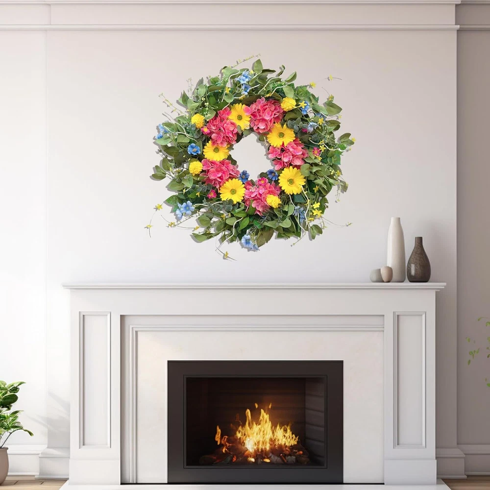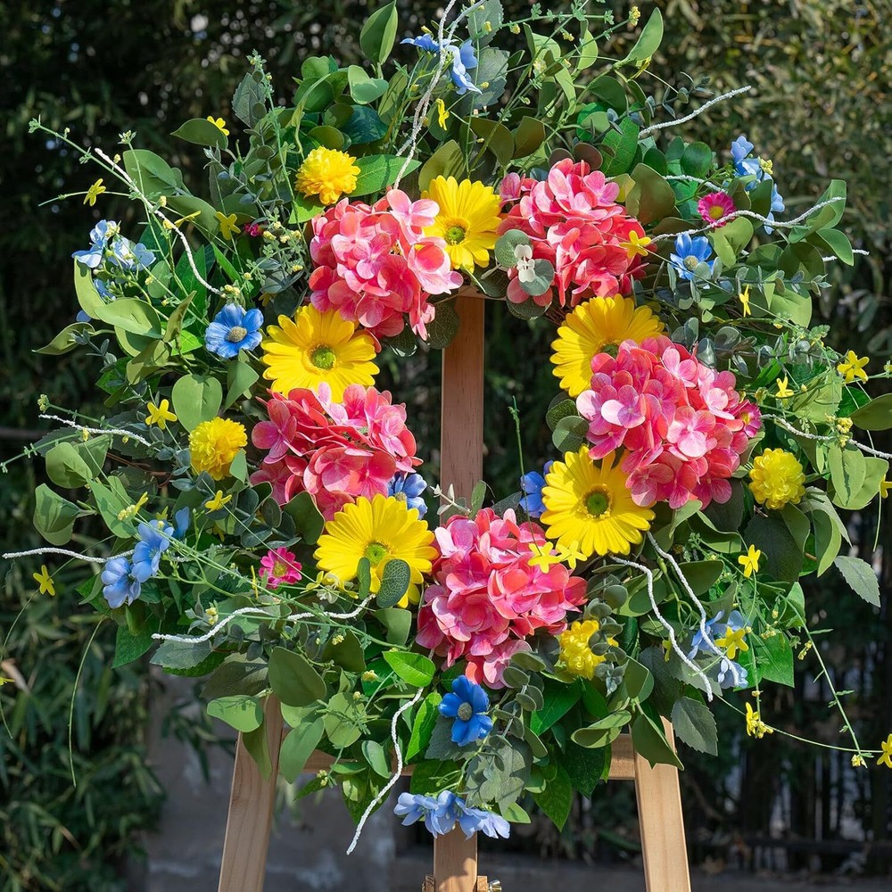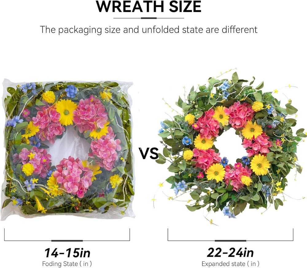 24 Inch Spring Wreaths for Front Door Summer Wreath with Vibrant Dahlia, Gerbera Daisy & Primula Floral Arrangement - All Seasons Summer & Spring Door Wreath for Outside Decor Item Description About this item Vibrant Spring & Summer Design: Brighten your home with this 24-inch floral wreath, showcasing a stunning mix of colorful wildflowers, eucalyptus leaves, and lush greenery. Perfect for adding a fresh, natural touch to your front door, porch, or living room, this wreath is ideal as a spring wreath, summer wreath, or all-season decor piece. Versatile Use for Any Space: This wreath is perfect as a front door wreath, indoor wall decoration, or outdoor weatherproof decor. Designed to complement all styles—whether farmhouse, rustic, or contemporary—it’s a versatile choice for both indoor and outdoor settings. Durable & Weatherproof Materials: Made with premium silk flowers and sturdy greenery, this outdoor wreath is fade-resistant and built to withstand the elements, ensuring long-lasting beauty in any season—rain or shine. Perfect for year-round use or as a spring wreath for outdoor decor. Perfect Size for Doors & Walls: With a 24-inch diameter, this large wreath fits most standard doors and spaces, making it an ideal centerpiece for home decor, weddings, or special events. A standout choice among spring and summer wreaths for its versatility and eye-catching design. Low-Maintenance Beauty: Unlike fresh flowers, this greenery wreath requires no watering or upkeep, offering timeless elegance with zero effort. Perfect for clearance wreath lovers or anyone looking to add effortless style to their everyday home decor. Easy Maintenance & Excellent Customer Support: This artificial wreath requires no special cleaning—simply wipe it with a dry cloth to keep it looking fresh. If you encounter any issues, our dedicated customer service team is here to help. Contact us anytime, and we’ll provide a prompt and satisfactory solution! Easy to Adjust & Secure Packaging: To ensure safe delivery, this large spring wreath is carefully packed in a sturdy 14-inch box. Before hanging, simply follow the included instruction card to fluff and adjust the grapevine base, restoring it to its full, beautiful shape for a stunning display on your front door! › See more product details Payment We accept payment only through PAYPAL Shipping We ship products worldwide through standard express courier service, it will reach within 7 to 10 days to abroad buyers, we ship the product after recieved clear payment and give full information about shipment to the buyer Return We accept product return within 7 to 21 days from delivery date but product should be in original position and not in damaged condition,the return shipping charges will be buyer responsibility