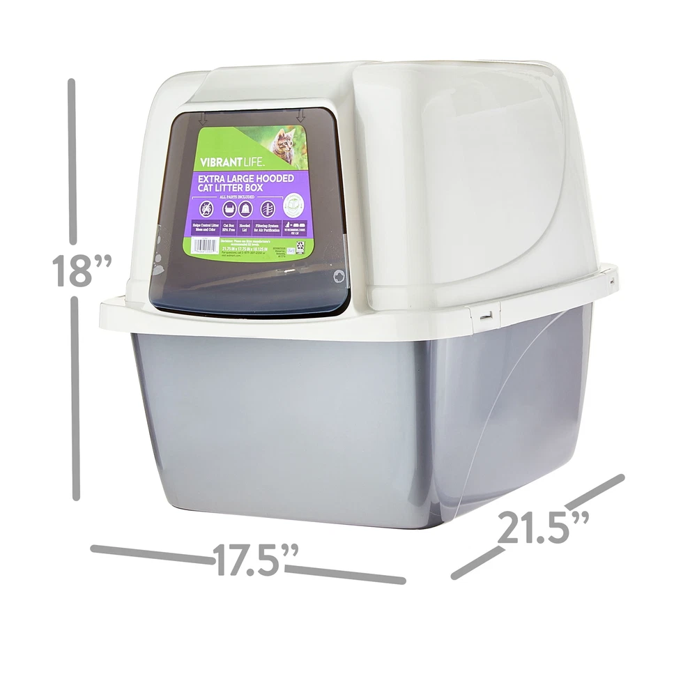 With our Extra Large Hooded Cat Litter Box, not only will your cat feel more comfortable as they tend to their business, but your home will experience the benefits as well. Compared to your cat's usual litter box, the covered design helps your cat feel a higher sense of protection as they let their guard down as well as it helps keep their business hidden away and out of sight. Inside is a filtering system for air purification to keep any odors to a minimum so both you and your cat can breathe easy. The box itself is BPA free and helps control litter mess to ensure a clean-kept environment for yourself as well as your cat. Keep your home and your cat happy by replacing your litter box with this Extra Large Hooded Cat Litter Box. Help your pets live the Our products are specially crafted with one goal in mind, seeing your pet at its very best. With a variety of offerings designed to keep animals healthy, happy and energized, stands out as the brand that truly puts your pet first. Extra Large Hooded Cat Litter Box Covered air purifying litter box Dimensions: 21.75" x 17.75" x 18.125" Cover features a non-flexible build with a hinged door for your cat to slip easily in and out through Air purification system works by filtering the air inside of the box Helps control litter mess and odor BPA free Vet recommends 2 pans per 1 cat