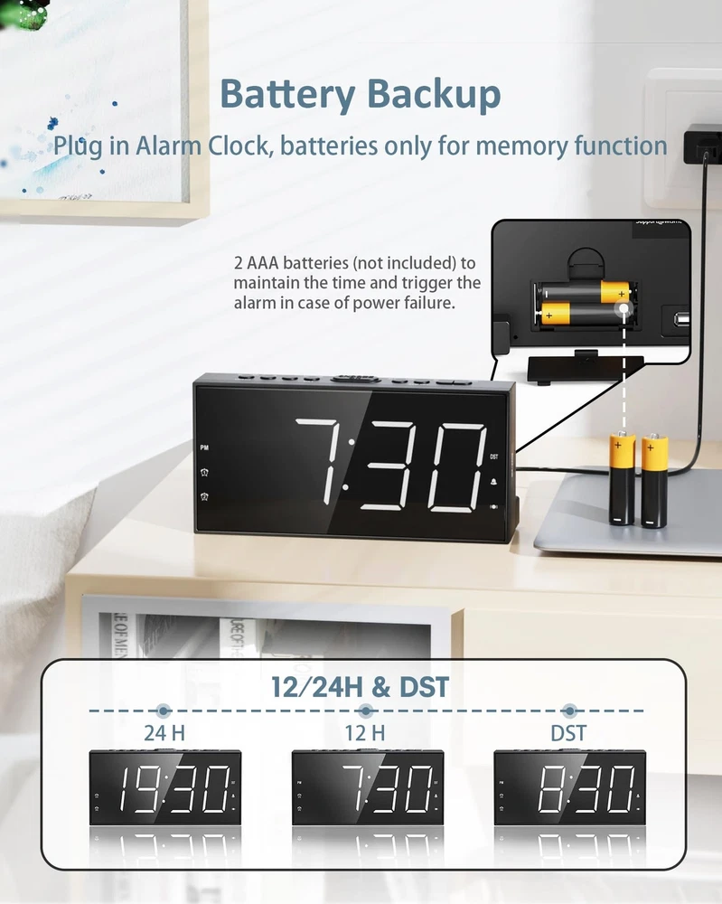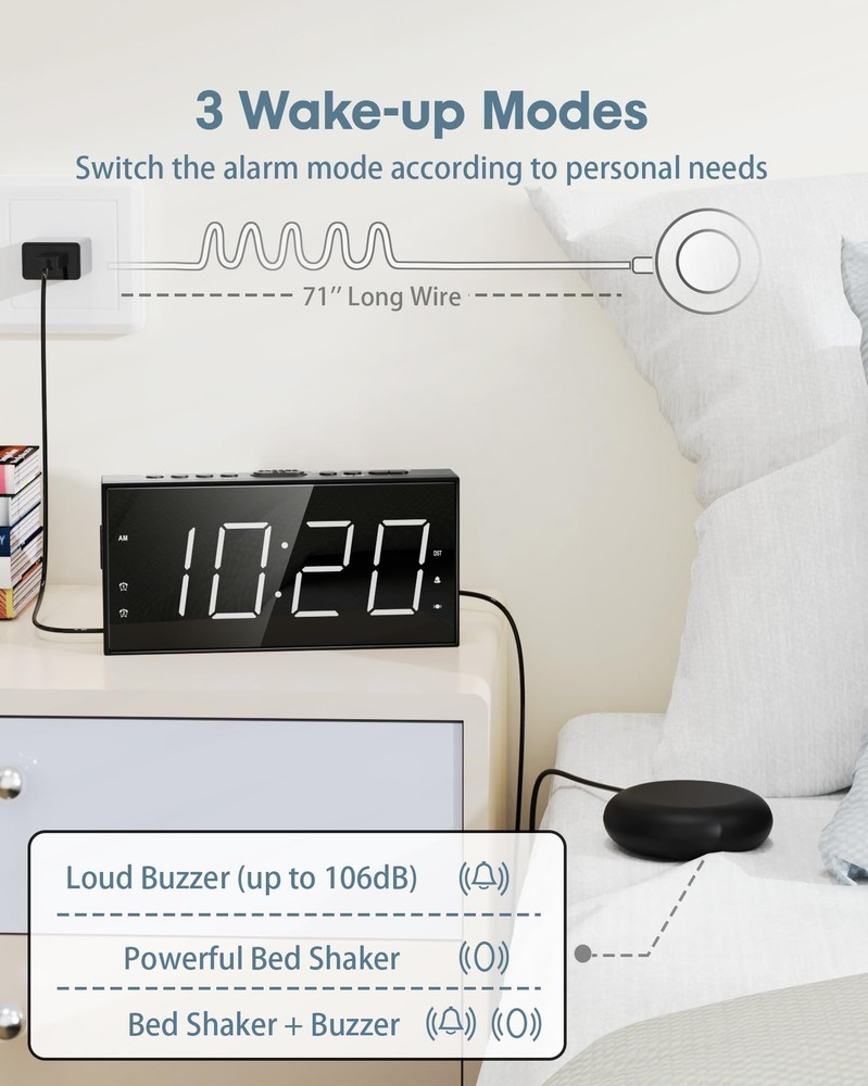 Loud Alarm Clock with Bed Shaker for Heavy Sleeper, Dual Vibrating Alarm Clock with USB Charger for Hard of Hearing/Deaf, 7.5โโ Large LED Display with Dimmer, Snooze, 12/24H & Battery Backup ๐ใEasy Wake by ๐ฆ๐๐ฟ๐ผ๐ป๐ด ๐๐ฒ๐ฑ ๐ฆ๐ต๐ฎ๐ธ๐ฒ๐ฟ & ๐๐ผ๐๐ฑ ๐๐๐๐๐ฒ๐ฟใ- Compared to the regular sound alarm clock, our ๐น๐ผ๐๐ฑ ๐ฎ๐น๐ฎ๐ฟ๐บ ๐ฐ๐น๐ผ๐ฐ๐ธ comes with 3 updated alarm modes: loud buzzer, super bed shaker or both sound and shaker, help you wake up easier on time. Simply press the "BUZZ/VIB" button to set your favorite wake-up method to meet different needs. Even for heavy sleepers, hearing impaired, loss or deaf , the bed shaker alarm clock is a perfect assistant for wake-up service. โฐใLong Wired Vibration Shaker & Adjustable Volumeใ- With 71โ long vibrator cord, the bed shaker can be placed under the pillow or mattress and produce a strong vibration to shake you awake without disturbing others. Besides, the sound volume of the ๐๐ถ๐ฏ๐ฟ๐ฎ๐๐ถ๐ป๐ด ๐ฎ๐น๐ฎ๐ฟ๐บ ๐ฐ๐น๐ผ๐ฐ๐ธ is 4-level adjustable to satisfy more needs. Combing the highest volume level and powerful bed shaker, you can be reliably waken up on time even for heavy sleeper. ๐ใDual Alarm Clock & Big Snooze Functionใ-The ๐ฑ๐๐ฎ๐น ๐ฎ๐น๐ฎ๐ฟ๐บ ๐ฐ๐น๐ผ๐ฐ๐ธ allows you to set two separated alarms easily especially handy for couples or roommates who keep different schedules. When the alarm goes off, lightly touch the big snooze button to turn off temporarily and enjoy extra 9-minutes sleep before alerting you again. You can also press the โALARM PAUSEโ or โALARM OFFโ to turn off the alarm for 24hours or permanently respectively. ๐ใ7.5โโ Large Display & 5 levels Brightness Dimmerใ-With 7.5โโ big LED display, the numbers on the ๐ฏ๐ฒ๐ฑ ๐๐ต๐ฎ๐ธ๐ฒ๐ฟ ๐ฎ๐น๐ฎ๐ฟ๐บ ๐ฐ๐น๐ผ๐ฐ๐ธ are ultra-clear to see even from a long distance or across the bedroom without glasses. The digital alarm clock also have 5-level adjustable screen brightness, you can set to the lowest level to avoid any light to bother your sleep or brighter level to easily view the time in the daytime. ๐ใElectric Powered with Battery Backupใ- The ๐ฑ๐ถ๐ด๐ถ๐๐ฎ๐น ๐ฎ๐น๐ฎ๐ฟ๐บ ๐ฐ๐น๐ผ๐ฐ๐ธ needs to be plug into the AC power with the included adapter for working. 2pcs AAA backup batteries (NOT Included) are just used to memorize time and alarm settings when encountering power outage. During the backup battery, the screen will go blank but the alarm will still be triggered. ๐ฑใUSB Charger Port Design & 12/24H Formatใ- The ๐ฎ๐น๐ฎ๐ฟ๐บ ๐ฐ๐น๐ผ๐ฐ๐ธ ๐๐ถ๐๐ต ๐จ๐ฆ๐ ๐ฐ๐ต๐ฎ๐ฟ๐ด๐ฒ๐ฟ port (5V/1A) provides the convenience for charging your phone or other device safely while you sleep. The 12/24H format and DST function are also available by pressing the corresponding buttons. ๐ใEasy to Operate & Wide Applicationใ- With the intuitive setting buttons, the ๐ฎ๐น๐ฎ๐ฟ๐บ ๐ฐ๐น๐ผ๐ฐ๐ธ ๐ณ๐ผ๐ฟ ๐ต๐ฒ๐ฎ๐๐ ๐๐น๐ฒ๐ฒ๐ฝ๐ฒ๐ฟ is easy to use even for kids or elders. Updated features such as vibration, dual alarm, dimmer, USB charging port and stylish appearance, the bedroom alarm clock can be as a perfect choice for your family, friends, kids and also for home decoration. Loud Alarm Clock with Bed Shaker - Wake up by bed shaker or alarm sound or both: Our digital alarm clock which comes with a detachable bed shaker can provide 3 wake-up modes for us to choose: powerful vibration shaker, loud buzzer or both. Simply press the โBUZZ/VIBโ button on the side repeatedly to change modes as your preferences and needs. -No matter which modes you choose, the icons which show sound or shaker will show clearly on the screen interface -Place the bed shaker under the mattress or pillow and let it shake you awake without disturbing others, especially helpful for heavy sleeper, hearing loss, hearing impaired, deaf, hard of hearing. - The Alarm volume is also adjustable by pressing the โVOL+/VOL-โ button on the side. Ultra-large 7.5โ Display with Adjustable Brightness - With the 7.5โโ LED display, the digital number is clear enough to view from across the bedroom even for people who has a poor eyesight -The digital alarm clock has 5 levels dimmer function. You can adjust the brightness according to the sleeping environment or personal preference Dual Alarm Clock & Snooze Function - Custom record your own alarm with the dual alarm features, you can set the dual separate alarms to accompany different schedule and choose wake-up modes. -Easily press the big SNOOZE for 9 extra minutes of sleep when alarm goes off USB Ports Design & Battery Backup - USB charging port makes it convenient for you to charge smartphone safely. -2 pcs AAA backup batteries (NOT Include) will help maintain the alarm and time in case of power outagesettings. SPECIFICATION: Display: 7.5'' LED Display Snooze Duration: 9 Minutes Alarm Sound: Vibration or Buzzer or Vibration & Buzzer USB Charging Port: 5V, 1A Screen Display Dimmer: 5 Leves AC Adapter Input: AC 100-240V Time Format: 12/24 Hour Backup Battery: 1.5V AAA Battery x 2 (Not include) SHIPPING Domestic Buyers - We have confidence in our products, but if you are not fully satisfied please contact us within 30 days of purchase and you will get full refund. - We ship within 3 business days of payment, usually sooner - We offer FREE shipping on all orders! - We only ship to the lower 48 states, no APO/FPO addresses or PO Boxes allowed International buyers โ please note: Import duties, taxes
