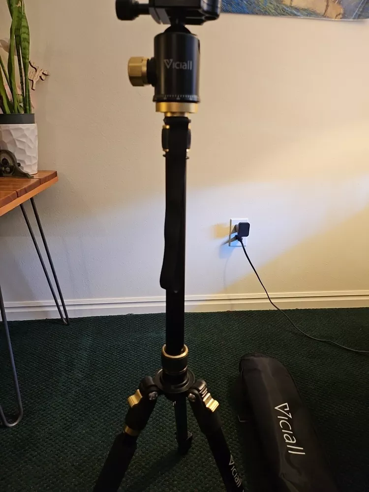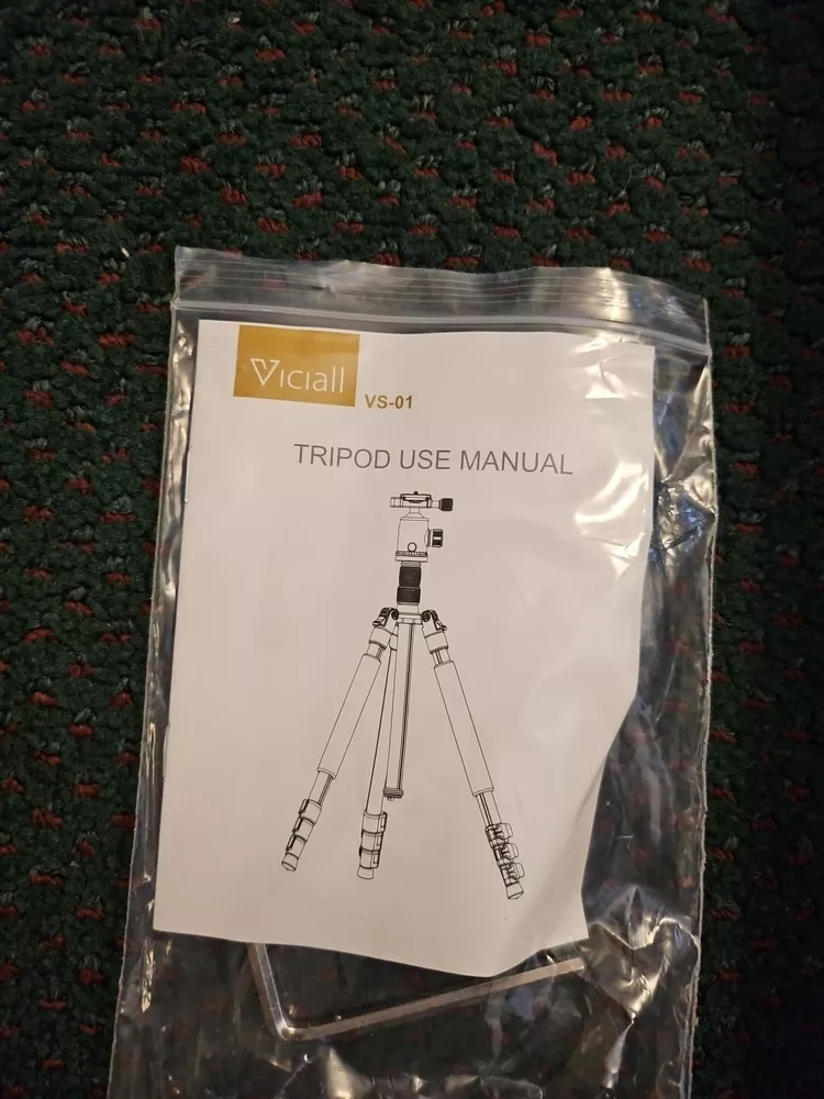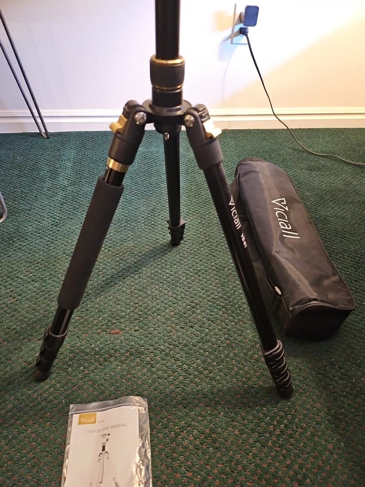 The Viciall Camera Tripod is a universal tripod designed for cameras. It features aluminum construction, adjustable legs, a ball head, 360 degree rotation, flip lock, quick release, and a leveling indicator. The tripod also includes a case for easy storage and transportation. It is foldable and has leg angle adjustment for versatile positioning while capturing photos or videos. BRAND NEW